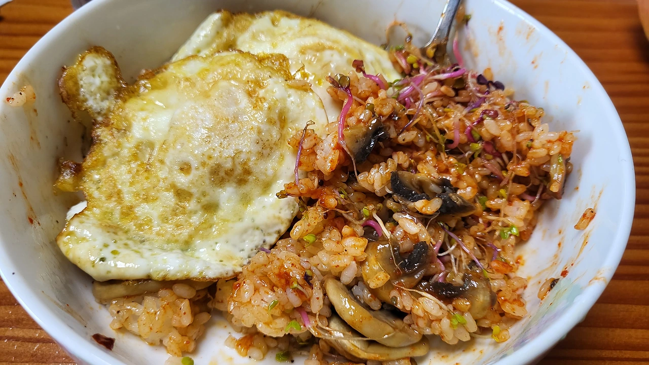 지난번에 사놓은 버섯과 새싹이 있어서 그냥 고추장에 사~악 비벼봤다. 계란과 함께