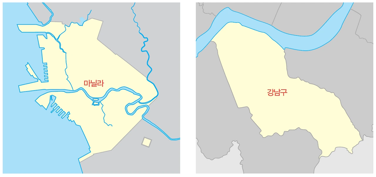 충칭이 광활한 면적으로 세계 최대의 도시라는 오해를 샀다면, 반대로 매우 큰 도시권을 형성하고 있음에도 좁은 행정구역으로 소도시 취급을 받는 곳도 있다. 바로 필리핀의 수도 마닐라다. 마닐라는 고작 178만 명이 사는 도시로, 1억 인구 필리핀의 위엄이 초라해지는 성적이다. 하지만 지도에서 마닐라를 검색해보면 아주 작은 구역 하나만이 나올 뿐이다. 인구 따지기 이전에 고작 38.55㎢라는 도시 면적에 놀란다. 겨우 서울의 강남구 면적(39.5㎢) 정도에 불과하다*.