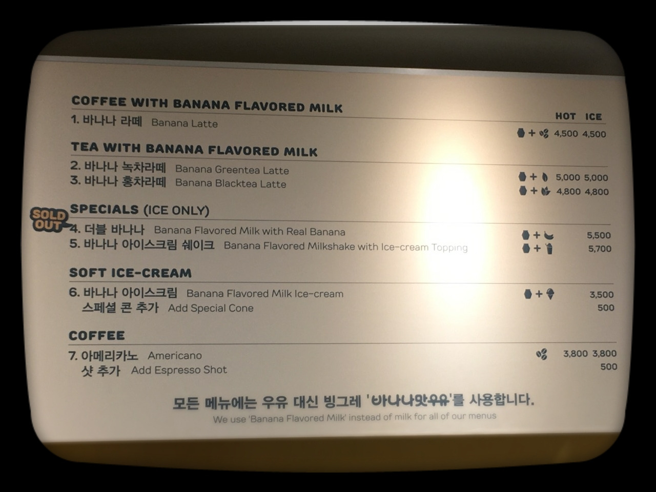 이 곳에서는 바나나 우유로만 음료를 제작한다. 예외는 아메리카노뿐이다.