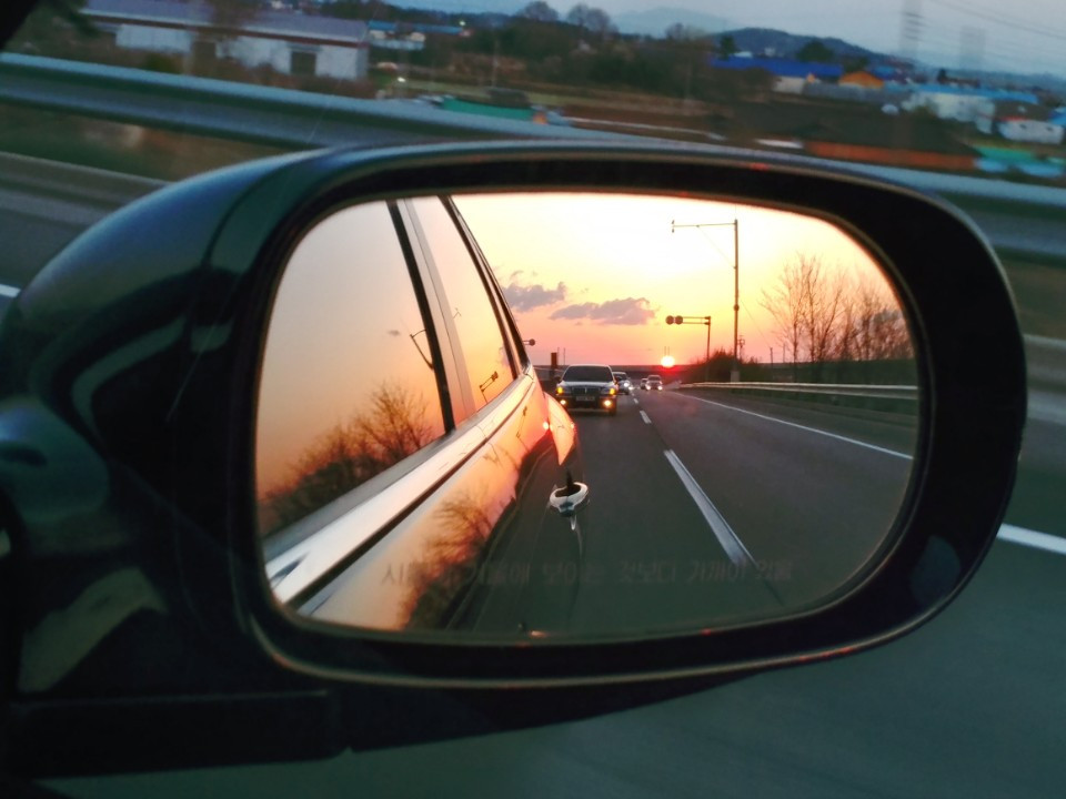 노을이 지는 모습을 사이드 미러로