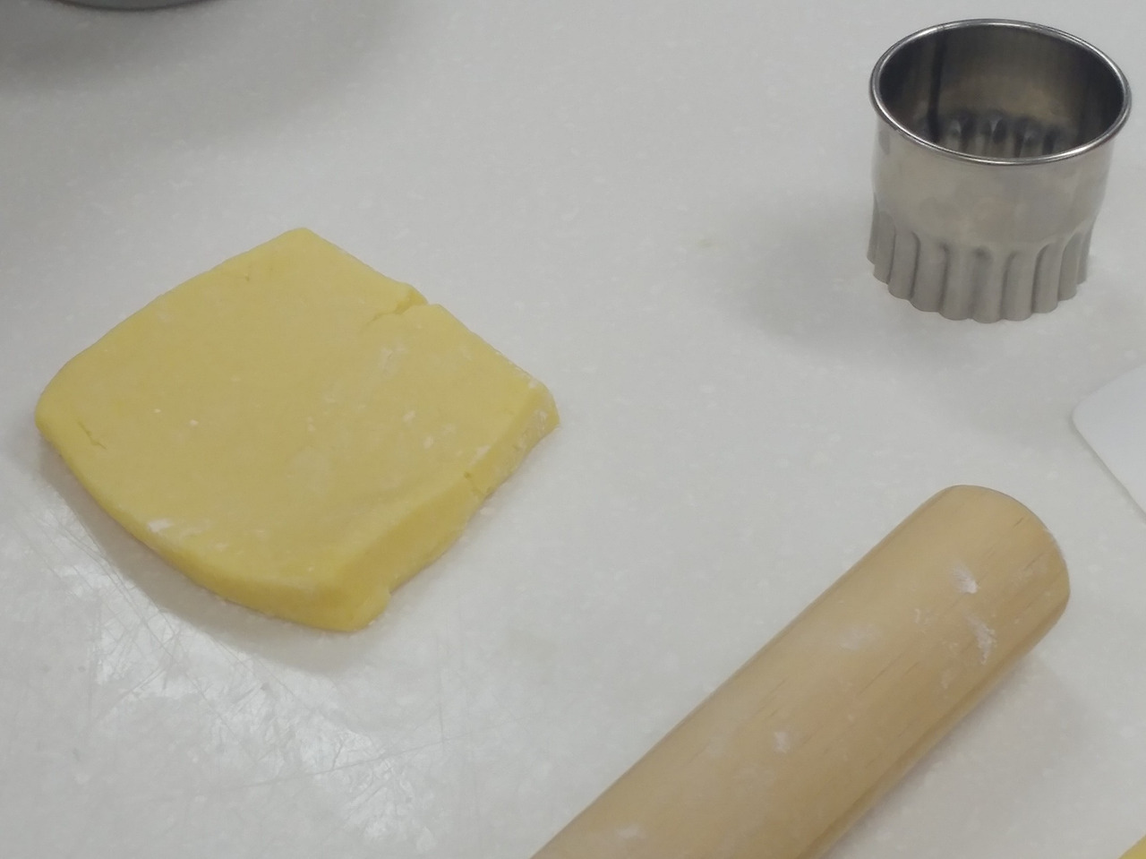 5의 반죽을 냉장고에서 꺼내 쿠키 틀로 모양을 찍어냅니다. 이때는 밀대로 밀어주면서 작업을 해요. 밀대로 반죽을 바로 밀 경우 반죽이 밀대에 붙기 때문에 소량의 밀가루를 뿌려주며 작업을 합니다. 최대한 손이 반죽에 닿지 않아야 해요. 손으로 반죽을 자꾸 만지면 손의 온도 때문에 반죽에 포함된 유지가 녹을 수 있어요.