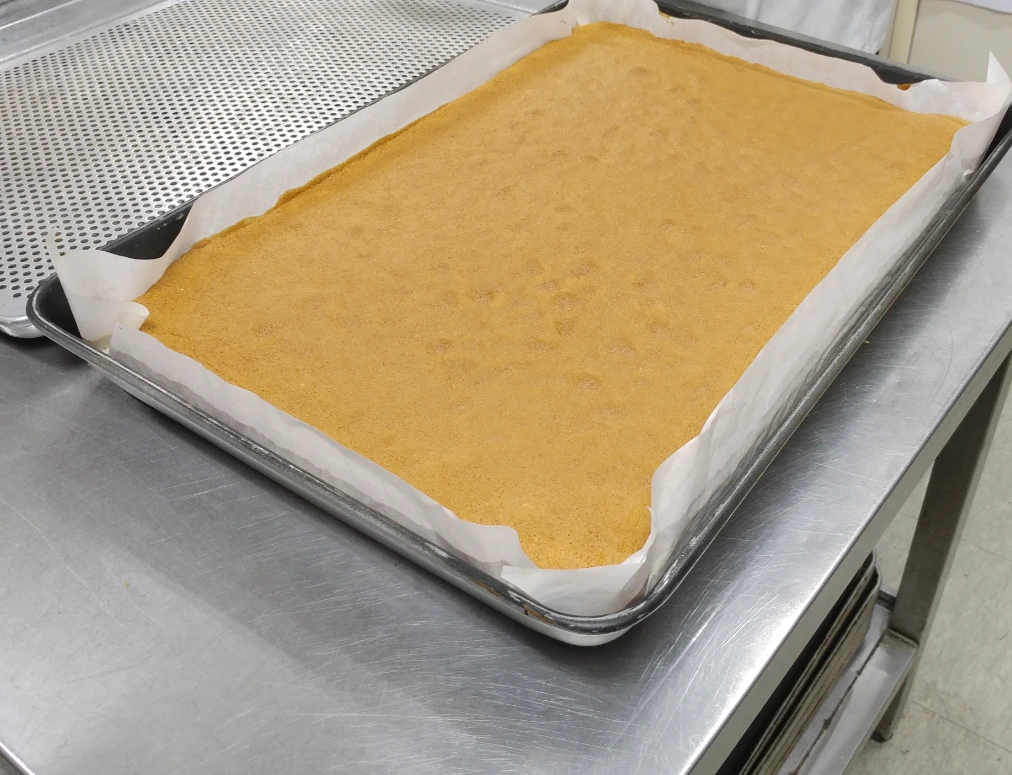 3의 반죽을 팬닝 합니다. 팬닝 할 때 주의할 점은 반죽이 팬에 고르게 퍼지도록 해야 한다는 거예요.