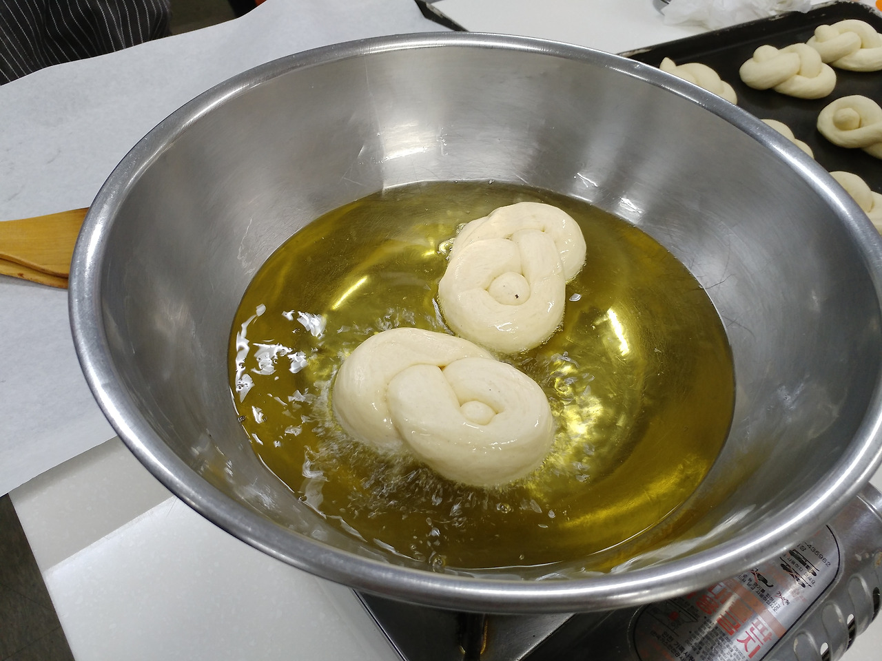 사진을 보면 가운데에 흰 선이 보이는데 반죽의 윗면과 아랫면을 고르게 뒤집어서 튀기게 되면 저런 흰 선이 생기게 돼요. 제빵 시험을 보실 때는 저 흰 선을 만드시는 것도 잊지 말고 해주세요.