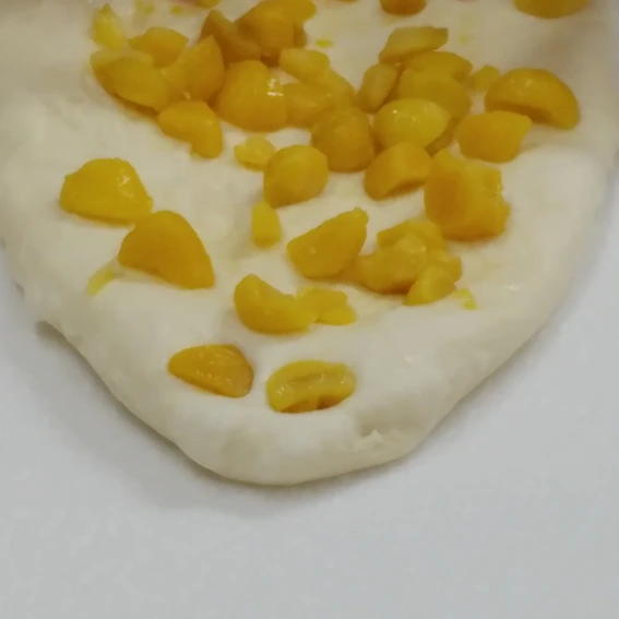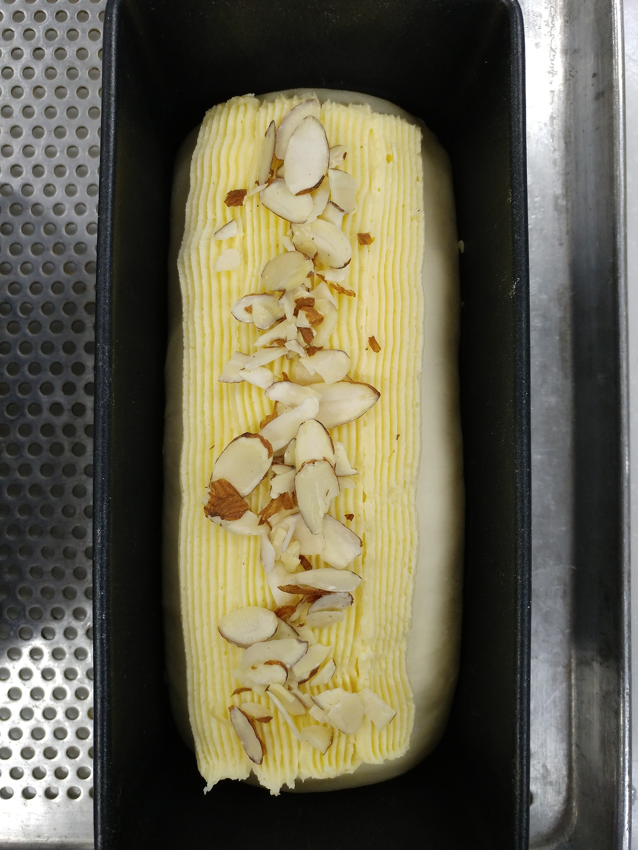 6의 2차 발효된 반죽 위에 7에서 준비한 토핑을 얹어 주세요. 짤주머니를 이용하여 반죽 위에 고르게 토핑을 올리고, 아몬드 슬라이스를 토핑 위에 고르게 뿌려줍니다.