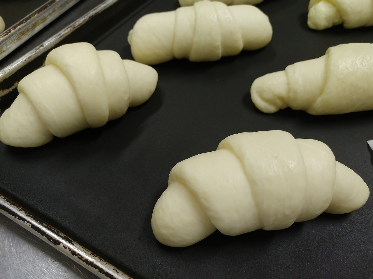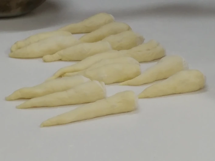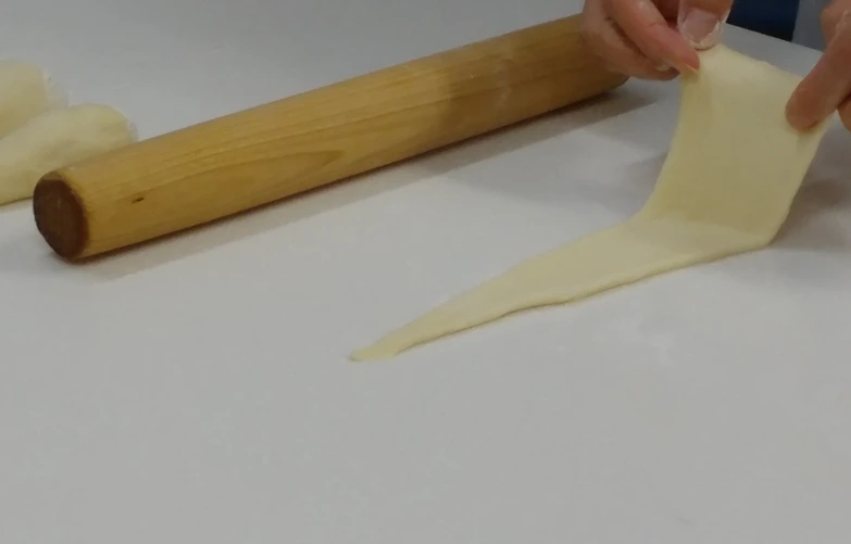 동그랗게 중간 발효된 반죽을 손바닥을 이용해서 1차로 펴 주시고, 2차로 밀대로 밀어서 펴 주세요. 이때 모양이 긴 삼각형의 모양이 되도록 펼쳐줘야 합니다. 이렇게 펼쳐진 반죽을 삼각형의 밑변에서부터 돌돌 말아주는 형식으로 모양을 잡아주세요.