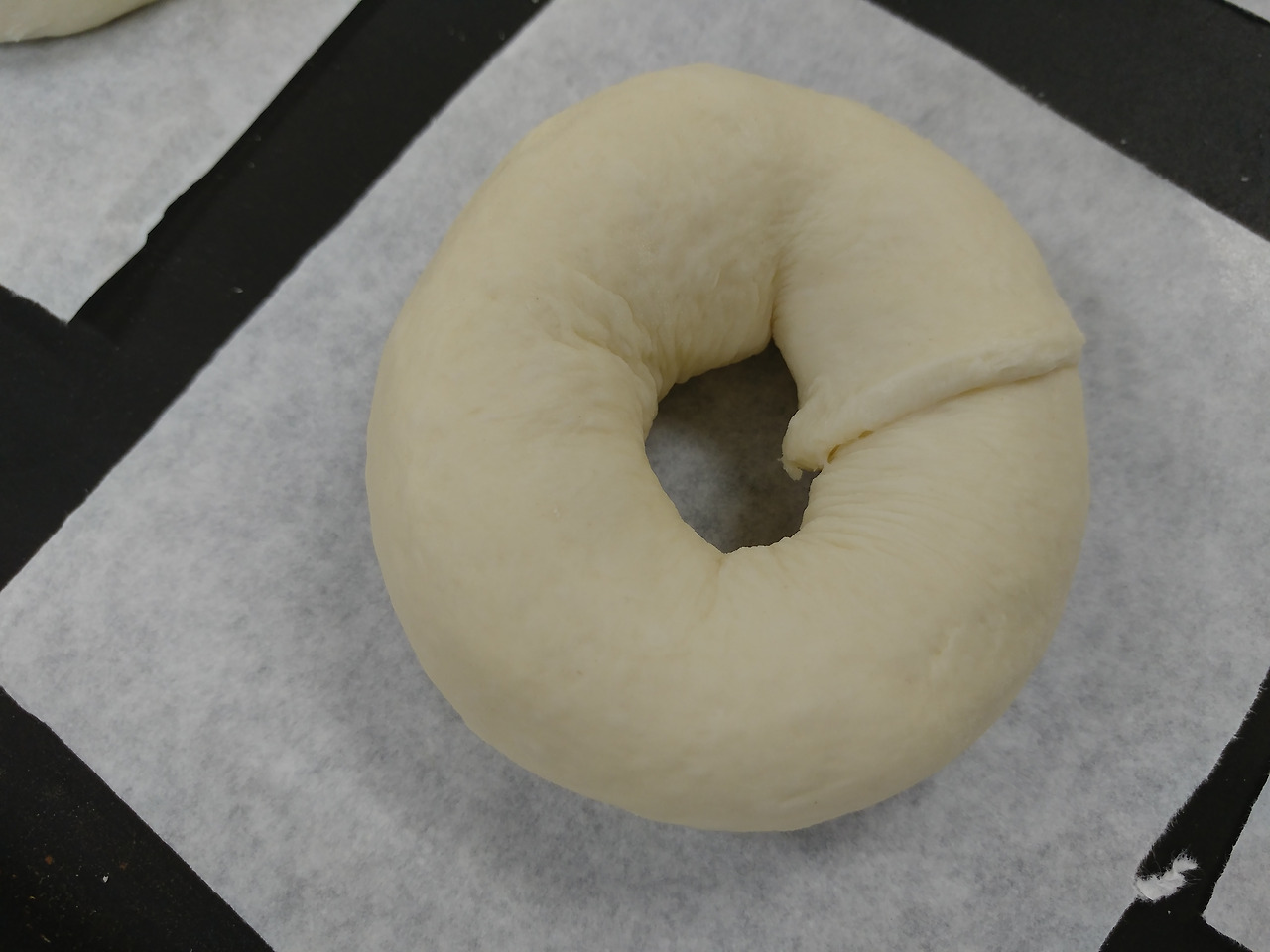 4의 반죽을 밀대로 밀어주세요. 이를 뒤집어서 종 모양을 만들고 잘 말아서 기다랗게 만들어주세요. 이어서 이 반죽을 도넛 모양으로 만들어주면 됩니다. 완성한 베이글은 철판 위에 그대로 팬닝 하지 말고 사진처럼 각각의 반죽 아래 종이 한 장씩을 깔아주세요. 베이글은 끓는 물에 데치는 과정이 있는데 이때 모양의 손실 없이 빵을 데치기 위한 과정이에요.