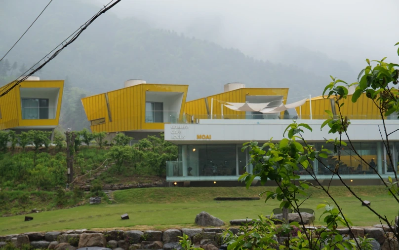 가평에 있는 아침 고요 수목원을 향해 가던 길이었다. 차가 막혀서 주위를 둘러보는데, 정말 독특하게 생긴 노란색 건물이 보였다.