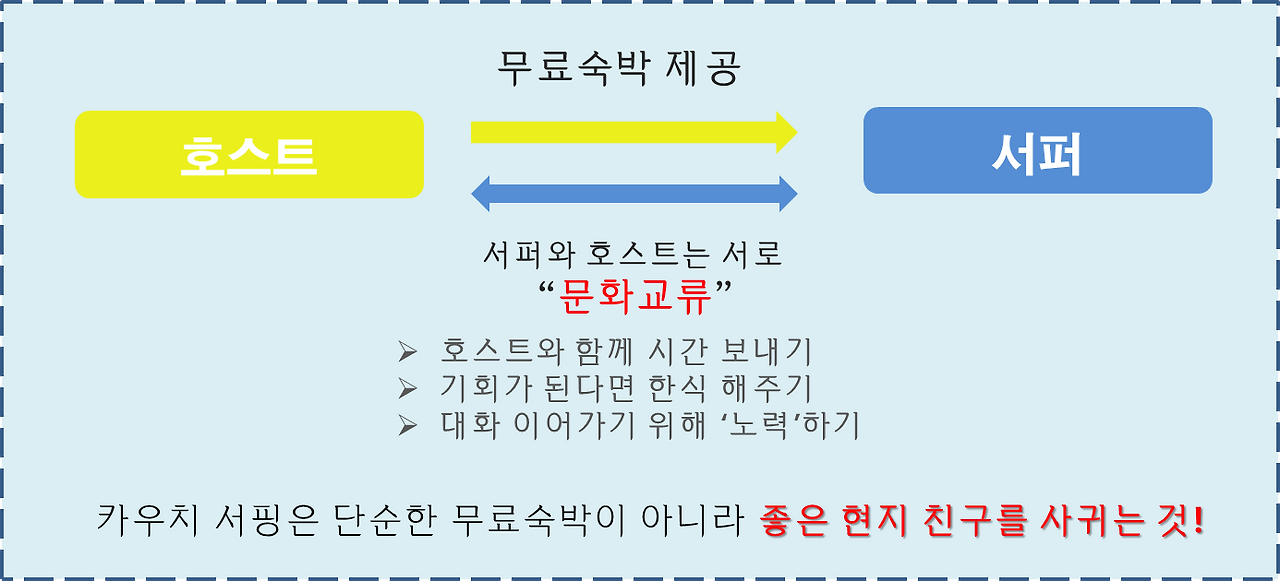 따라서 서퍼는 호스트의 집을 단순히 무료로 묵을수 있는 호스텔 쯤으로 인식해서는 절대 안 된다. 문화교류 같은 단어를 사용해 거창해보이지만 쉽게 말해 좋은 현지인 친구를 만들 수 있는 기회라고 생각하면 된다. 호스트와 좋은 친구가 되기 위해 서퍼는 호스트와 함께 시간을 보내며 서로의 문화를, 자신의 여행을 공유하려는 태도를 가져야 한다.