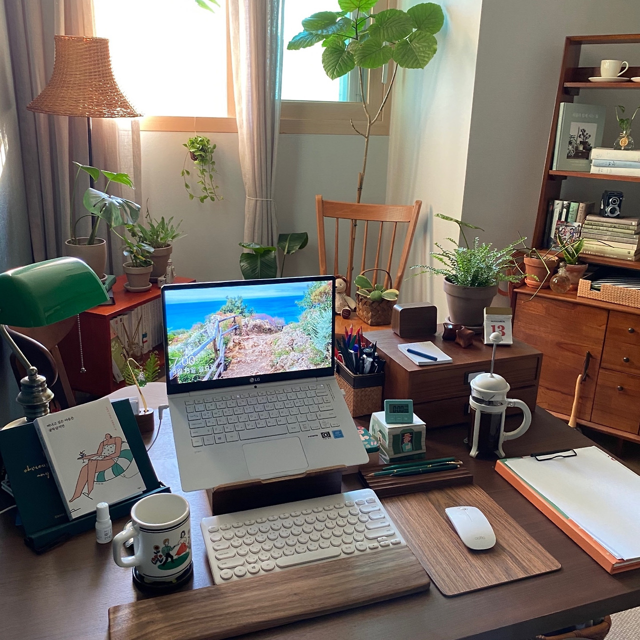 책상에 앉아서 일하는 시간이 긴 책상 생활자 이건만, 빗자루를 꺼내야 비로소 책상 위 구석구석을 둘러보게 된다. 한결 같이 내 손목의 무게를 받혀주는 팜레스트나 늘 머그잔을 올려 두는 컵 받침 등을 덜어내고 책상을 쓸고 닦은 후 다시 제 자리에 질서 정연하게 놓는다. 때로는 물건들을 재 배치해 분위기를 바꿔 보기도 한다. 그러니까 빗자루로 책상을 쓴다는 것은 책상의 질서 재정비한다는 의미가 있다.