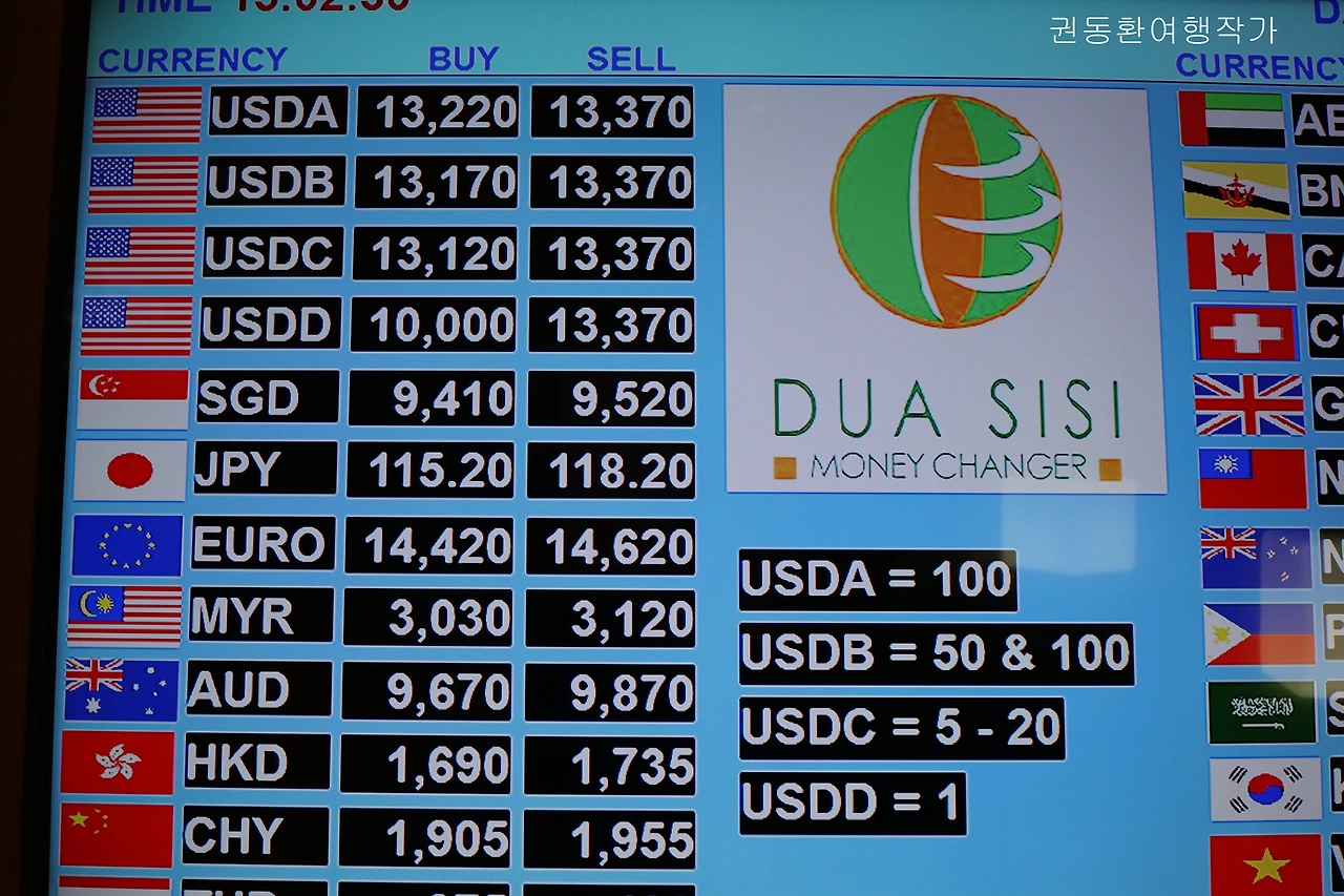 덧붙여 지갑에 의해 구겨진 미화 100달러는 보존이 잘 된 미화 50달러와 같은 B등급으로 환전이 된다고 했다. 그때까지만 해도 인도네시아의 환전 체계를 환전소에서 벌이는 사기라고 생각할 수밖에 없었기에 직원과 꽤나 긴 말다툼을 했지만 뒤에 있던 한 여성 덕분에 그곳에서 빠져나올 수 있었다. 그녀는 인도네시아 정부에서는 루피아의 가치 하락을 막기 위해서 자국 내에서 외국 통화 사용을 금지하고 모든 거래를 루피아로만 사용해야 하기 때문에 외국인에게는 불리한 환전이 늘 있는 일이라고 했다.