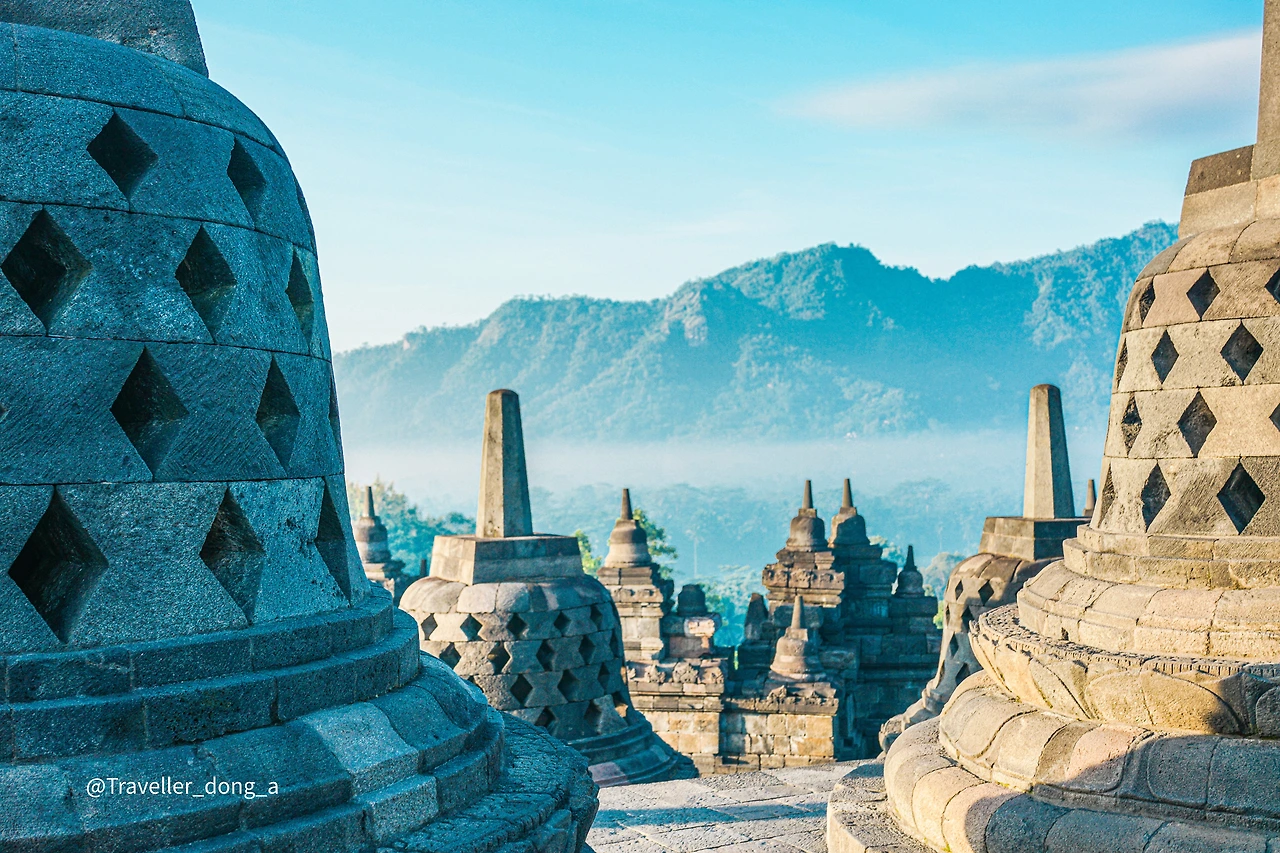 이른 새벽부터 오토바이를 타고 향하는 곳은 족자카르타의 보로부두르이다. 풴디의 추천으로 결심한 족자카르타 여행의 이유 9할은 이 보로부두르 사원이었다. 둥근 종 모양의 스투파 속에 단아하게 가부좌를 맺고 앉아 계시는 부처님을 SNS를 통해 봤기 때문이다. 2억 5000만 명에 달하는 인구의 대부분이 이슬람을 믿는 무슬림 국가인데 불교 유적지라.. 하루 다섯 번의 예배와 기도를 무슬림 속에서 피어난 불교문화에 대한 호기심이 생길 수밖에 없었다.