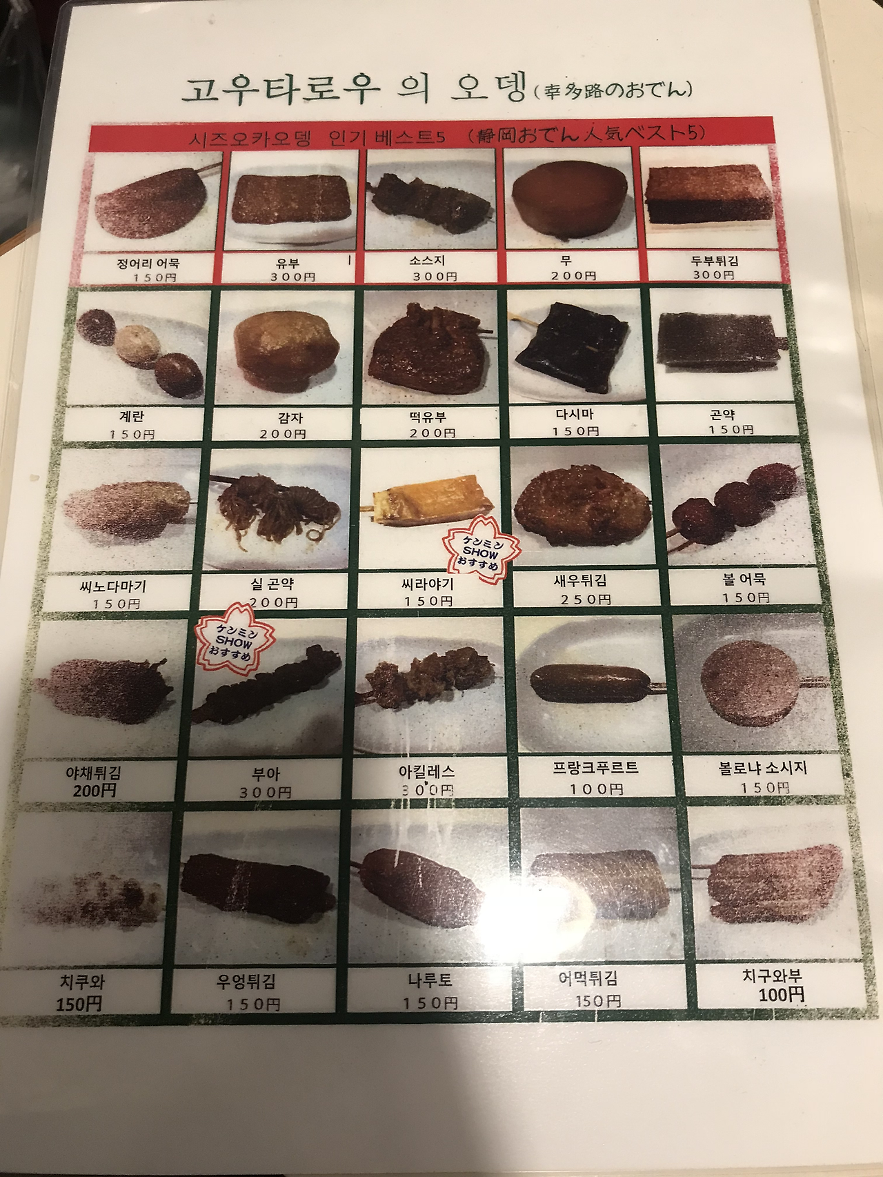 소의 힘줄인 규스지를 푹 고아 만든 검은 국물에 담가져 있던 시즈오카의 명물 검은 어묵, 나는 오뎅보다 물렁물렁한 무가 더 맛있어서 무를 추가로 먹기도 했었다. 직장일로 스트레스를 받은 직장인들이 이곳의 푸근하고 따뜻한 인심을 만나 저절로 스트레스도 해소될 것 같은 곳, 마치 우리가 스트레스받으면 치맥을 먹듯 이들도 오뎅바를 찾을 것만 같았다. 일본어를 다시 열심히 공부해서 일본어 패치 장착하고 꼭 다시 방문하고 싶은 곳이었다.