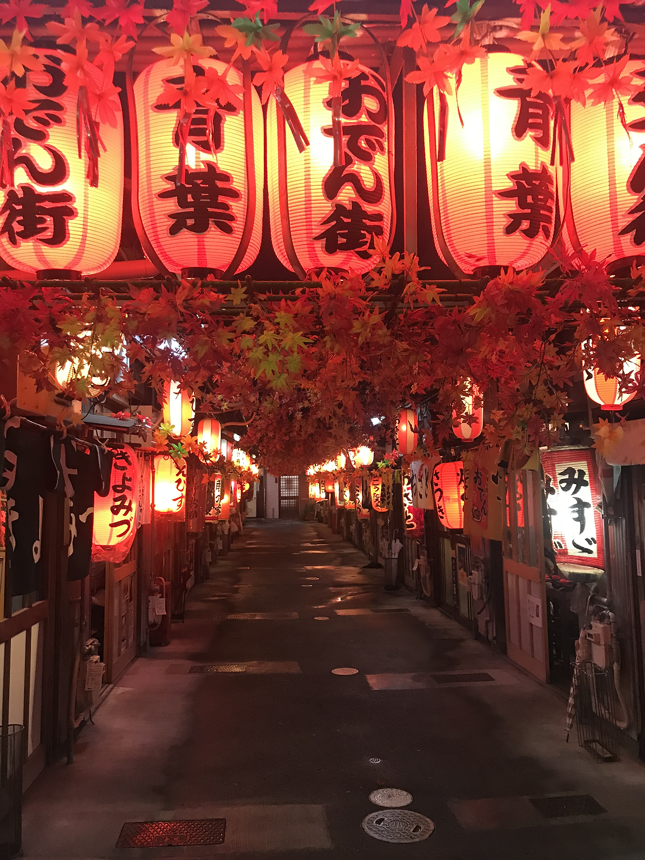 울긋불긋한 단풍잎들이 꾸며져 있었고, 은은한 조명이 비추었다. 아오바오뎅거리에 오뎅바들이 양쪽에 줄지어 있었다. 오뎅바들이 많아서 걸으면서 어떤 오뎅바를 들어가는 게 좋을지 행복한 고민이었다. 그중에서 한 곳을 택해서 들어갔는데 인심이 푸근해 보이는 주인장이 미소를 띠며 서 있었다. 문을 열고 들어서는 순간 정말이지 잘한 선택인 것 같다는 생각이 들었다. 정감 있는 주인장이 어서 오라고 말을 걸어왔다. 한쪽 구석에 앉아서 메뉴를 쭉 스캔했고, 진열되어있는 오뎅을 봤다. 왁자지껄 삼삼오오 손님들로 가게 안은 조용할 틈이 없었다. 꽤나 맛있어 보였던 검은오뎅, 물렁물렁 무, 그리고 빠질 수 없는 술을 주문했다. 혼자 여행 온 내 모습을 본 주인장과 손님들은 내가 궁금했었나 보다. 내게 말을 걸어왔었다.