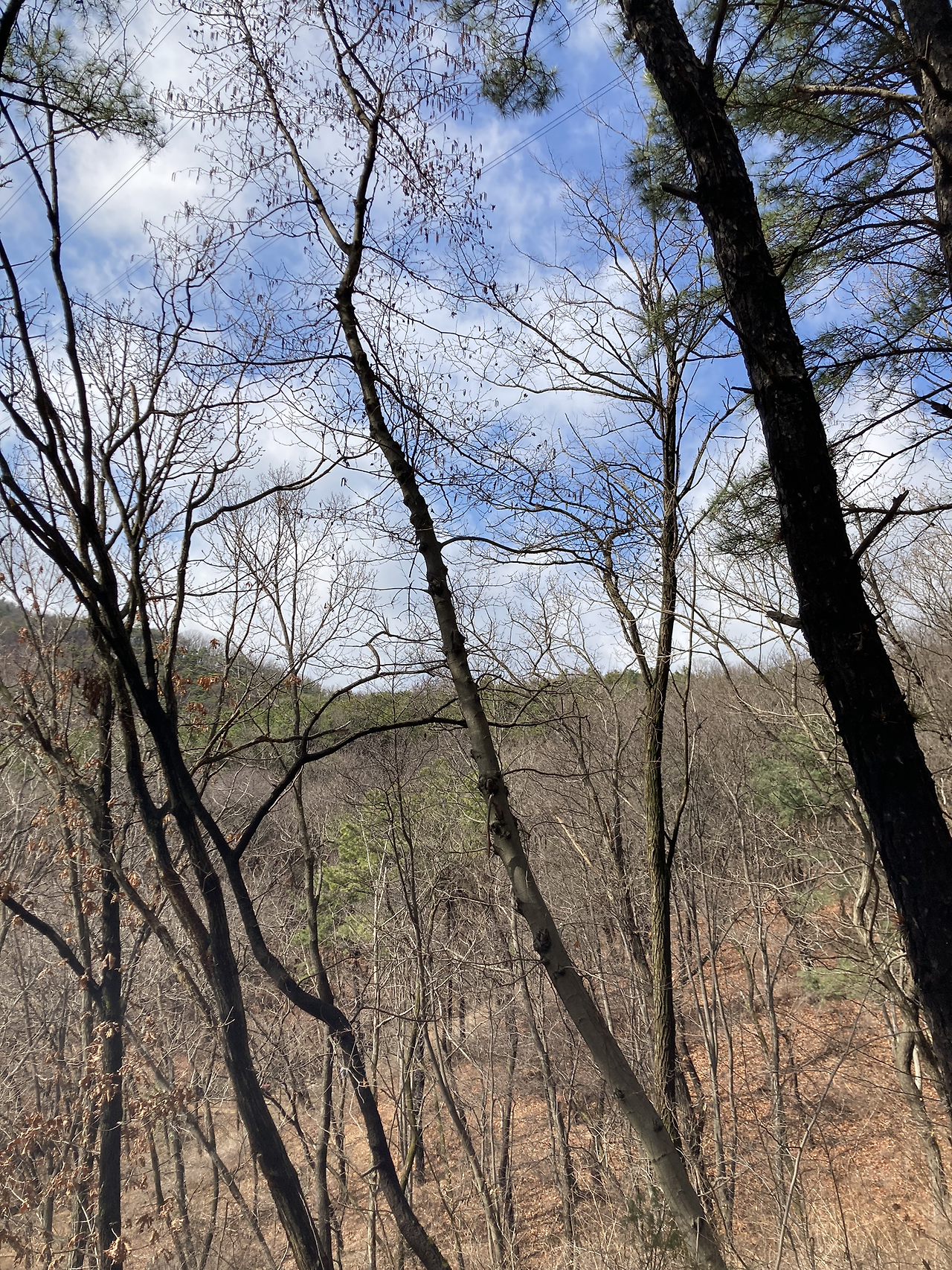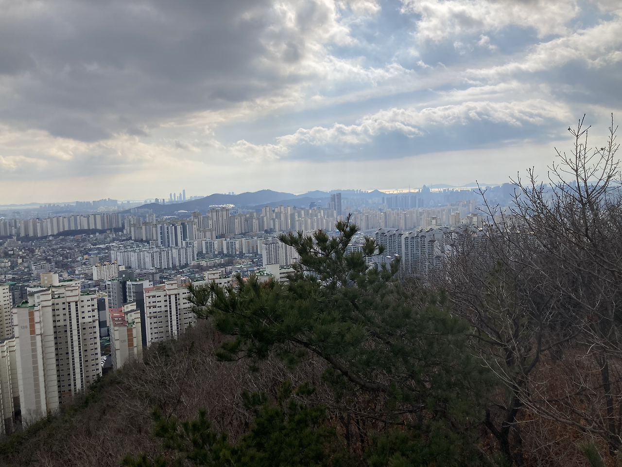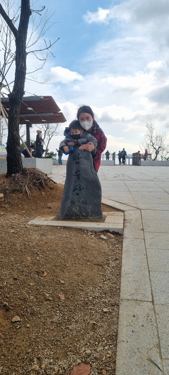 목표 달성? 성취감? 이런 거 때문인지 모르겠다. 등산을 시작하면 내 안에 샘솟는 이런 거 때문에 중간에 내려오는 법이 없었다. 너무 힘들어도 일단 산을 오르기 시작하면 항상 정상을 올라가야 직성이 풀리곤 했다. 이날도 예외는 없었다. 남편이 등 뒤에서 그만 내려가자 하는 소리가 들렸지만 아랑곳하지 않았다. 아이를 둘러업고 정상을 올랐다. 곧이어 남편도 따라 올랐다. 날씨가 좋아서인지 저 멀리 인천대교도 보였고, 남동타워도 보였다. 가볍게 정상에서의 인증숏도 남겼다.