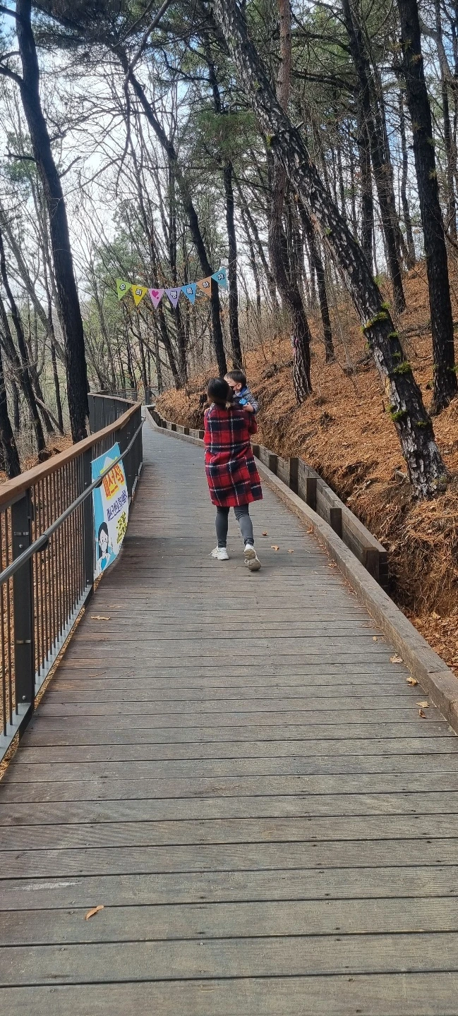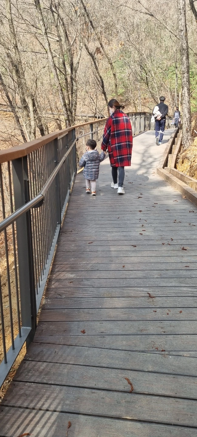무장애 나눔길이라는 말답게 남녀노소 누구랄 것 없이 이 길을 걷고 있었다. 우리 아들 녀석도 내 손을 잡고, 또는 남편 손을 잡고 아장아장 잘 걷는 듯싶었으나 조금 걷다 지쳤는지 안아달라고 난리도 아니었다. 저 멀리 유모차 끌면서 가고 있는 아이 엄마 아빠들을 보며 부럽기도 했고, 아이가 타지 않더라도 우리도 유모차를 가져와볼걸 그랬나 아쉽기도 했다. 등산에는 영 재미를 못 보는 남편은 본인의 몸만으로도 너무 힘들어했다. 어쩔 수 없이 아들 녀석은 고스란히 내 몫이었다. 안아서 올랐다가 힘들면 잠시 걸어가라고 하고 내려놓고는 다시 안아 올리기 일쑤였다. 잠시 내려놓으면 요즘 취미인 나뭇잎 줍기에 여념이 없는 아들 녀석. 벌써부터 열심히 청소하고 주변을 깨끗하게 하려는 아들 녀석을 보고 있자니 대견했다.