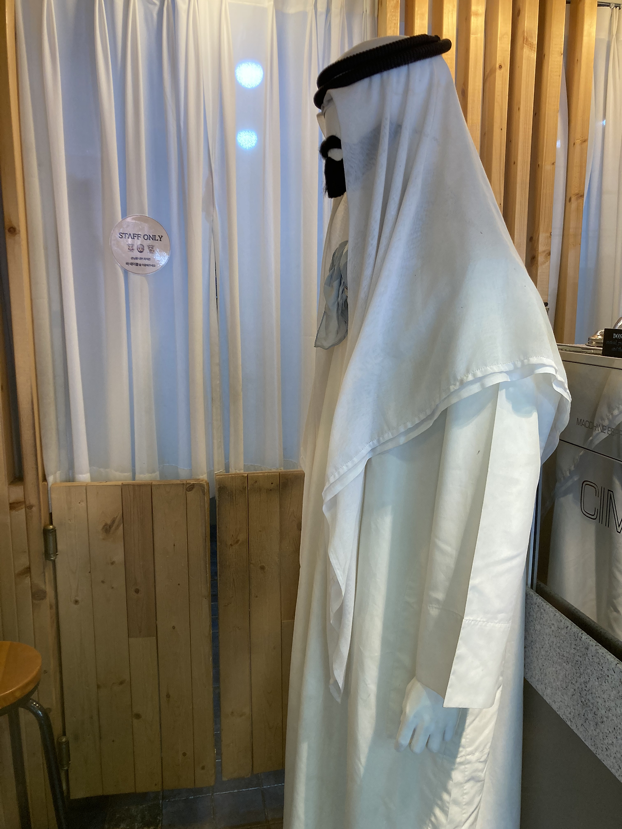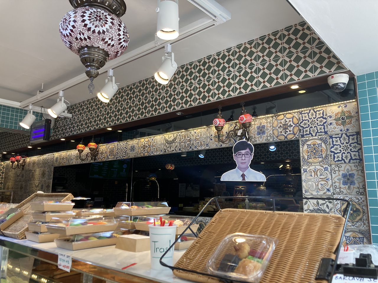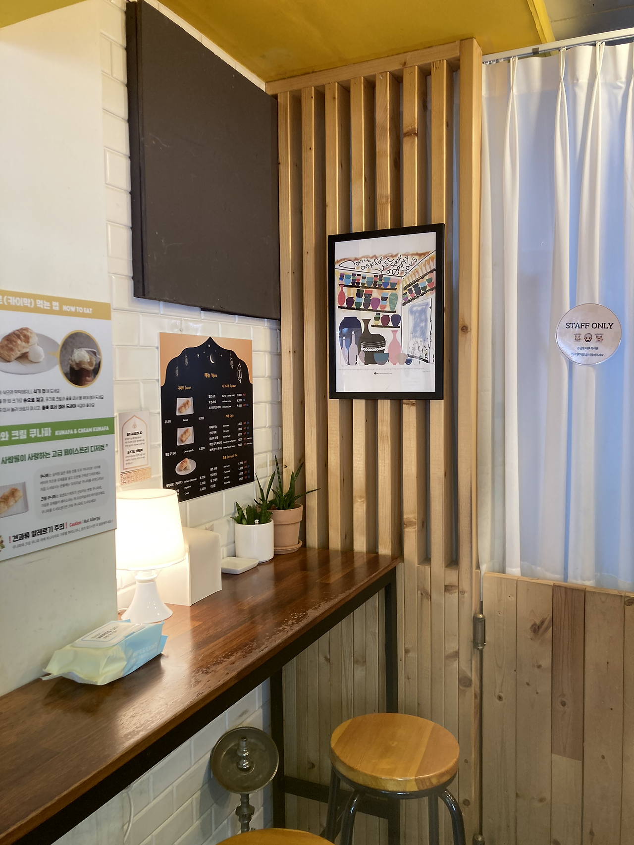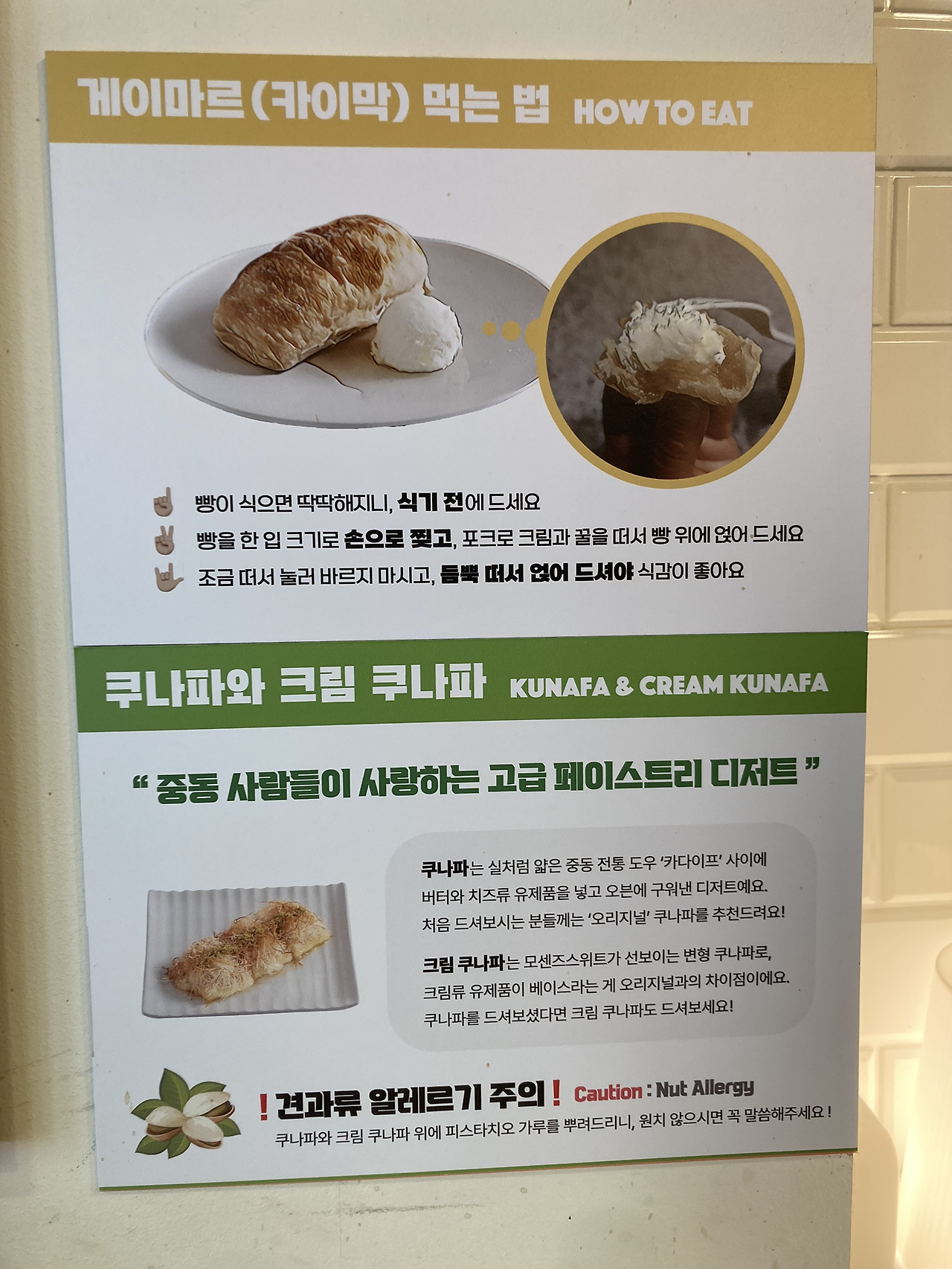 홍대입구와 상수역 사이 홍대입구역 메인 거리에 있는 카페였다. “장소가 협소하고, 대기줄이 길다”는 정보를 입수하고 갔었는데 내가 운이 참 좋았는지 찾아갔을 때 대기하지 않고, 바로 주문해서 맛볼 수 있었다. 중동으로 여행을 간 듯 중동국가의 옷차림을 한 마네킹이 좁은 카페 내부에 서있었다. 음식이 나오면 픽업해가야 했는데, 먼저 “카이막 처음 드시나요?”라고 물어본 후 처음이라고 하는 사람들마다 일일이 먹는 방법에 대해 설명해주었다. 참 친절했다.