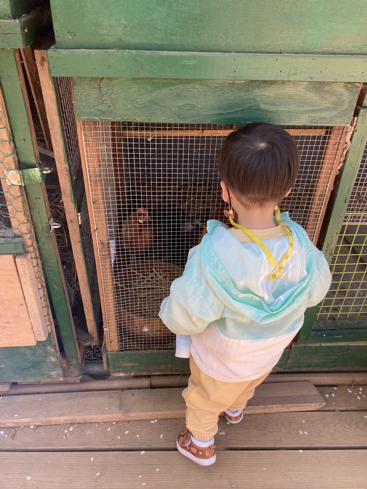 카페의 야외무대에서 연극이 진행되고 있었지만, 자유로운 영혼인 우리 아들 녀석은 연극에는 전혀 관심이 없었고, 여기저기 돌아다니며 탐색을 했다. 제일 먼저 닭장을 구경했다. 닭장 안에 있는 닭에 관심을 갖다가 닭이 "꼬끼오" 하고 울자 무서워서 도망을 갔던 아들 녀석이었다. 그래도 꿋꿋이 닭에게 다가갔던 아들 녀석. 닭이 무섭지만, 친해지고 싶었나 보다. 닭에게 먹이를 줘보라고 거기 마련되어 있던 먹이를 집어 아이 손가락에 쥐어주었으나 아이는 거부했다. 그래, 우리 천천히 친해지자.
