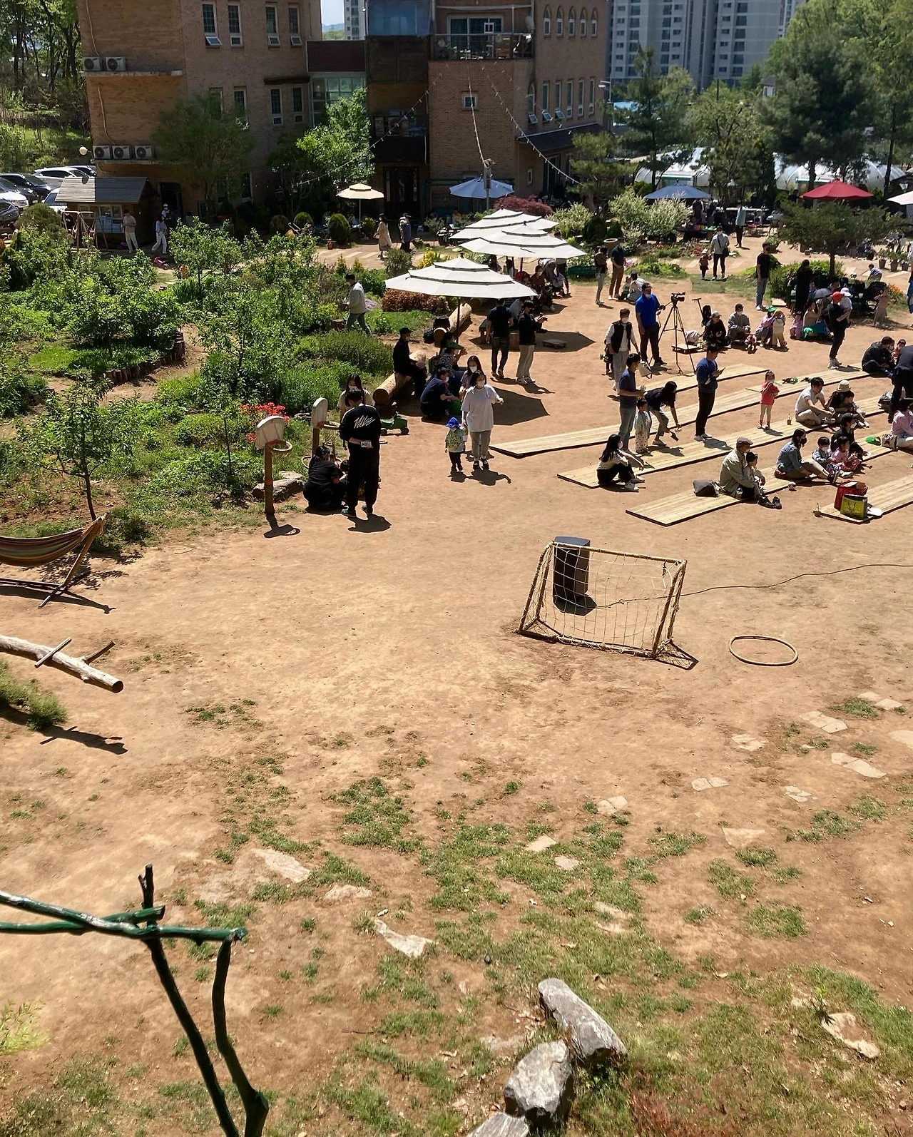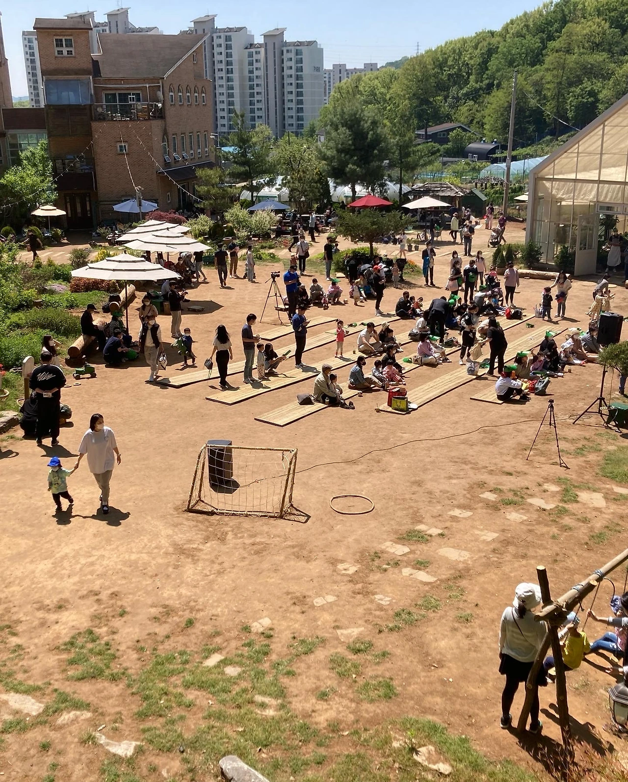 이 한마디가 여러 가지 후보군중에 반디 세상으로 여행지를 결정하는데 큰 역할을 했다. 집에서 차로 20분 정도의 거리, '사람이 많으면 얼마나 많겠어?' 이 생각은 참 오만하고, 안일한 생각이었다. 일찍 준비하고 길을 나선다고 나섰는데 멀리서부터 길게 늘어서 있던 차들과 카페 주차장의 만차 소식. 결국 남편은 주차장이 아닌 근처 다른 곳에 차를 댄다고 나와 아이를 카페 앞에 내려주고 길을 떠났다. 카페 앞에도 사람들로 줄이 길게 늘어서 있었다. 이렇게나 많을 줄이야. 어린이날을 맞아 카페에서 다양한 어린이날 행사를 준비했단다. 이럴 줄 알았으면 더 일찍 오는 건데 싶었다. 짧고 긴 기다림 끝에 아이와 함께 입장할 수 있었다. 이곳이 마음에 들었던 건 입장료가 있었지만, 다른 카페와는 다르게 1인 1 음료를 주문해야 되는 의무가 없었다. 우리 아이는 음료수를 좋아하지 않아서 1인 1 음료를 적용하면 음료수를 어떤 걸 주문해야 되나 난감한 상황이 많은데 여긴 음료 주문이 필수가 아니라서 마음에 들었다. 입장료도 비싸지 않았고, 음료가 필수가 아닌 선택이라 좋았던 것 같다. 아이와 마당에서 놀고 있으니 곧이어 남편이 들어왔다. 차를 주차할 곳이 없어서 저 멀리 주차하고 왔다고 했다.