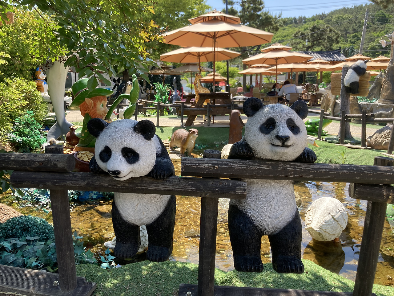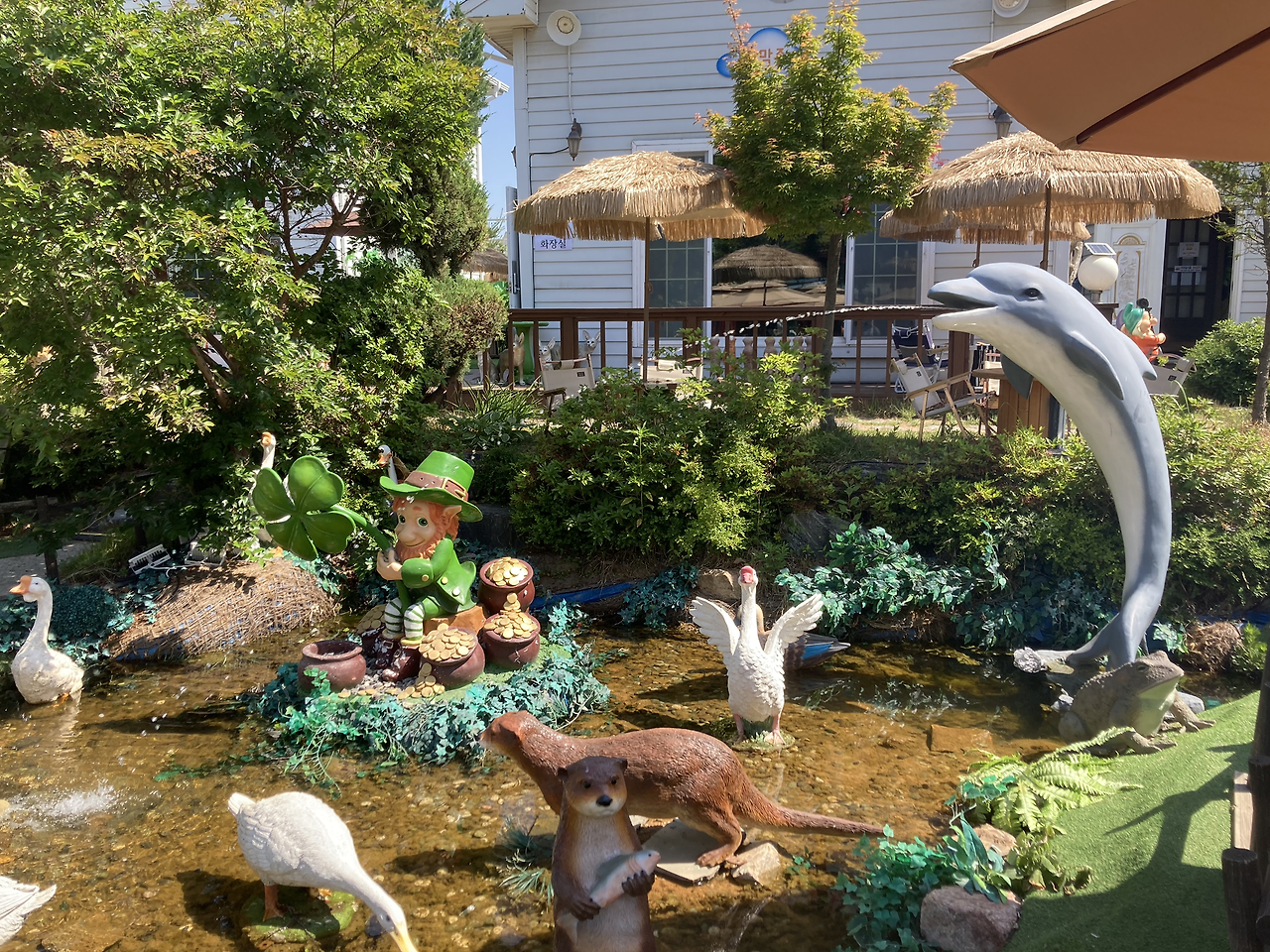 몬몬이야 카페는 입장료가 없는 대신 무조건 1인 1 음료이다. 심지어 아이조차도 음료를 마셔야 한다는 게 이 카페의 규칙이라면 규칙이었다. 음료수를 잘 마시지 않는 우리 아이의 경우에는 어떤 걸 시켜야 할지 난감했다. 아이의 음료는 가장 무난한 음료인 보리차를 주문했다. 적당한 그늘에 자리를 잡았는데, 카페를 정말 잘 꾸며 놓았다. 야외 테이블 각각에 동물 인형들이 있었다. 우리 테이블에는 개구리 왕눈이.