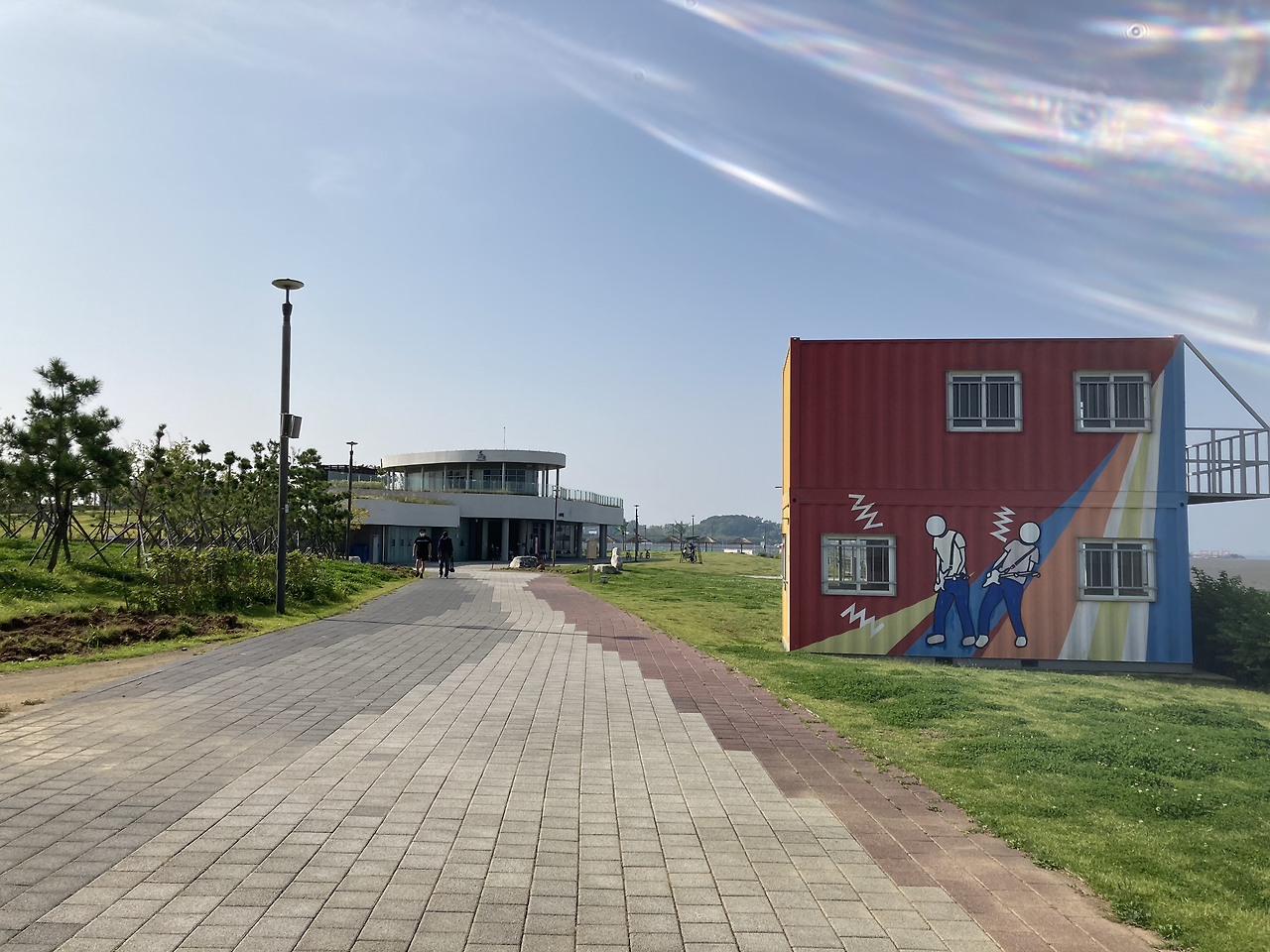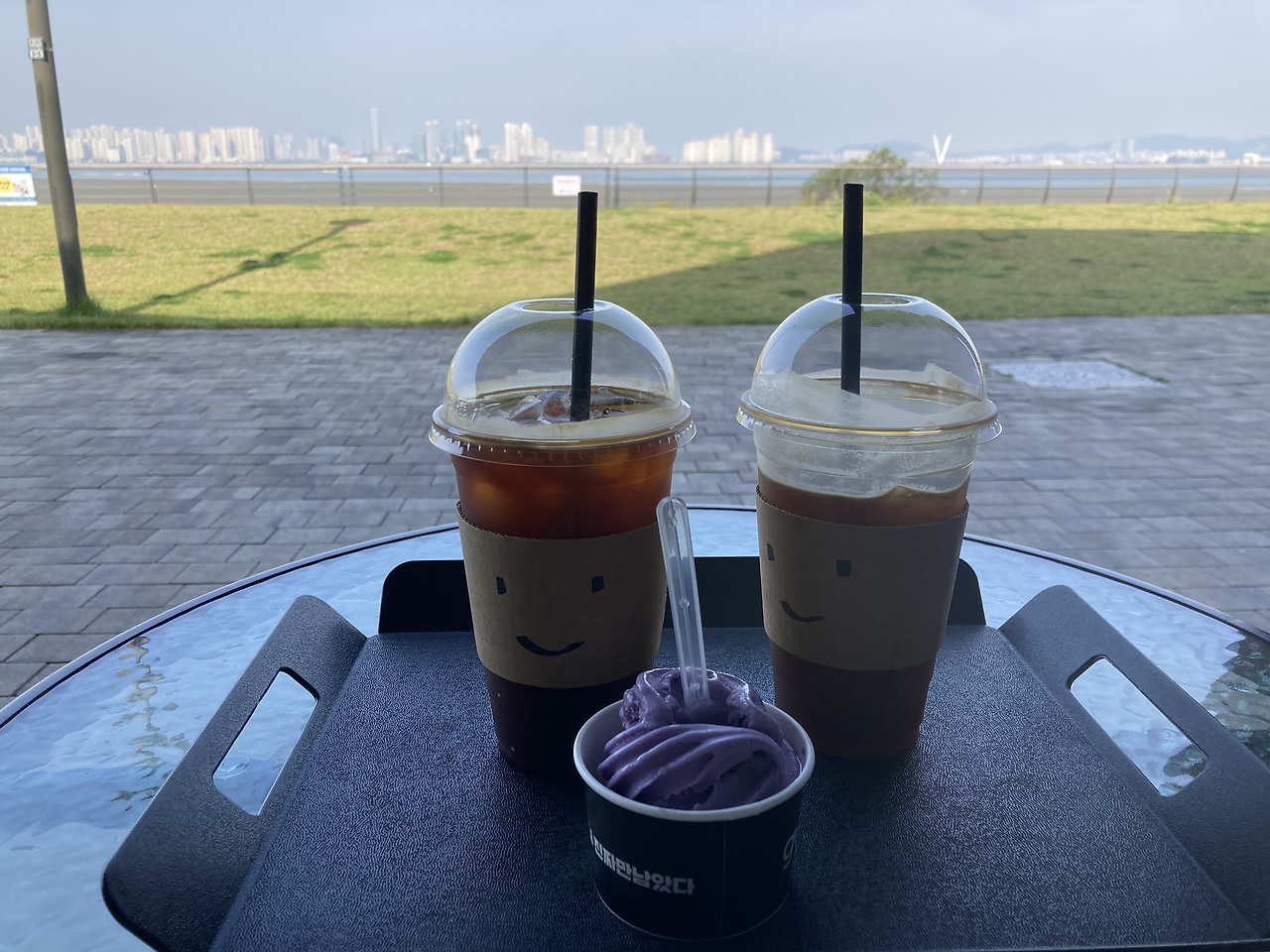 해수욕장 말고 공원에 자전거를 타고, 트레킹을 할 수 있는 길이 마련되어 있었다. 자전거를 쌩 하고 달리는 사람이 많아 조금은 위험했다. 우리는 아이와 최대한 조심해서 그 길을 따라 쭉 산책을 했다. 한창 걷는 데에 재미를 붙였던 아들 녀석. 걸으면서 힘들었을 텐데도 불구하고 걷는 게 재밌었나 보다. 돌아 올 생각을 하지 않고, 계속 길을 따라서 쭉 걸었다. 공원 옆에 갯벌도 있었는데 바람도 적당히 시원하게 불었고, 오랜만에 바람을 쐬니 좋았다. 아이도 밖에서 걸어 다니고, 바람을 쐬니 행복해하는 것 같았다. 웃음이 끊이지 않았던 아들 녀석이었다. 너무 멀리 가면, 돌아올 때 힘들 것 같아 적당한 곳에서 멈춰 돌아섰다. 돌아가는 걸 알았는지 안 가려고 했던 아들 녀석. 아이 키우는 부모들은 다 공감할 것 같다. 아이의 체력은 무한대고, 밖에 나가면 한 없이 놀고 싶어 집에 가려고 하지 않는다는 걸. 집에 돌아오는 길에 그냥 돌아오기 아쉬워 갯벌이 보이는 전망의 카페에서 남편과 커피, 아이스크림 각각 디저트를 먹고 왔다.