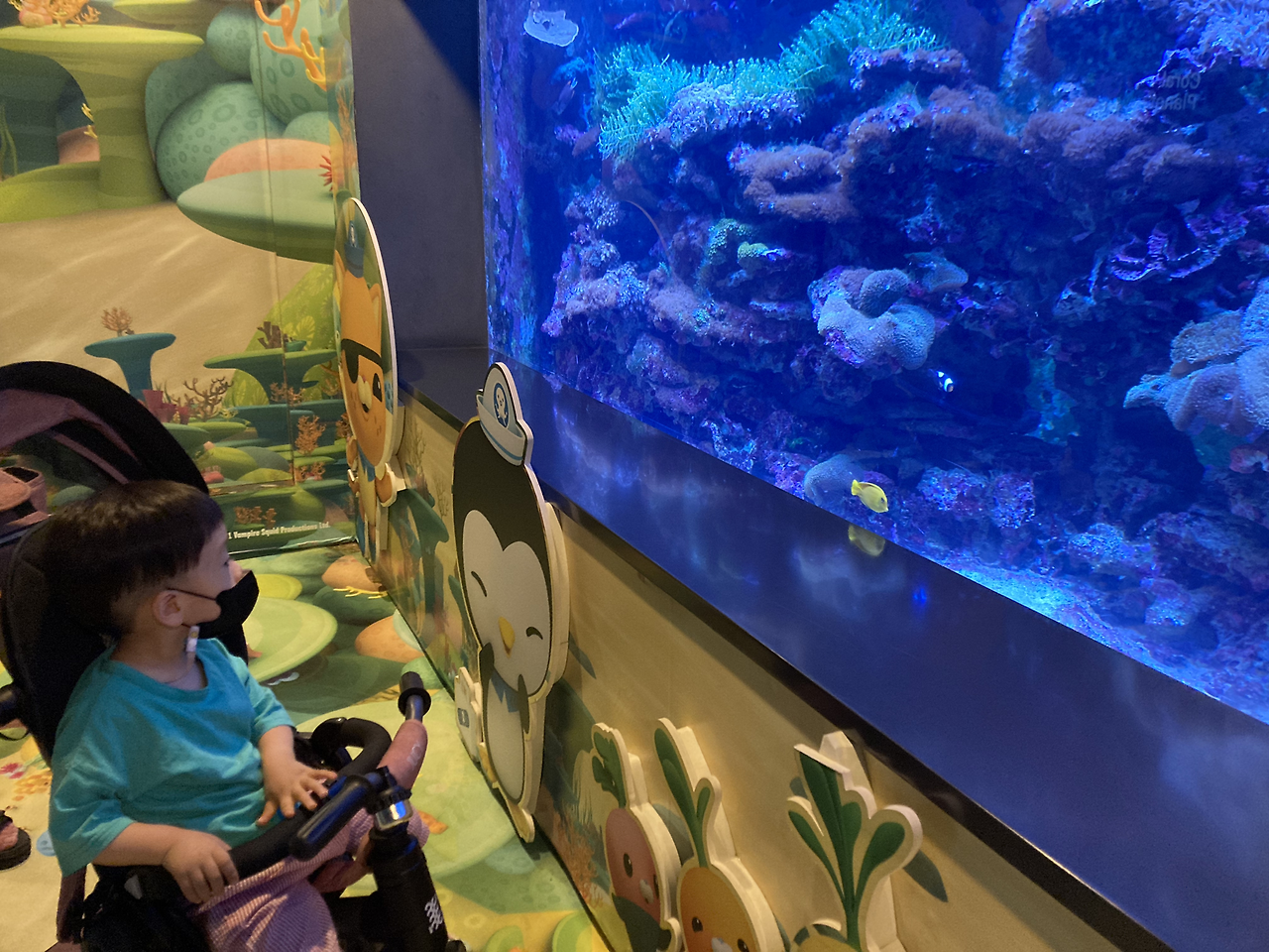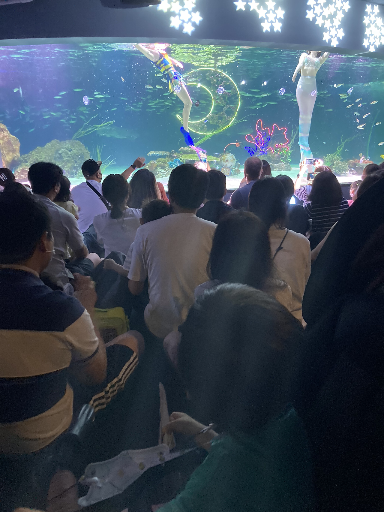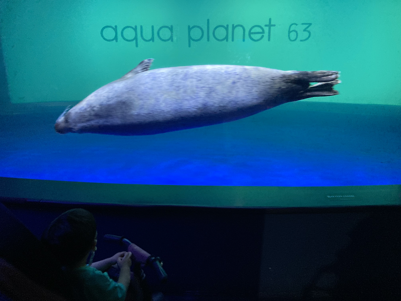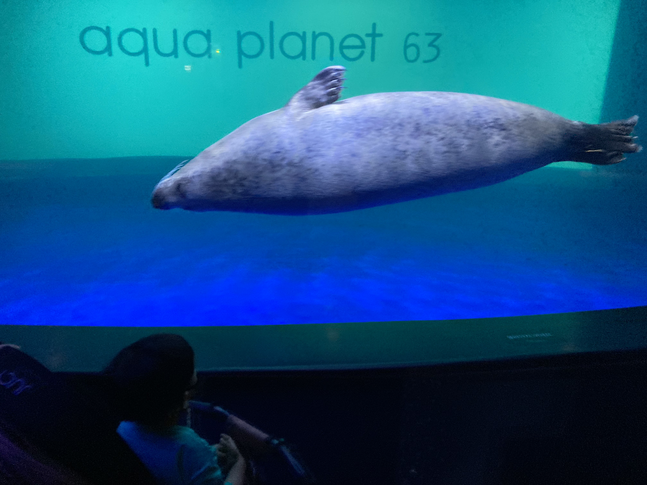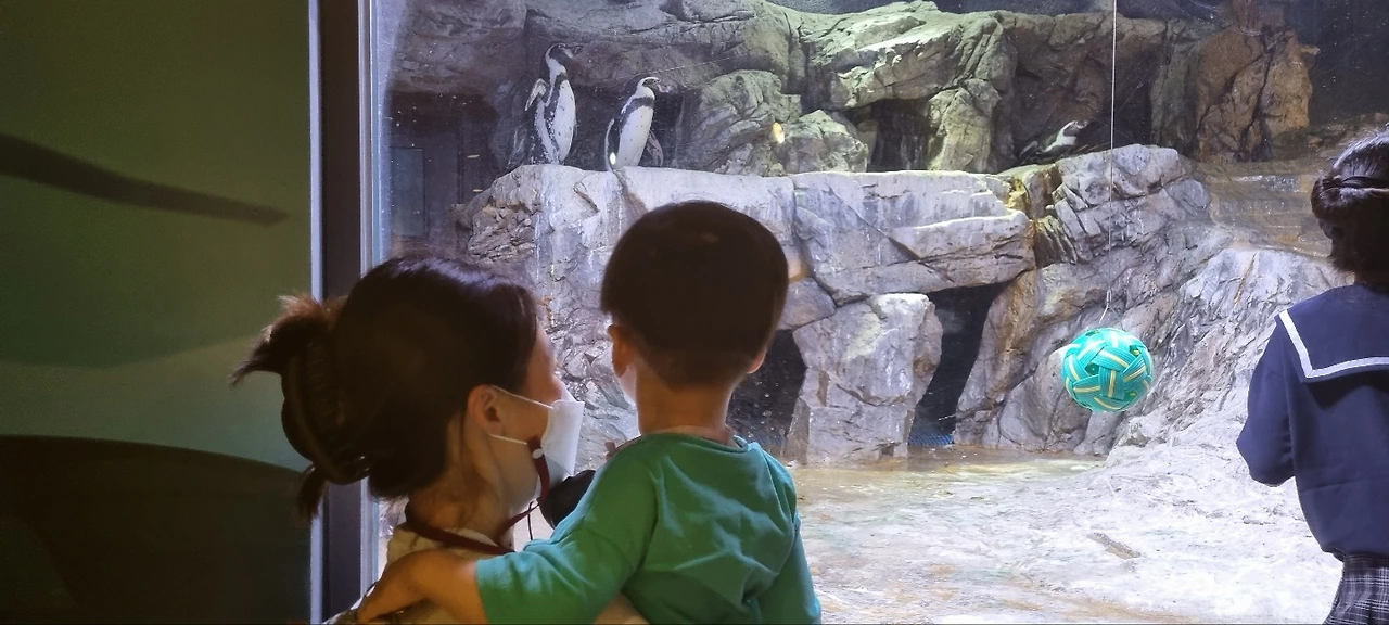 아쿠아리움은 1층과 지하 1층 2개의 층으로 되어있었다. 어둡고 캄캄했던 1층에 있는 아쿠아리움 물고기들을 구경하고 난 뒤 지하 1층으로 내려갔다. 그런데 1층에서 큰 물고기를 무서워했던 아들 녀석이 바다 물범은 아주 커다란 물고기였음에도 불구하고 무서워하지 않았고, 아이가 집중해서 봤었다. 한동안 바다 물범이 헤엄치는 모습을 아이와 함께 봤어야 했었다. 아쿠아리움 중 바다 물범에서 꽤 오랜 시간을 보냈었다. 오죽하면 아이는 아쿠아리움을 나가면 기념품샵이 나오는데, 그곳에서 바다 물범 인형을 가장 먼저 사 달라고 집었었다. 결국은 좋아하는 캐릭터인 아기 상어 스티커북으로 돌아섰지만 말이었다. 지하 1층으로 내려오니 수족관 분위기가 밝았다. 덕분에 아이는 그곳에서는 무섭지 않아 했었고, 작은 물고기들이라 그랬는지 처음 아쿠아리움을 들어왔을 때처럼 유리관에 손을 갖다 대기도 했었고, 작은 물고기들을 만져보려고 했었다. 시간이 맞아서 유리관 안에서 머메이드(인어) 공연도 아이와 보고 올 수 있었다. 무서워할 줄 알았는데, 예쁜 이모들이 나와하는 공연이었어서 그랬는지 침착하게 잘 보고 왔던 아들 녀석이었다. 이런 모습을 볼 때면, 마냥 어린 줄만 알았던 아이가 한 뼘 성장했다는 게 느껴지기도 했었다. 아이는 아쿠아리움 코스의 마지막이었던 펭귄을 볼 때 가장 즐거워 보였다. 아마 아쿠아리움을 떠날 때가 되니 적응이 된 것 같았다.