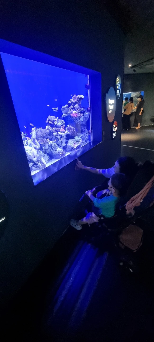 아이를 데리고, 차로 운전하여 서울 방문은 처음이었다. 매번 나들이를 가더라도 인천에 있는 명소들을 주로 갔었기 때문에 엄마인 나도 괜스레 신이 났었다. 아침 일찍 출발해서였는지 주말인데도 불구하고 차가 많이 막히지 않아 금방 도착할 수 있었다. 아쿠아리움에 들어가자마자 아이는 유리 관속에 있던 열대어들을 만져보려고 가까이 다가갔었다. 유모차 자전거에 앉아있던 아이는 타고 있던 유모차 자전거에서 나와 물고기를 가까이에서 보고 싶었는지 내려달라고 성화였다. 좀 더 가까이에서 아이가 물고기들을 볼 수 있도록 안아서 올려주었다. 그러나 처음에 호기심에 내려서 물고기들을 구경하고 탐색했던 아이는 아쿠아리움 배경이 캄캄해서 무서웠던지 다시 자전거 유모차를 타겠다고 떼를 썼었다. 결국 아이를 다시 유모차 자전거에 태우고, 서서히 구경을 했다.