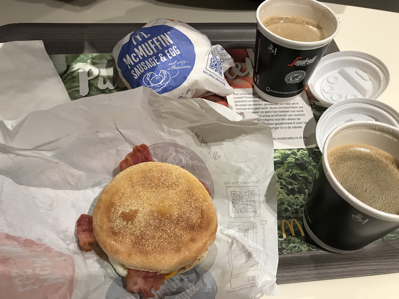 "네덜란드 암스테르담까지 와서 첫 끼를 맥도널드 맥모닝으로 먹게 될 줄은 몰랐다 그렇지?"