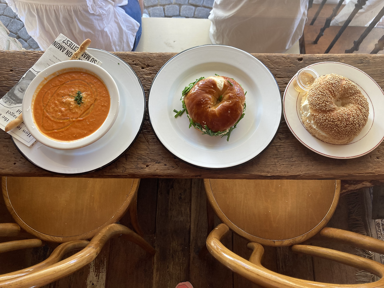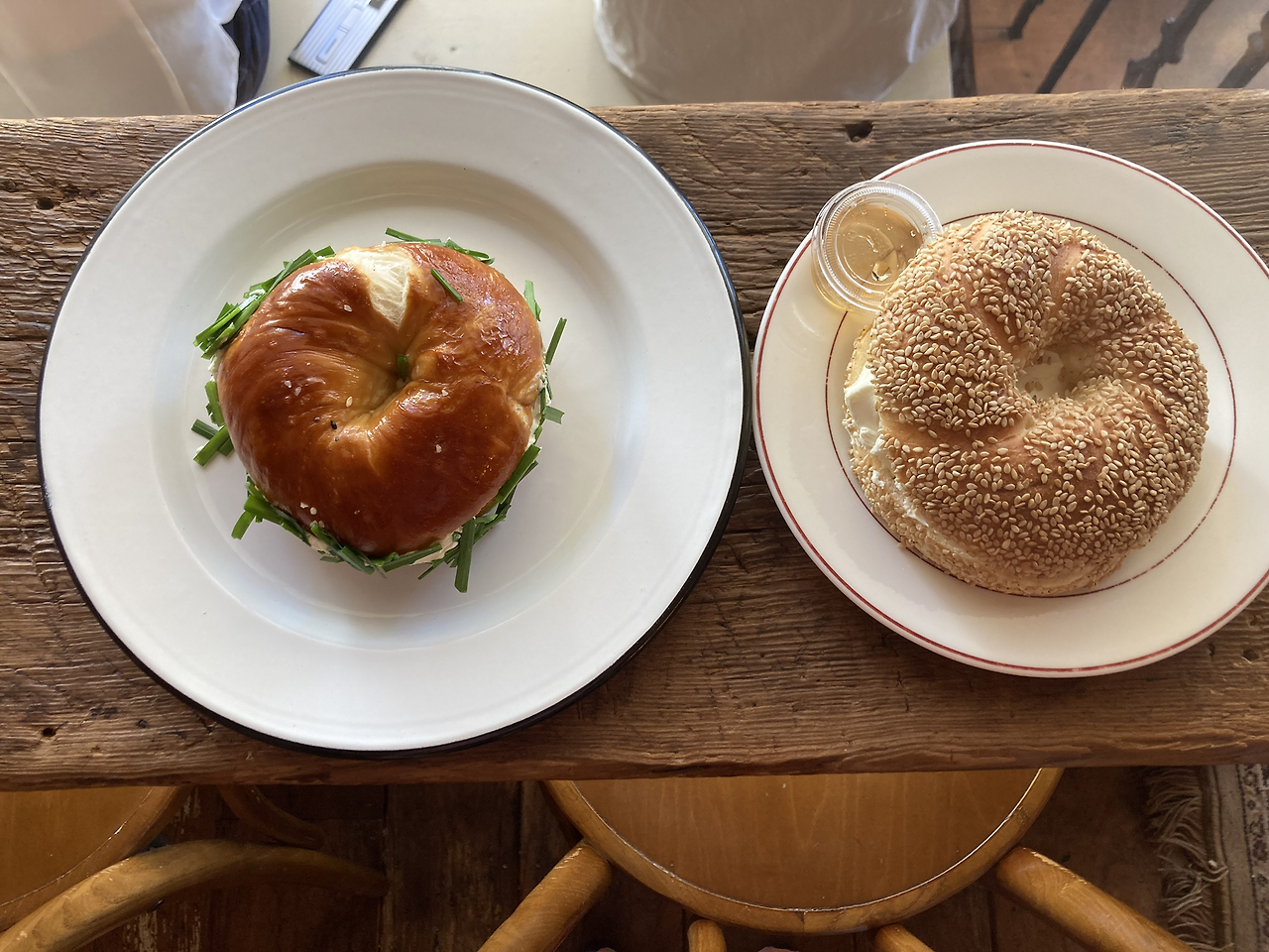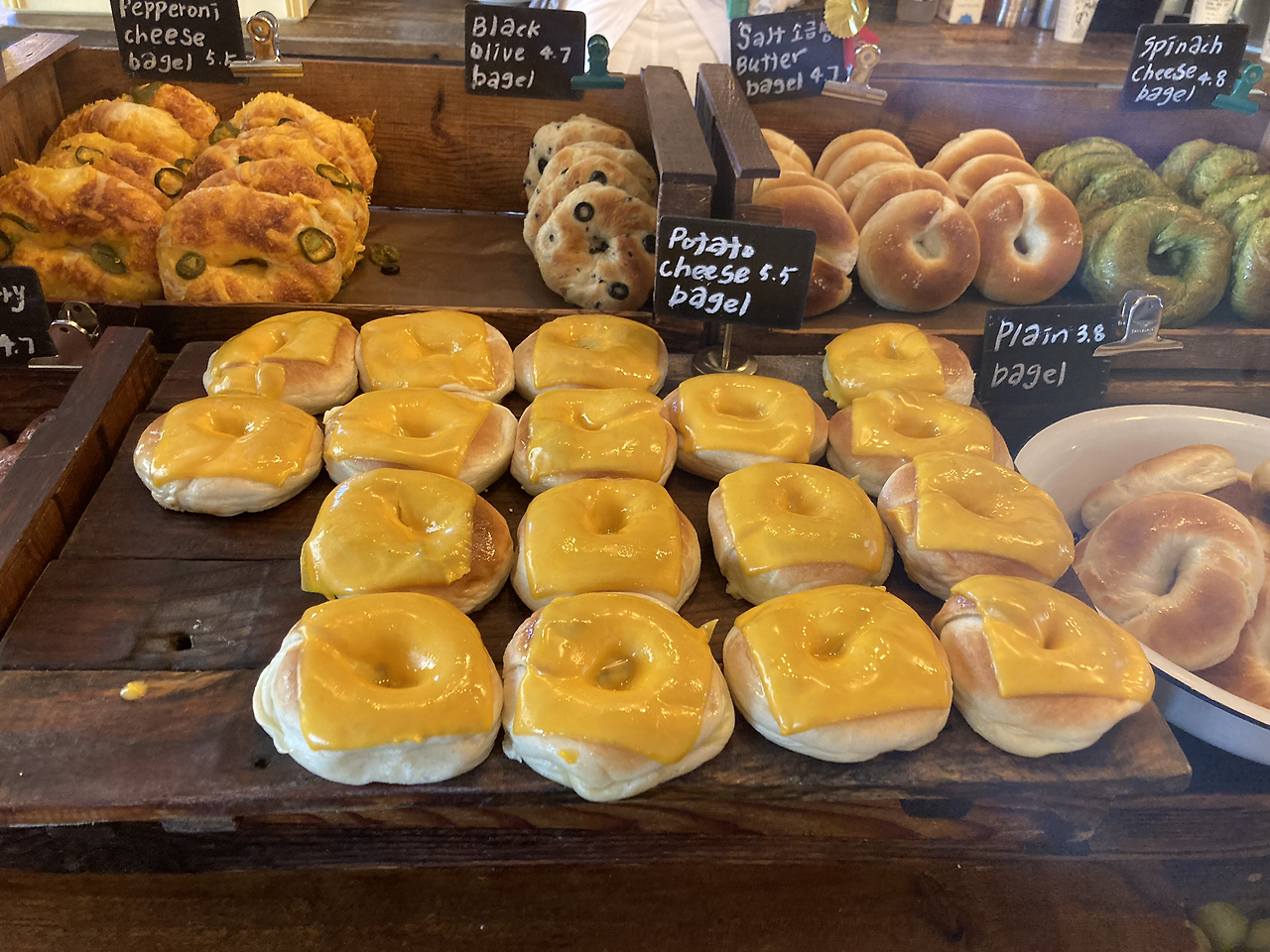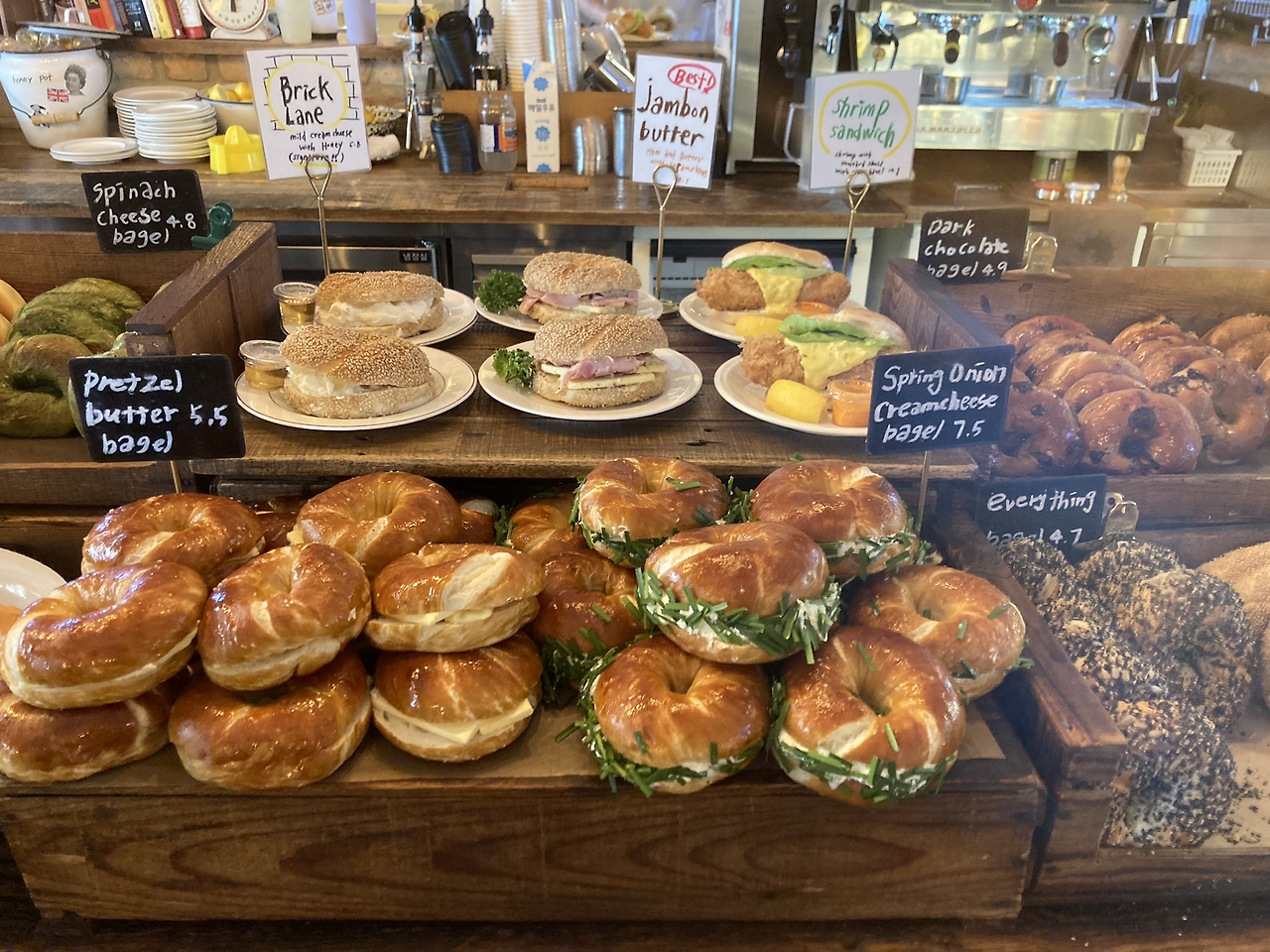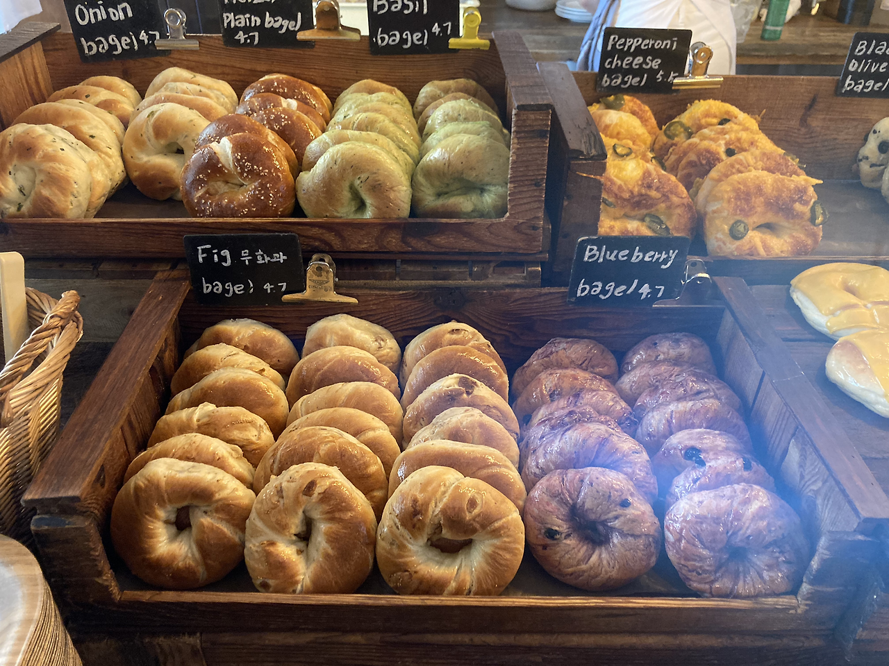 자리를 먼저 잡고 보기만 해도 먹음직스러운 베이글을 트레이에 한아름 담았다. 오기 전부터 미리 생각해놨던 베이글 메뉴를 우선 차곡차곡 담았고, 갑자기 즉흥적으로 보기에 맛있어 보이는 부추가 들어간 어니언 크림치즈 베이글을 담았다. 가장 먹어보고 싶고 맛이 궁금했던 베이글 2개인 부추 어니언 크림치즈 베이글과 이곳의 시그니처라는 브릭 레인 샌드위치 베이글만을 남겨두고 나머지는 포장을 했다. 내가 혼자 많은 베이글을 다 먹을 순 없었으니까. 사실 양파를 좋아하지 않는 나로서는 양파가 있을까 봐 먹고 싶지 않았던 베이글이었지만 먹음직스러운 모습에 '괜찮겠지'하고 집어 들었는데 한입 딱 베어 무니 양파가 씹혀서 당황스러웠다. 양파가 씹힌 다음부터는 그 베이글에 손이 잘 가지 않았다. 그래도 만든 사람의 성의를 생각하며 울며 겨자 먹기로 겨우 다 먹었다. 시그니처라고 하는 브릭 레인 샌드위치 베이글은 참깨 베이글에 크림치즈가 샌드 되어있고, 꿀을 찍어먹거나 발라먹는 베이글이었는데 참깨 베이글의 쫀득하고 담백함과 꾸덕꾸덕한 크림치즈가 꿀과 어우러져 입안에서 환상의 조화를 이뤄냈다. 마치 천상의 맛이라는 터키의 디저트로 잘 알려진 카이막을 먹는 느낌이랄까. 2가지 베이글 중에는 나는 역시 브릭 레인 샌드위치 베이글이 더 좋았다. 괜히 시그니처라고 불리는 게 아니었달까.