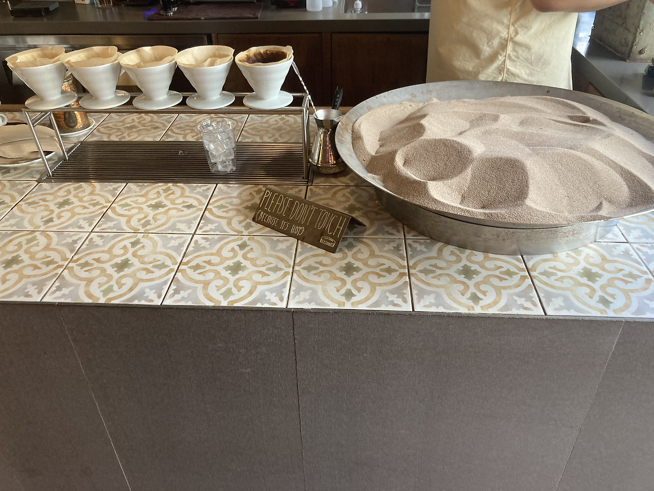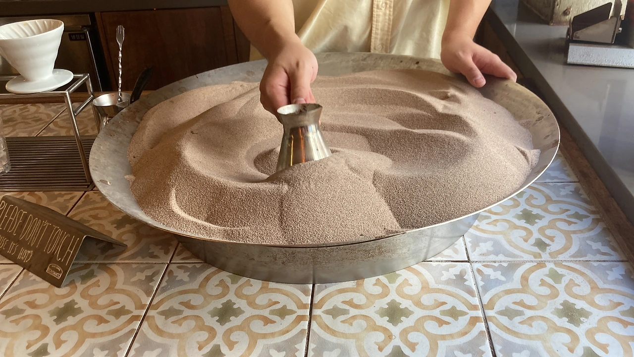 이윽고 자리를 잡은 후 주문해달라고 하셨고, 지난번에 바깥쪽에 앉고 싶었지만 사람이 많아 앉지 못했던 찰나에 오늘은 일찌감치 바깥쪽에 자리를 잡고 주문을 했다. 이미 생각했던 메뉴가 있었기에 주문하기에는 수월했다. 오늘 내가 먹고자 했던 메뉴는 바로 모래 커피인 체즈베. 메뉴판을 쭉 스캔하는데 체즈베의 종류가 많아 어떤 걸 마셔야 할지 당황스러웠었다. 살랑살랑 불어오는 바람이 시원했지만, 햇볕은 따가웠던 날씨에 나는 따뜻한 음료보다는 시원한 아이스 음료가 마시고 싶었고 에스프레소는 따뜻한 것 밖에 없어 아메리카노 맛의 브루잉 체즈베를 선택할 수밖에 없었다. 내가 브루잉 체즈베를 선택하자 바디감이 살아있고 부드러운 커피맛이 나도록 내려주시겠다고 하셨다. 원두를 내려 모래에 돌리면서 커피를 만드시는 모습을 관찰했다. 처음 보는 모래 커피 만드는 모습이 신기해서 사진과 동영상으로 담았다.