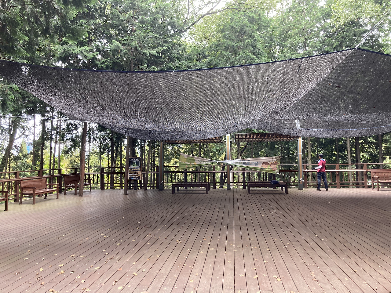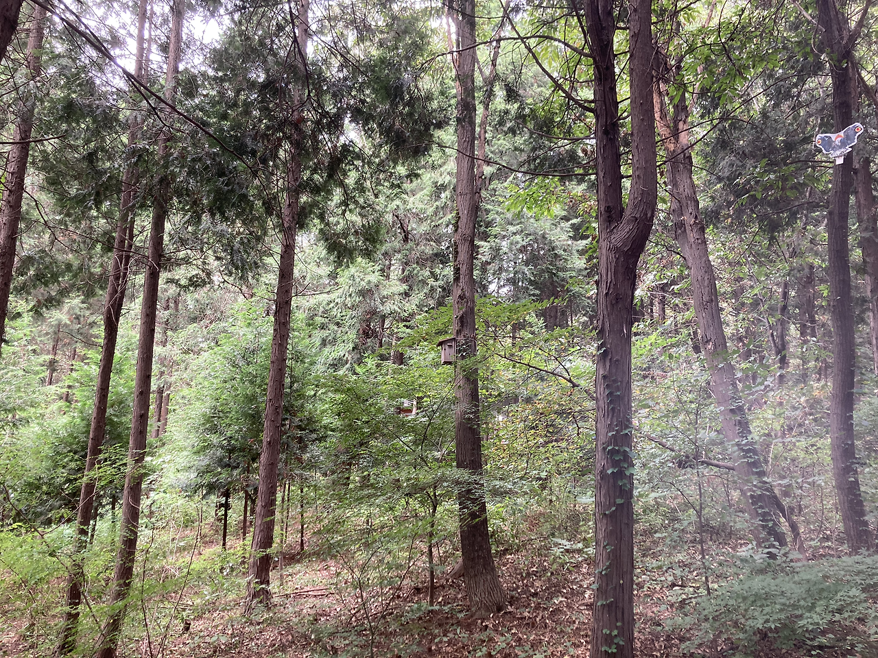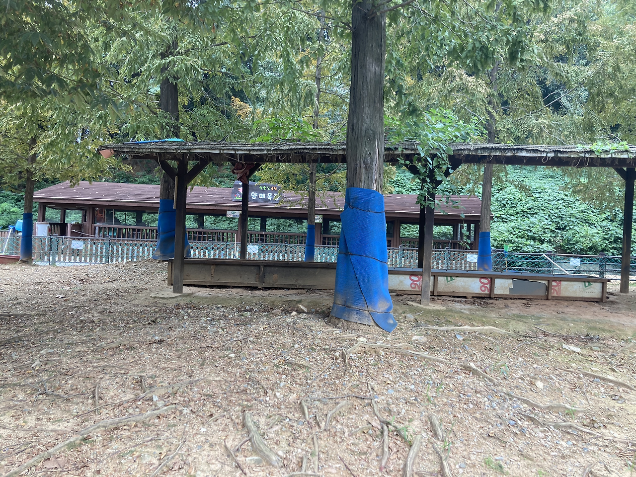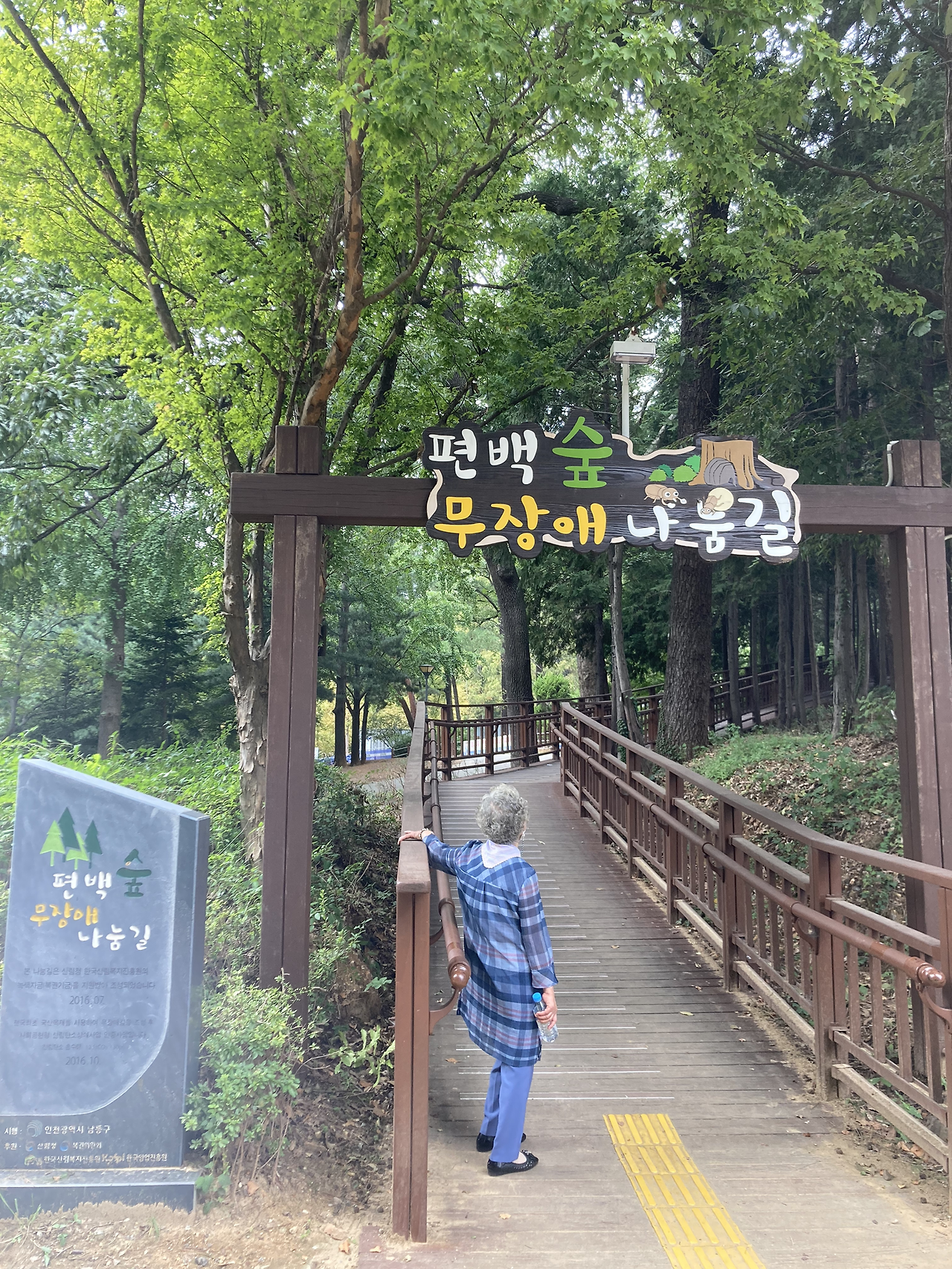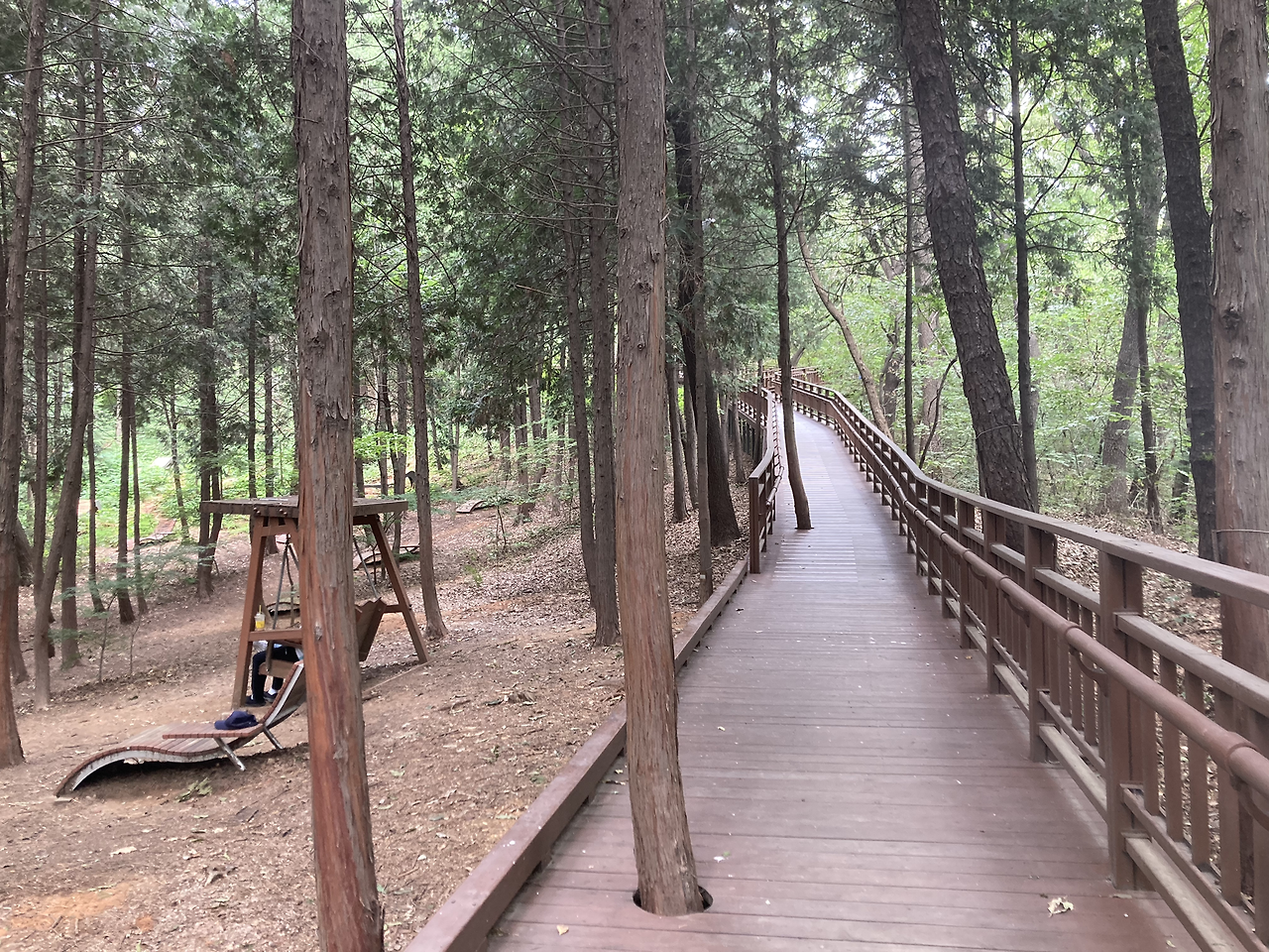 양 떼 목장에서 자꾸 벗어나는 아이를 따라 벤치에서 쉬고 있던 어른들도 아쉽지만 자리를 일어났다. 모처럼만에 나왔는데 집에 그냥 가기엔 아쉬워 양 떼 목장 옆에 있었던 편백나무숲 무장애 나눔길을 걸었다. 길이가 짧아서 아이와 걷기에 안성맞춤이었다. 작년에는 유모차 자전거를 타고 왔었는데 올해는 다리 힘이 생겼는지 날다람쥐처럼 숲길을 뛰어다녔던 아들 녀석. 양 떼 목장에서 받았던 스트레스를 이곳에서 훌훌 날려버리듯 순식간에 편백나무숲길을 올라갔었다. 편백나무숲길에는 산림욕을 할 수 있는 쉼터와 숲 놀이터가 있었는데 숲 놀이터는 현재 공사 중이어서 아쉽게도 가보지 못했었다.