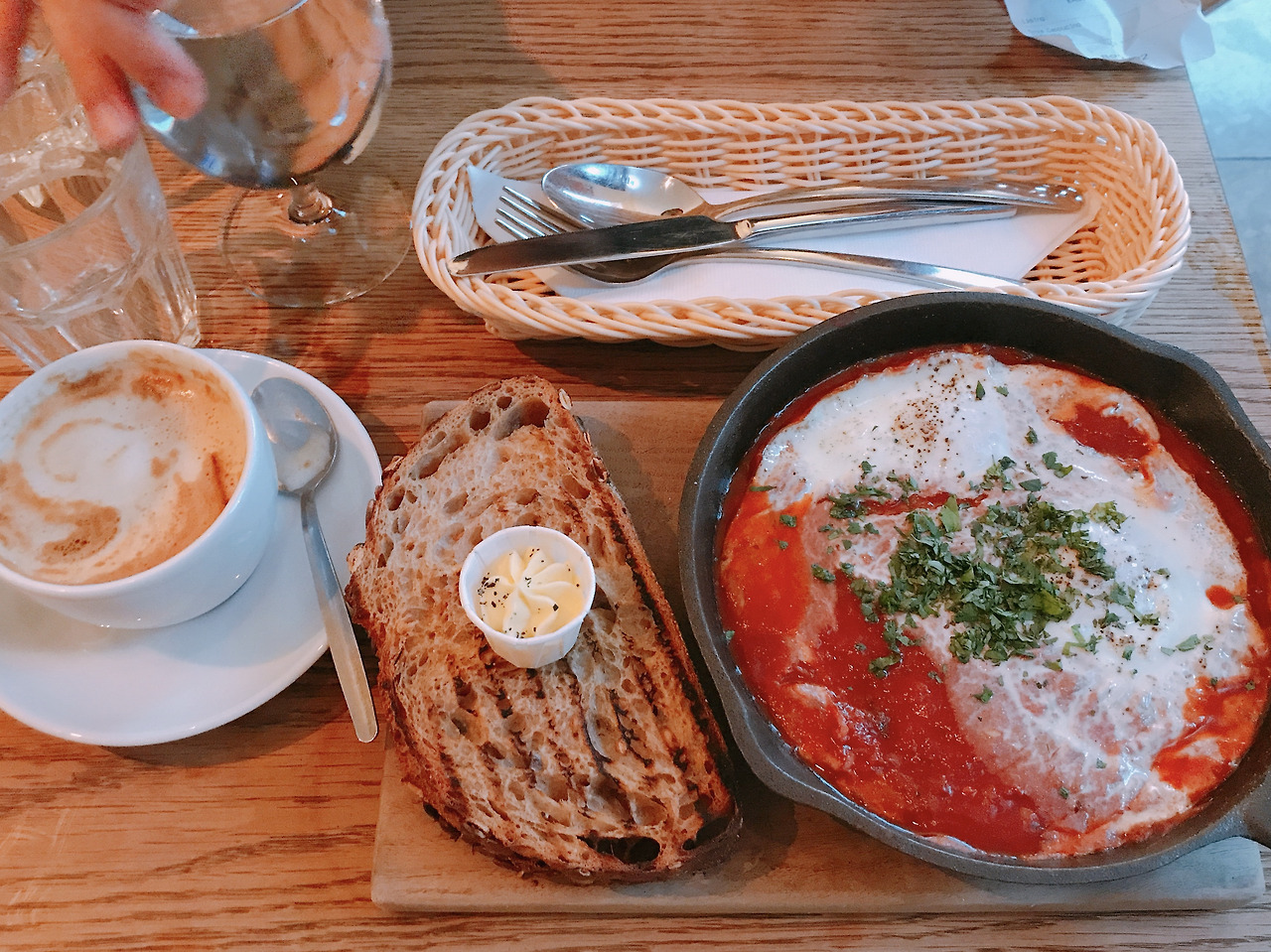 빵과 커피는 절묘한 조화를 이뤘다. 따뜻하고 달콤한 빵으로 유명한 이곳의 대표 메뉴를 먹어봤다는 생각에 뿌듯했다. 그러면서 여기저기 다른 테이블은 무얼 먹는지 봤다. 참으로 맛있어 보이는 메뉴를 하나같이 다들 먹고 있었다. 매콤한 걸 좋아하는 나로서는 빨간 토마토소스를 베이스로 만들어진 요리가 너무 맛있어 보였다. 많은 테이블에서 그 음식을 먹고 있었다. 음식 맛이 너무 궁금했던 나는 '저 음식을 먹어보기 위해서 이곳에 내일 또 와봐야겠다'라고 생각을 했다. 다음날이 레이캬비크에서는 마지막이었기에 더 고민할 상황이 아니었다. 그리고 다음날 아침이 되었다. 그런데 메뉴판에서 그 메뉴를 찾았지만, 사진이 없던 그 메뉴판에서는 뭐가 뭔지 몰랐다. 찾기 힘들었다. '그 음식을 꼭 먹어봐야 하는데...... 안 그러면 너무 아쉬울 거 같은데'라는 생각이 머릿속을 계속 맴돌았다. 때 마침 옆 테이블의 어떤 사람이 그 음식을 먹고 있었다. 메뉴판을 보여주면서 당신이 먹고 있는 그 음식이 너무 먹고 싶은데 그 메뉴가 어떤 건지 물었다. 그 여자는 친절하게 알려주면서 맛있어서 후회하지 않을 거라고 했다. 주문하고 나서 기대가 됐다. 과연 어떤 맛일까.