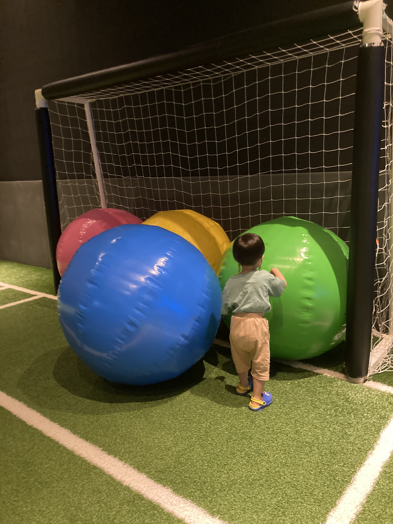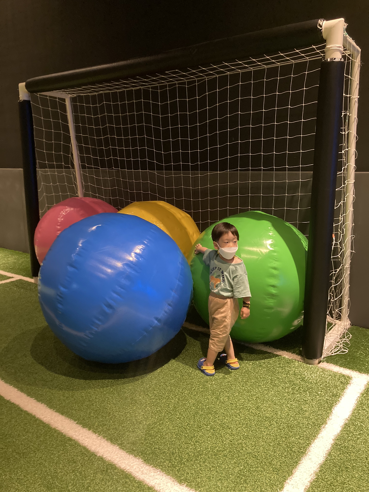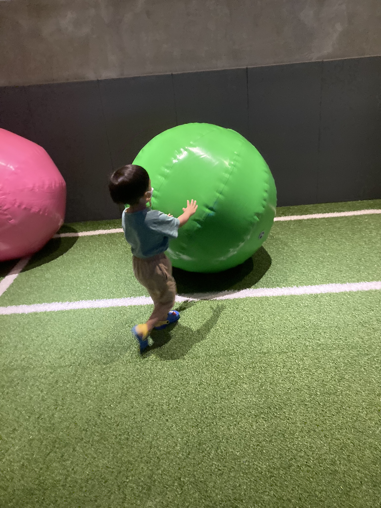 지난번에 키즈 펜션을 놀러 갔을 때의 기억을 더듬어 그때 야외 축구장을 좋아하며 뛰놀았던 아들 녀석, 이번에도 좋아할 줄 알고 인조잔디로 조성된 축구장을 데려가 공 굴리기를 하고 공차기를 했었다. 그러나 자신의 몸집만 한 공을 굴려야 하는 게 무섭고 겁이 났던 건지 그다지 좋아하지 않았었다. 오히려 옆 공간에 있었던 작은 농구공들이 있던 농구코트를 더 좋아했었다. 농구공도 가지고 놀며 코트 위를 천진난만하게 웃으며 뛰어다녔던 녀석이었다. 나와 남편도 오랜만에 동심으로 돌아가 아이와 신나게 뛰놀았었다.