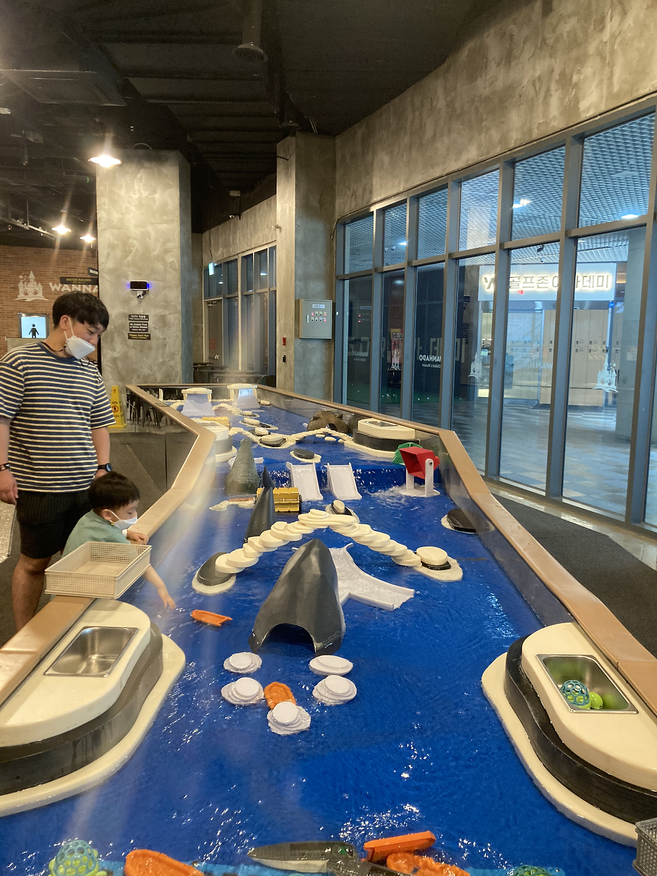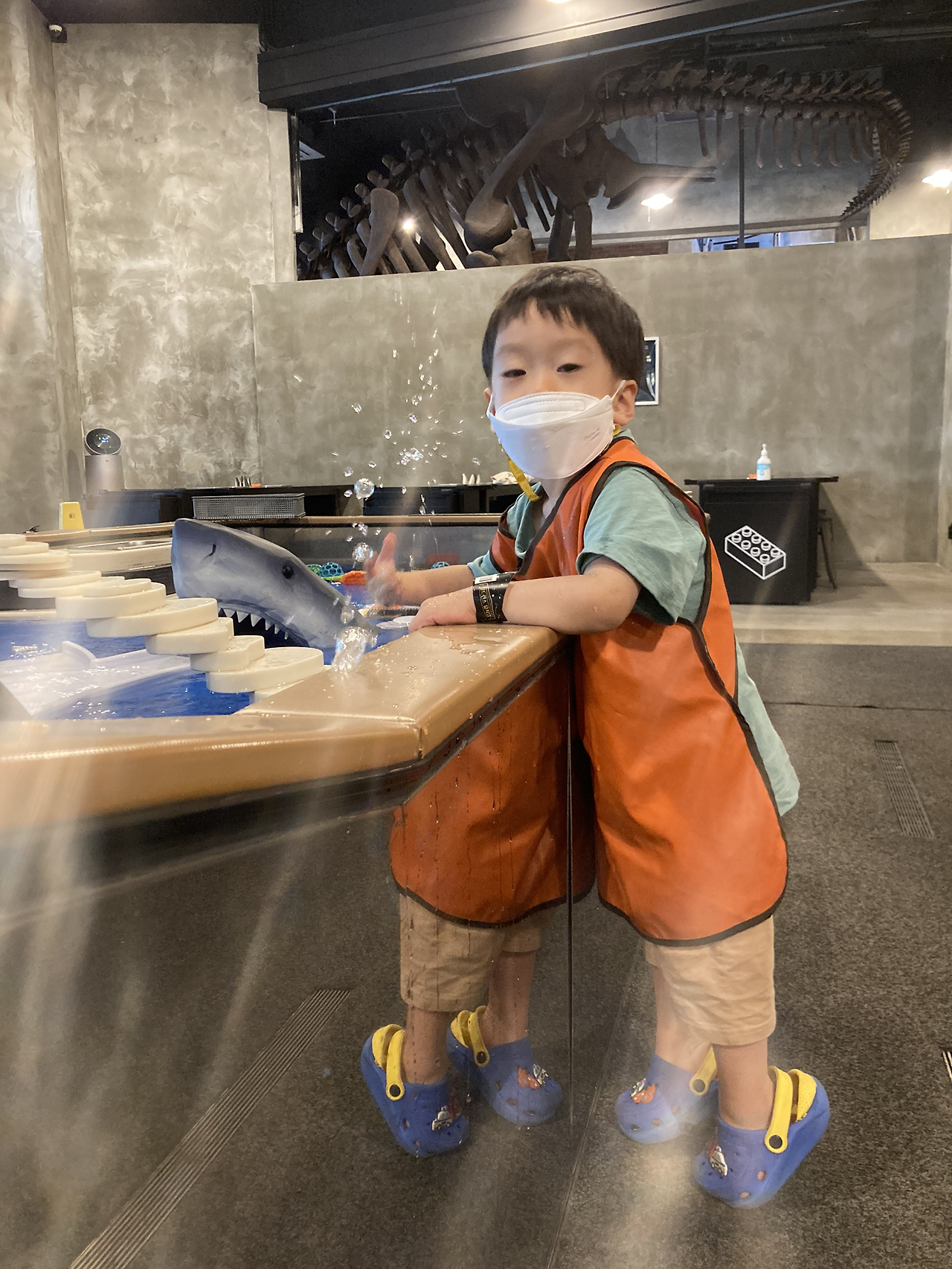 공룡을 지나면 Science 과학을 체험할 수 있는 물놀이를 할 수 있는 공간이 있는데 물을 좋아하는 우리 아이, 역시 그냥 지나치지 않았었다. 물놀이할 때 물이 옷에 젖지 않도록 앞치마가 준비되어 있었길래 앞치마를 채워주려 했는데 앞치마를 하지 않겠다고 해 긴 실랑이가 있었다. 살살 달래서 앞치마를 채우고 본격적인 물놀이를 시작했다. 과학실험 공간이었지만, 아직 우리 아이에겐 그런 어려운 내용은 따지고 싶지 않았다. 그저 즐겨보라고 내버려 두었고, 첨벙첨벙 놀다 왔다. 더 놀고 싶어 했지만, 시간은 한정되어 있고 더 많은 다른 체험들이 기다리고 있었기에 아쉬움을 뒤로하고 다른 곳으로 이동했다.