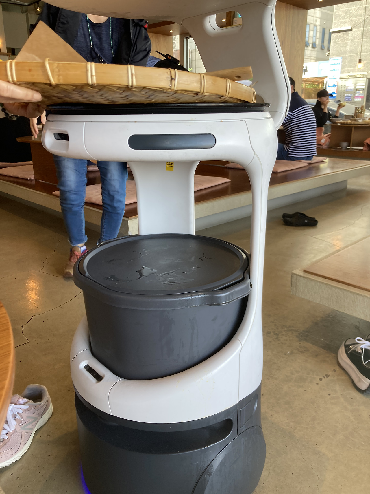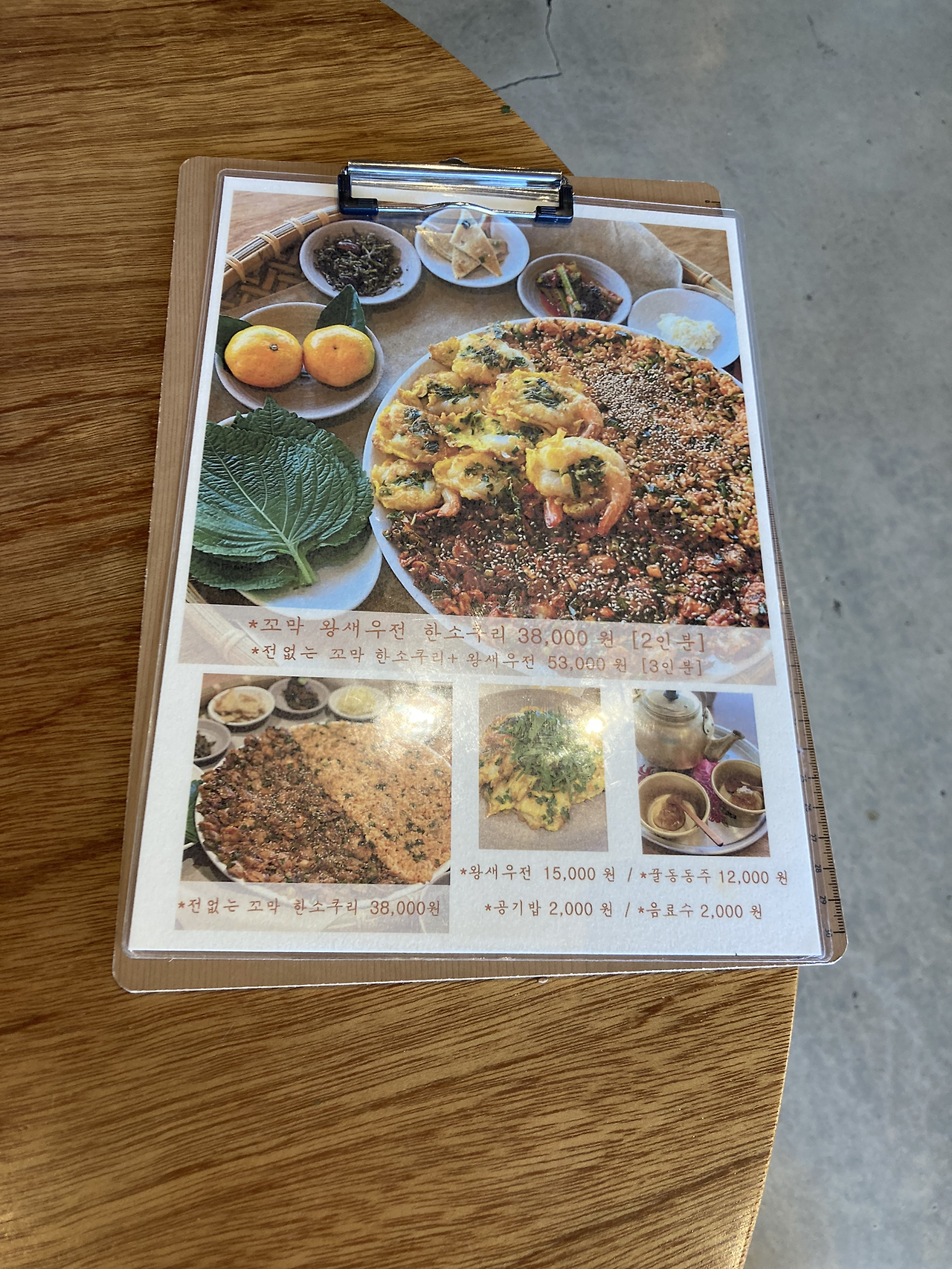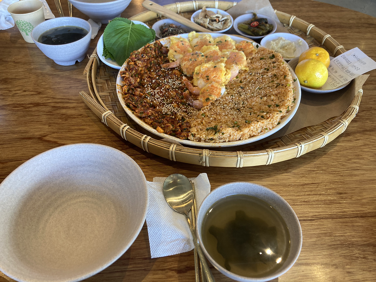 메뉴는 단출하게 단 2가지였다. 꼬막비빔밥+새우전인데 2인분용 3인분용 따로 구분되어있었다. 엄마와 나는 꼬막비빔밥+새우전 2인용으로 주문을 했다. 얼마 지나지 않아 서빙 봇이 우리의 메뉴를 가져다주었다. 먹음직스러워 보이는 꼬막비빔밥과 새우전이 한 소쿠리에 나오고 디저트로 사람당 나오는 귤이 보였다. 디저트를 먹고 난 뒤 얼마 지나지 않은 시간이었기에 우리 모녀는 과연 이 많은 양의 점심을 또 먹을 수 있을지 걱정이 됐었지만 맛있어 보이는 음식 앞에 침이 고였고 디저트 배와 식사 배는 따로 있다고 과학적으로 증명이 됐던 실험을 뉴스에서 봤던 적이 있었다. 새우전은 갓 요리해서 따뜻해서 좋았고 새우가 통통하고 실했었다. 새우전에 있던 계란옷이 부드러워 식감이 좋았었고, 꼬막비빔밥이 매콤해서 둘의 궁합이 좋았었다.