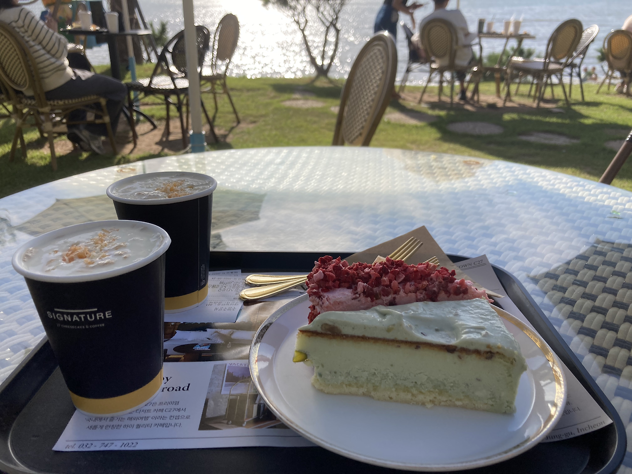 또한 야외에 나가니 소문대로 일몰 맛집, 일몰이 예쁜 공간이었다. 그래서 그런지 너도나도 예쁜 일몰을 보기 위해 자리 경쟁이 치열했었다. 우리는 야외에 고즈넉한 곳에 겨우 자리를 잡았다. 카페 앞은 바로 마시안 해변을 왔다 갔다 할 수 있어 아이들이 모래 놀이하기에도 좋아 보였다. 그래서인지 아이들과 함께 가족단위로 온 사람들이 많았었다. 그렇게 자리를 잡고 기다리니 주문한 커피와 케이크가 나왔다