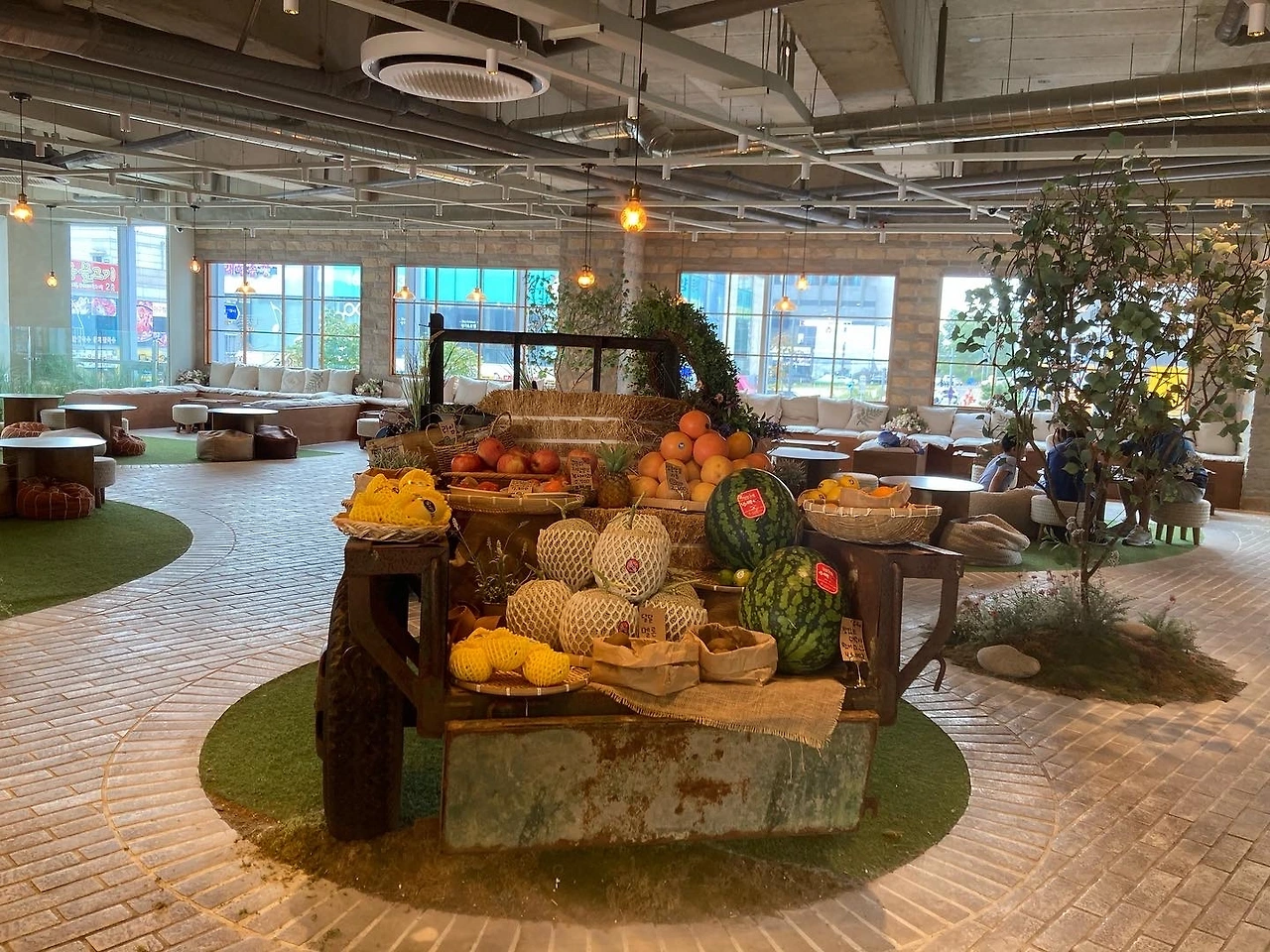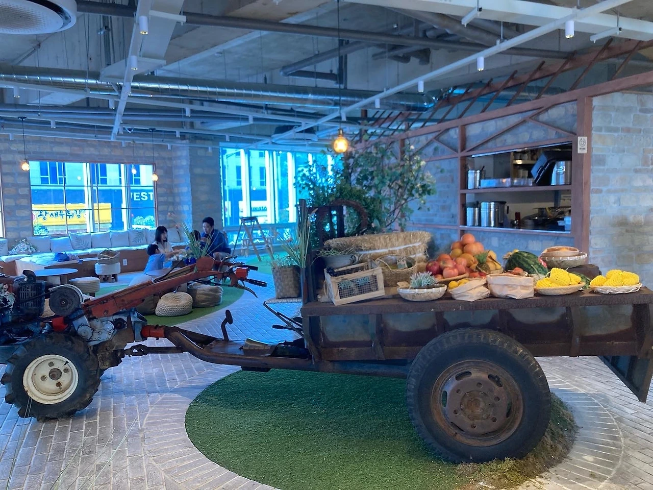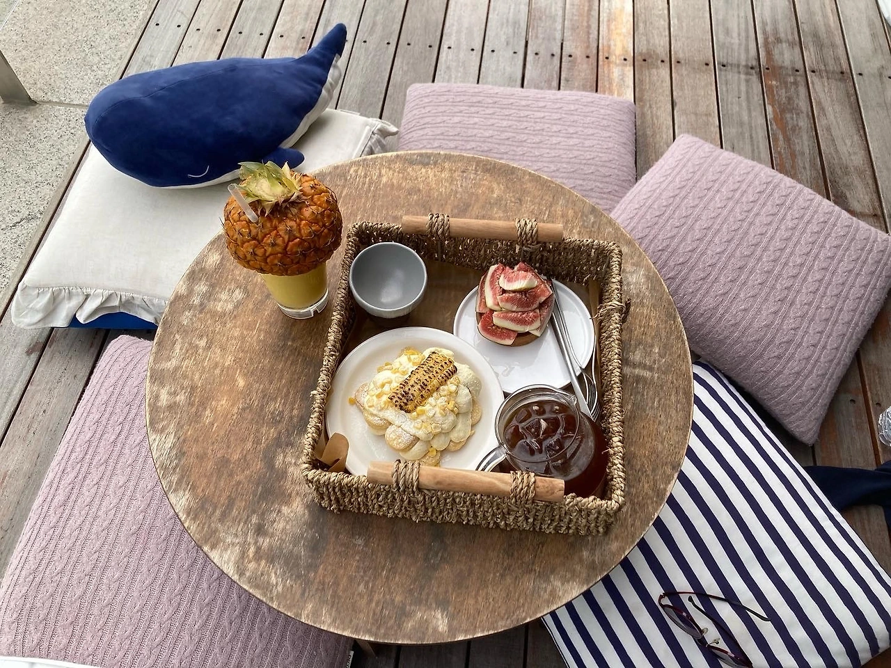 카페는 바다 앞 농장이라는 콘셉트에 맞게 정말 바다가 보였고, 카페 내부에는 경운기와 과일 등으로 진짜 농장이 생각나게끔, 시골집 앞마당에 놀러 온 것처럼 꾸며놓았었다. 우리는 바다 앞에 자리를 잡았고, 바다가 바로 보여서 전망이 참 좋았었다. 파인애플 주스는 정말 파인애플을 착즙 해서 만든 듯 파인애플 맛이 새콤했고, 커피는 부드러웠었다. 디저트도 많이 달지 않아 만족하며 먹었었다. 엄마와 나 둘 다 "많이 먹으면 점심을 먹을 수 없는데"라고 말하면서도 계속 입속으로 디저트가 마법처럼 들어갔었다.