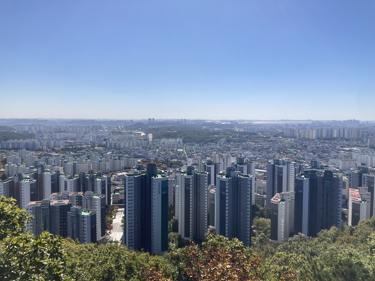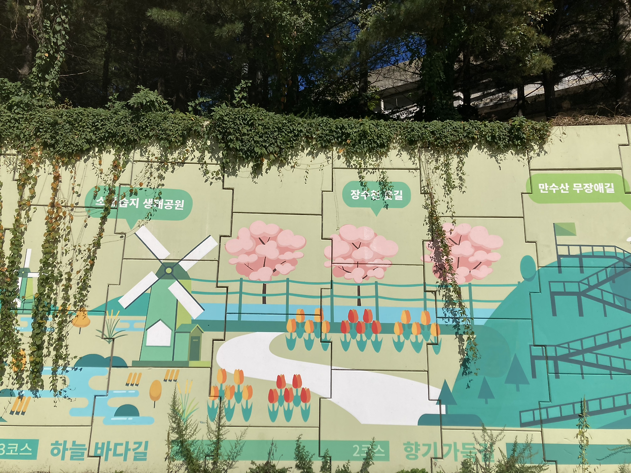 그리고 인천대공원의 수목원을 지나 수현 부락을 쭉 걸어 만수산 무장애 나눔길로 향했었다. 이미 만수산 정상에서 스탬프를 찍었던 우리 모녀. 엄마는 만수산을 꼭 올라야겠냐고 하셨었지만, 나의 고집에 결국 함께 오르셨었다. 기어코 정상까지 걸어갔다가 남동구 전경을 쭉 훑어보고 내려왔다.