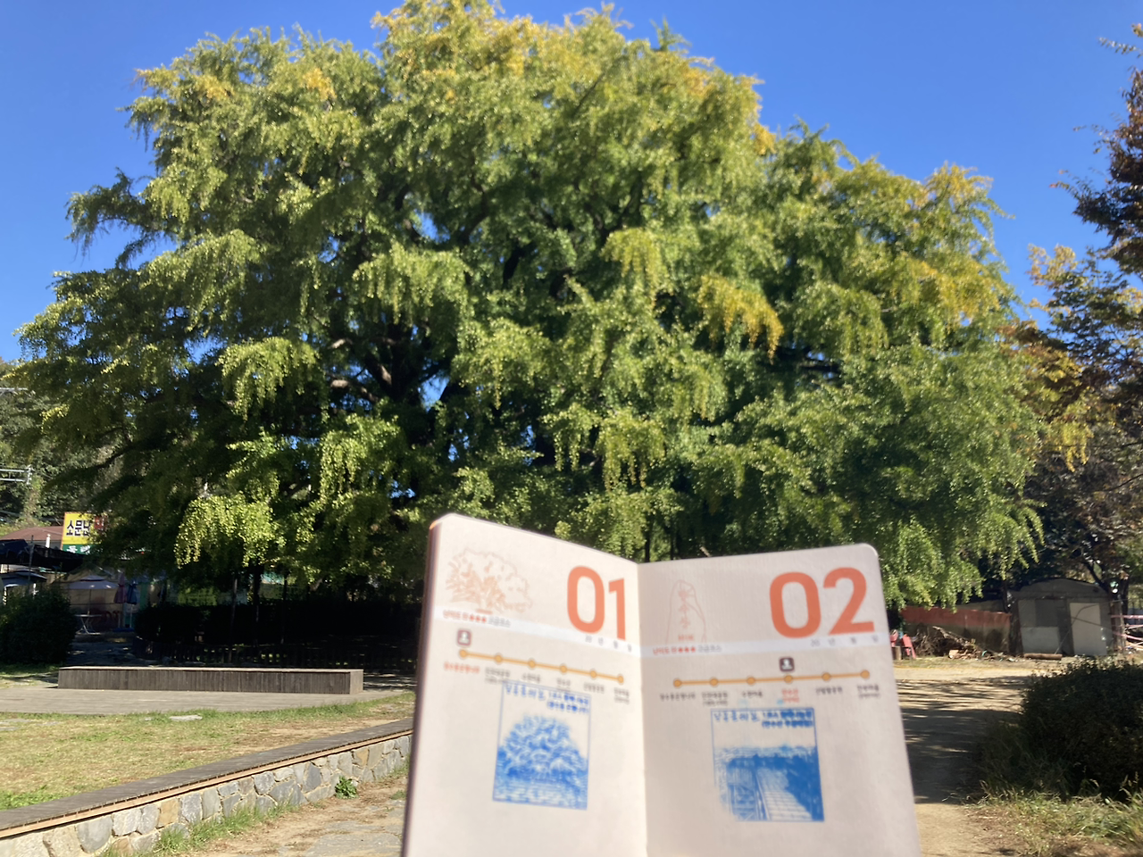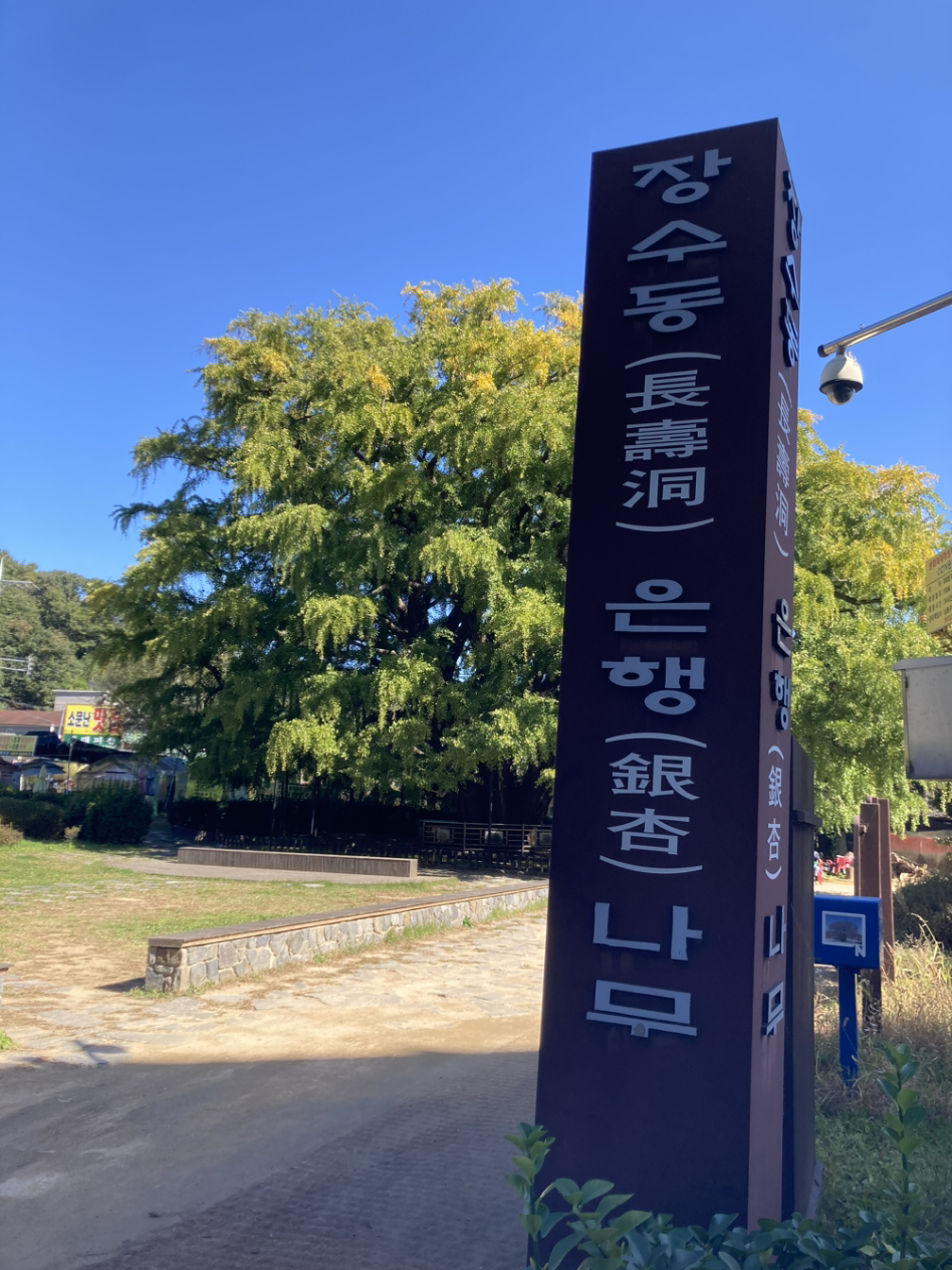 처음이라 설레는 마음으로 장수동 은행나무를 찾아갔는데 햇빛을 받은 곳만 조금 노랗게 물들었을 뿐 잎의 대부분이 아직 초록색이었다. 높이 28.2미터에 둘레 9.1미터이며 나이는 800살이라는 장수동 은행나무는 2021년 2월 8일 가치를 인정받아 국가지정 천연기념물로 등록도 되었다고 한다. 스탬프 북을 펼쳐 살포시 도장도 찍어주고 왔다.