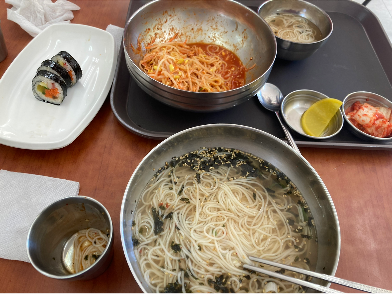 끼니도 스킵하고 걸었던지라 출출했던 엄마는 빨리 내려가서 밥 먹으러 가자고 성화 셨었다. 우리의 늦은 점심은 동네 맛집에서 우리 모녀가 좋아하는 쫄면과 잔치국수 그리고 김밥이었다. 많이 걷고 운동을 했으니 많이 먹어도 되지 않겠냐고 합리화를 하면서 배를 채우고 왔었다. 음식을 보니 배가 고파 허겁지겁 먹었던 우리.
