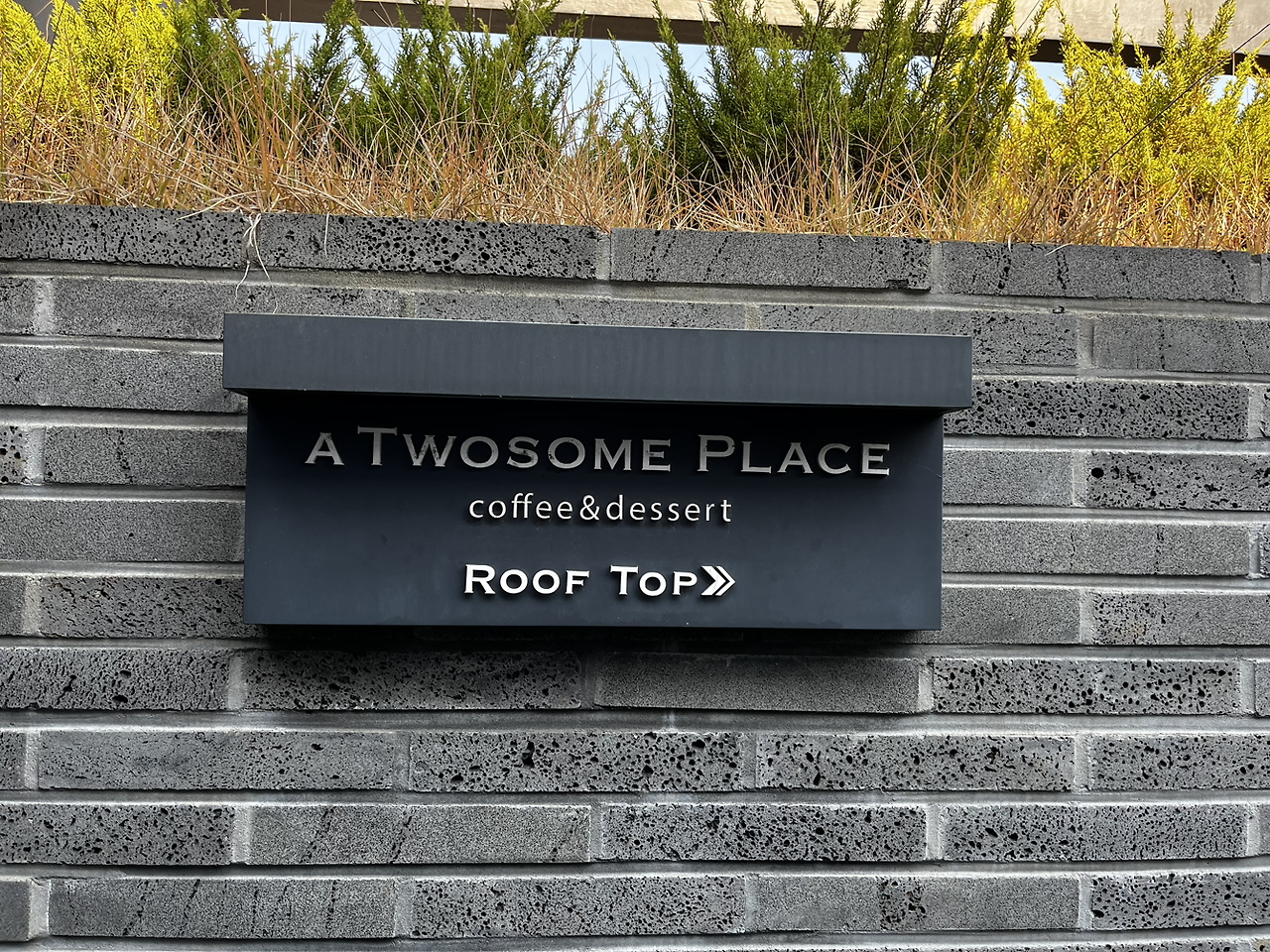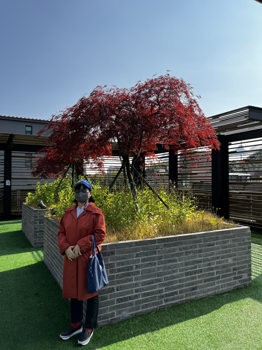 엄마와 커피와 디저트를 즐기고, 색색깔로 물든 나뭇잎들을 실컷 보고 난 후 집으로 가야겠다는 엄마와 자리에 일어섰다. 집으로 가기 전 우리가 앉았던 곳 위층인 3층에 있다는 옥상정원, 포토존도 잠깐 들렀다 갈까 싶어서 올라갔는데 웬걸 경치가 더 좋았다. 3층에도 테이블이 놓여 있었고, 마련된 테이블에 앉아 전망을 즐기고 있는 사람들도 더러 있었다. 한층 더 올라왔다고, 또한 라인이 없어 더 시원스러운 뷰를 자랑했었다. 개인적으로는 2층 테라스보다 뷰가 더 좋았다. 그런데 나만 그렇게 생각한 게 아니었나 보다.