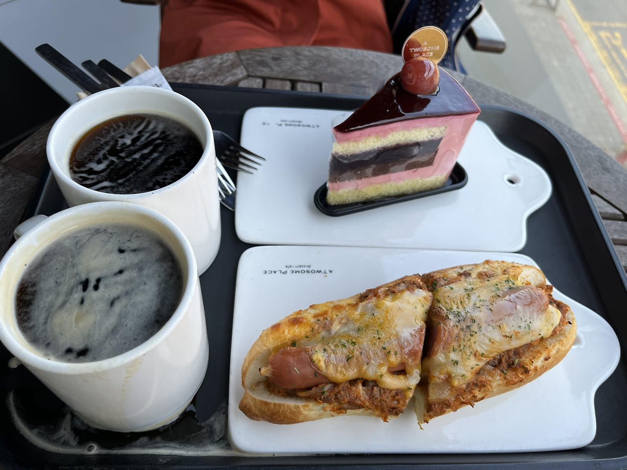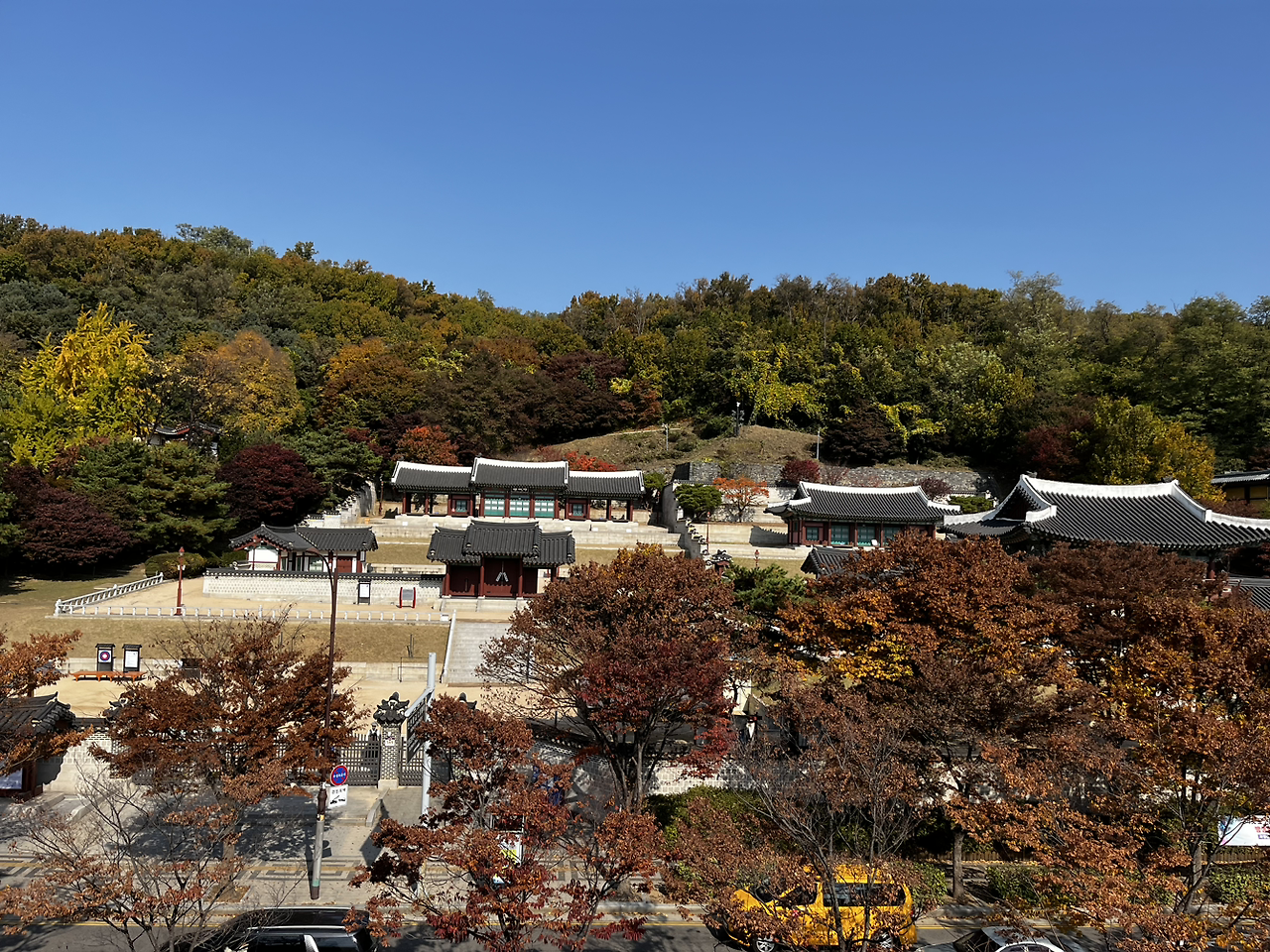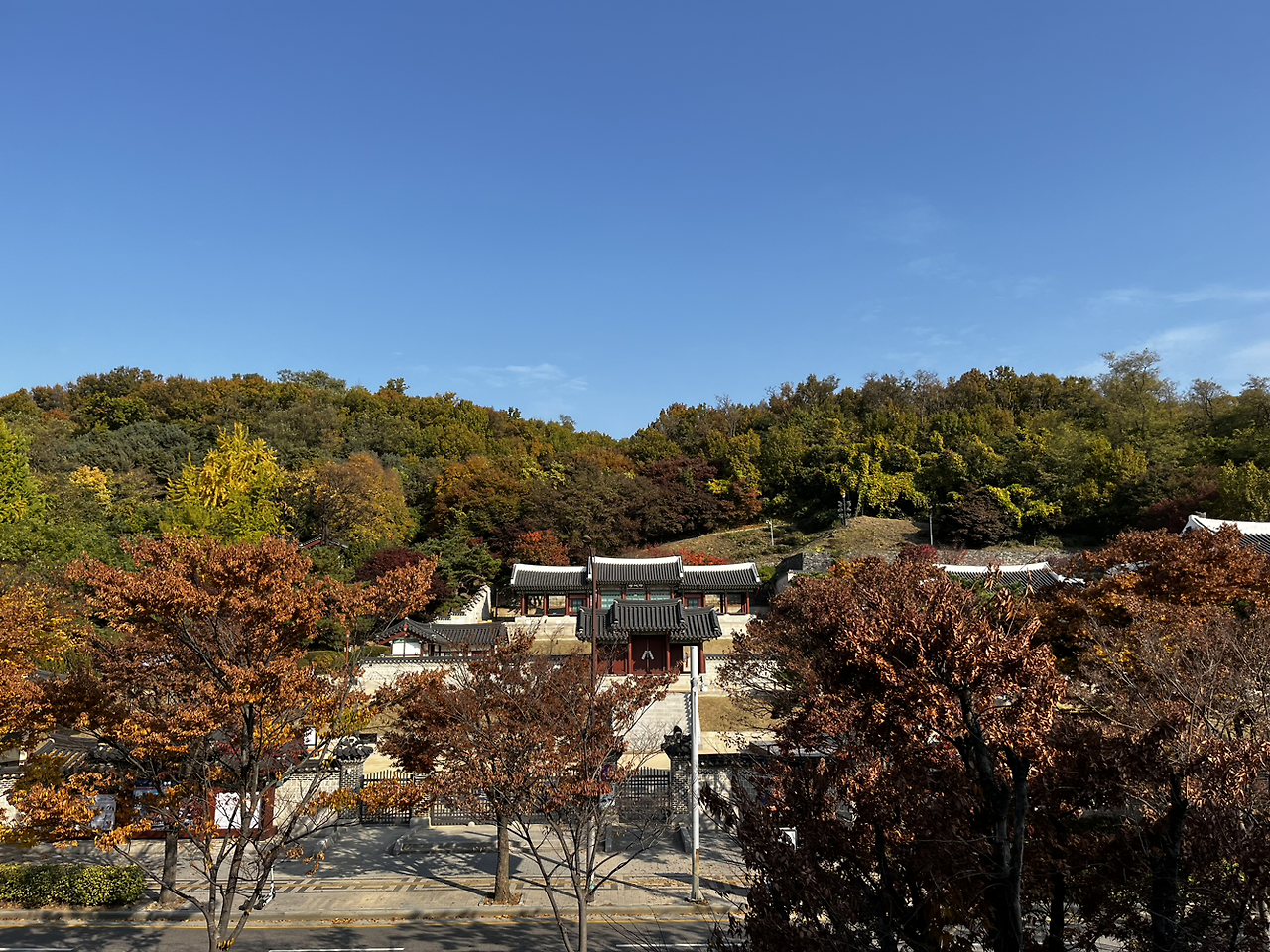 그러나 문을 열고 들어가니 평일 오전이라 그랬는지 사람이 많이 없어 다행이었다. 왠지 원하는 자리에 앉을 수 있을 것 같은 느낌이었다. 엄마와 나는 따뜻한 아메리카노와 브런치로 샌드위치, 달달한 무스케이크를 주문했다. 주문하고 난 후 주문이 밀려 시간이 좀 걸린다길래 먼저 올라가 자리를 잡으려고 우리가 앉으려 했던 2층 테라스로 달려갔다. 다행히 테라스석에 자리가 있었다. 우리가 앉으려 한 테라스석 자리는 탁 트인 뷰에 산에 둘러싸인 나뭇잎들이 색색깔로 물들어 있었으며 인천향교와 도호부청사를 감싸고 있는 풍경이 참 예뻤다. 이런 자리를 왜 아무도 안 앉고 있었지? 의아했었다.