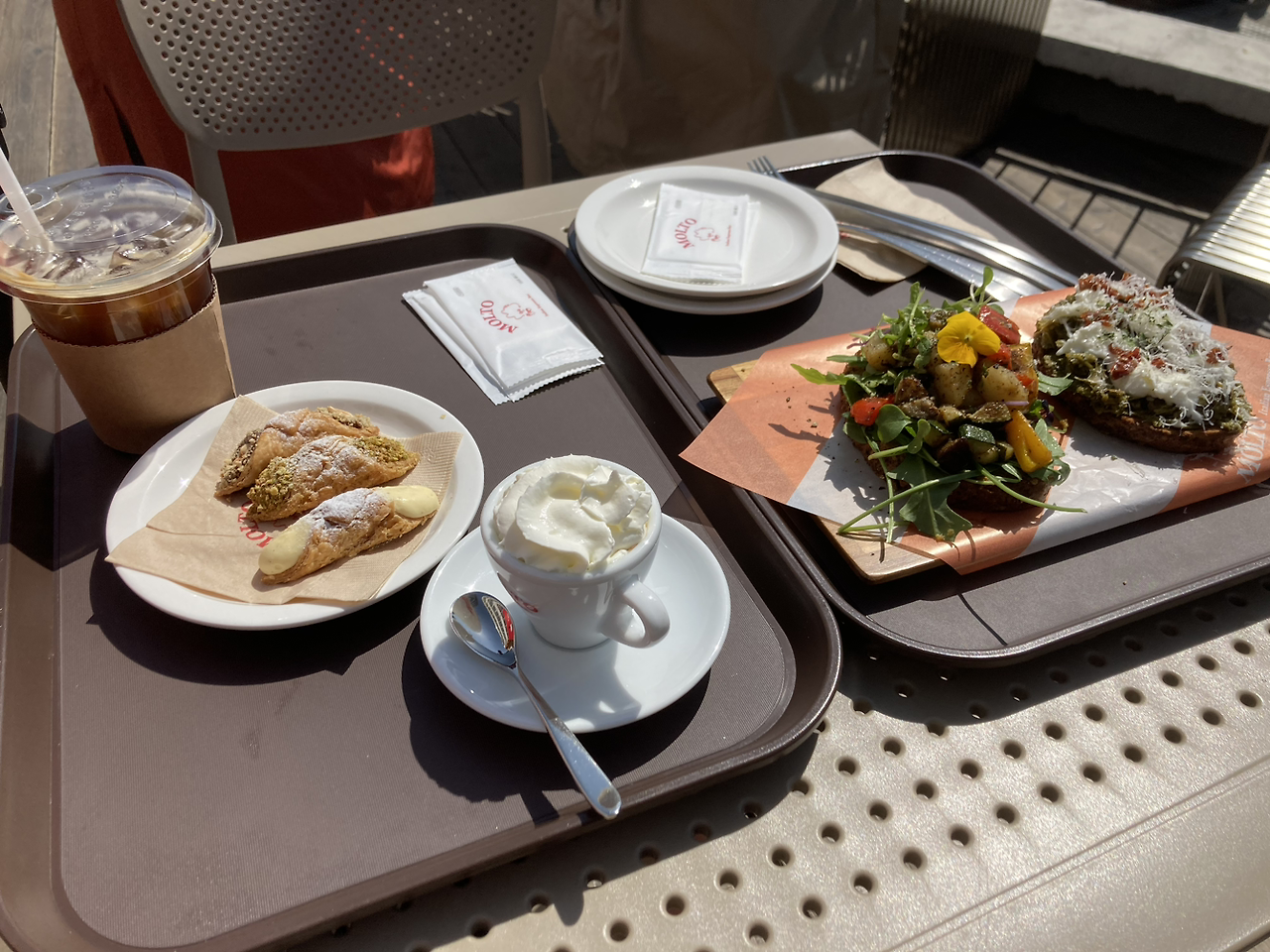 살레는 몰또의 대표적인 에스프레소 메뉴로 커피, 크림, 소금이 들어있어 숟가락으로 크림과 에스프레소를 같이 떠 마시면 된다. 소금이 있어 약간 짭조름한 맛이 일품이다. 지난번에는 아메리카를 드셨던 엄마도 이번에는 살레를 같이 드셔 보시라 주문을 해줬었는데 마치 달고나를 먹는 것 같다고 하셨다. 까논치니 세트는 피스타치오, 커스터드, 헤이즐넛 3가지 크림이 있었는데 달달함과 부드러움의 조화로 에스프레소와 잘 어울렸었다. 디저트인 까논치니 세트만 먹기에는 배를 채우기 충분하지 않을 것 같아 초코 헤이즐넛 크루아상을 같이 주문했었다. 제공해준 물티슈로 손을 닦고 손으로 찢어서 먹었는데 손에 초코가 묻어날 정도로 초코가 범벅이었던지라 달달했고 크루아상 또한 바삭한 식감을 자랑해 만족스러웠었다.
