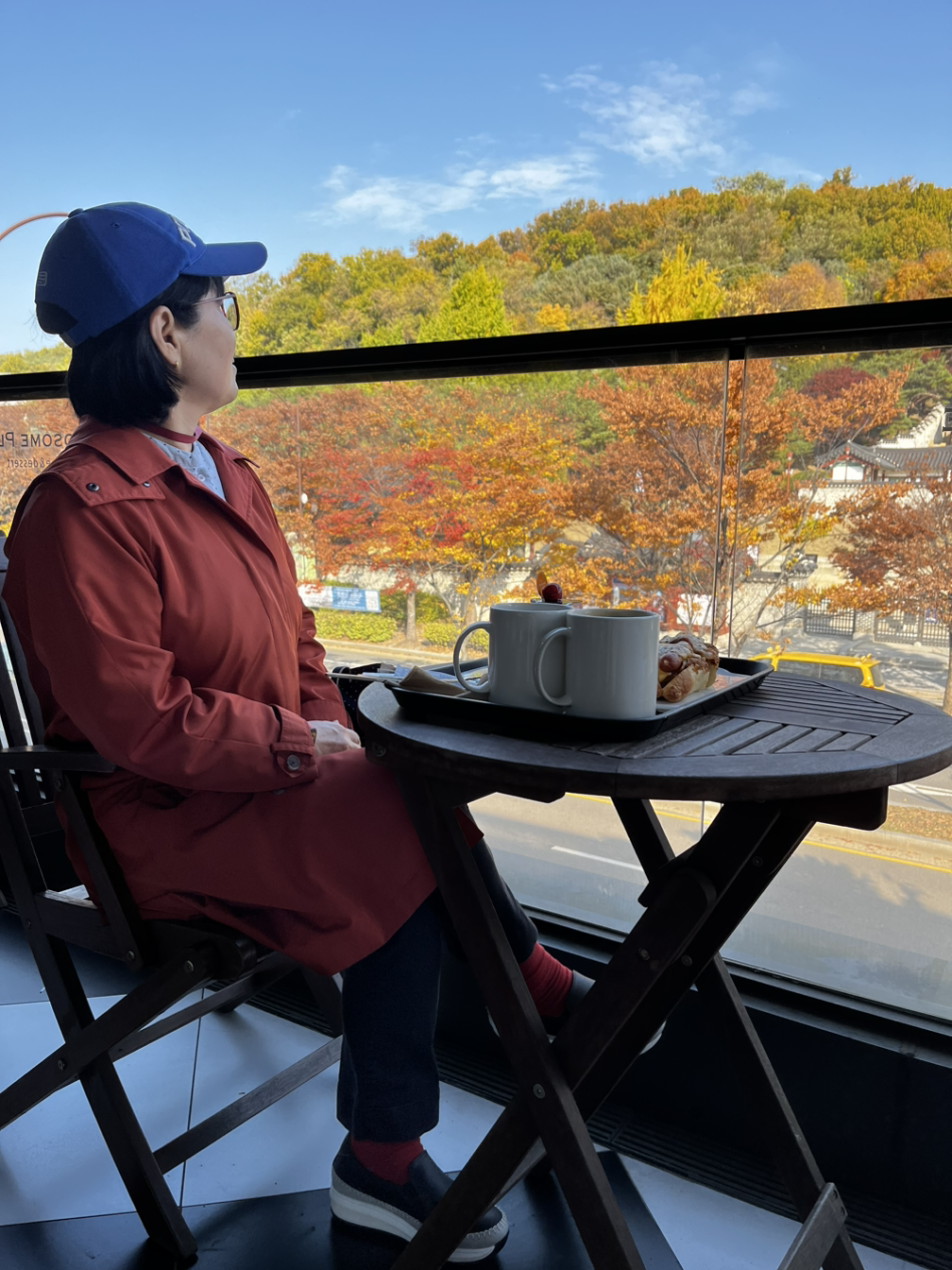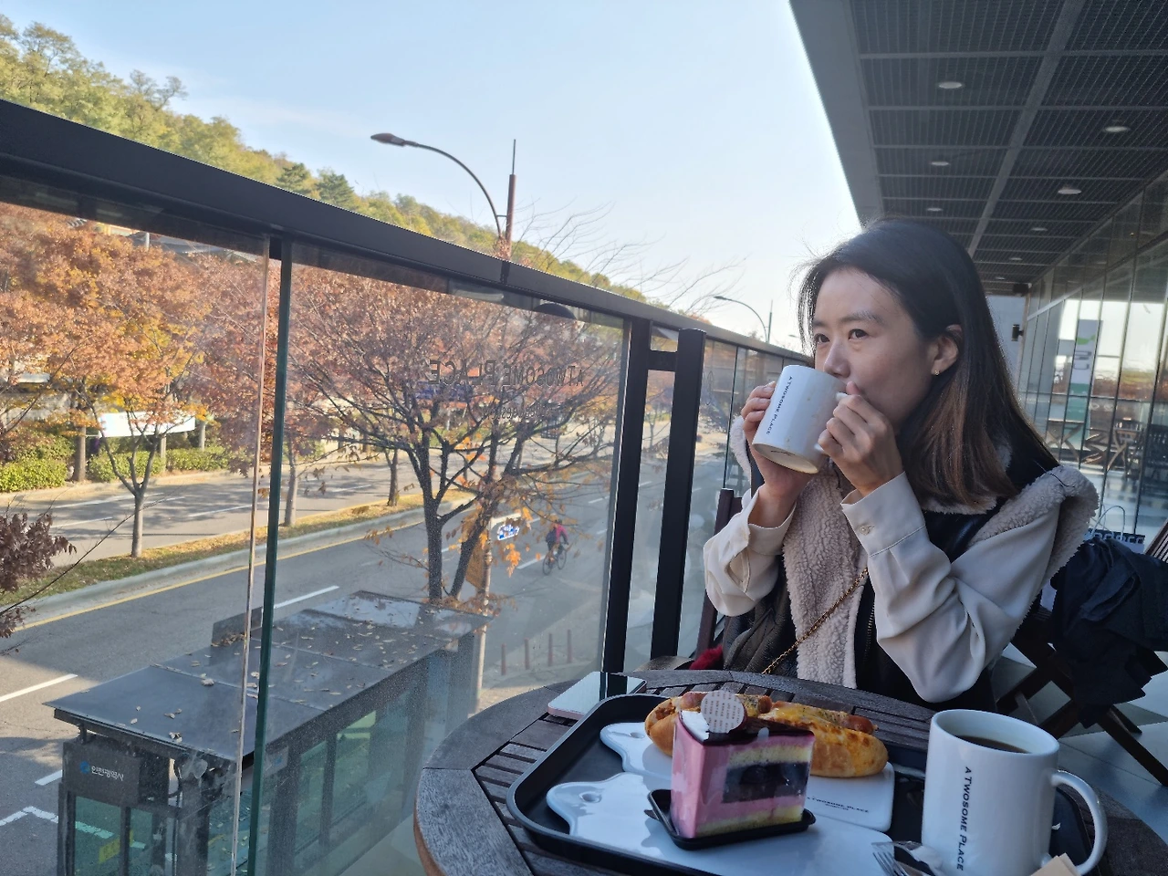 엄마도 아쉬워하셨다. 우리 모녀는 다음을 기약했다. 체인이라 어디든 있는 투썸플레이스 카페이기에 동네에도 물론 투썸플레이스 카페가 있다. 그러나 여기까지 와서 모처럼만에 단풍도 구경하고 바람도 쐬고 좋았었다. 엄마는 동네에는 건물에 둘러싸여 이런 산과 나무에 둘러싸인 뷰를 보기 힘들다고 하시며 이 정도의 뷰를 보기 위해 한 번씩 와봄직 하다고 하셨다. 잠깐이었지만 멀지 않은 곳에 산과 단풍을 보면서 맑은 공기를 느끼고 커피 한잔의 여유를 즐길 수 있었다는 게 좋았다. 나와 가장 친한 엄마와 말이다.