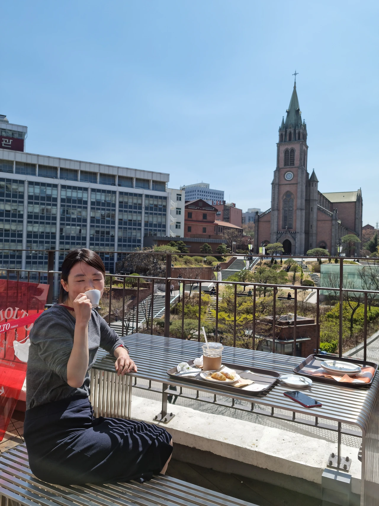 “그러게 말이야, 3층에 올라와봤었다면 여기 앉았을 텐데. 여기가 더 좋다 “