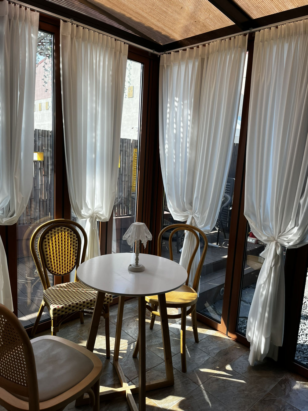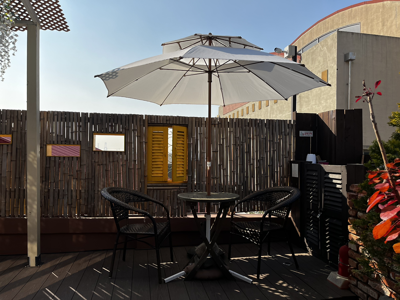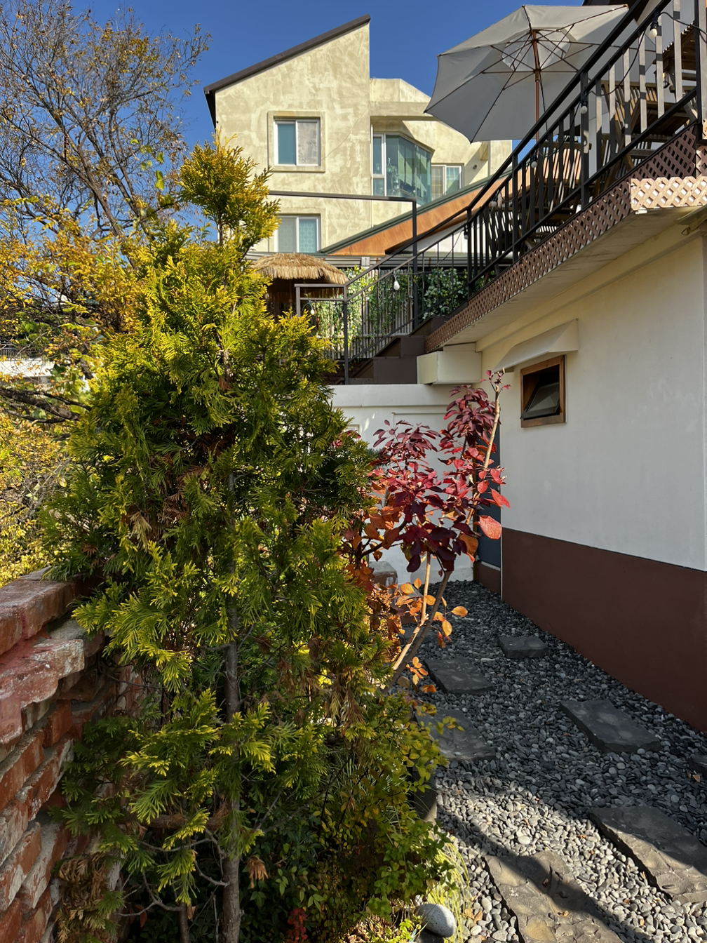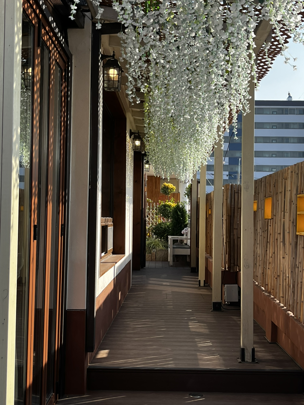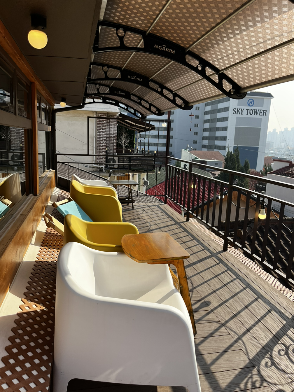 다른 메뉴로 주문을 한 후 자리를 잡기 위해 카페를 둘러봤다. 둘러볼 때마다 앉고 싶은 자리가 계속 바뀌는 건 뭘까? 어느 자리에 앉던지 후회하고 싶지 않았다. 고심 끝에 앉은 우리의 자리는 날씨가 춥지 않아 카페 1층 외부에 한 고즈넉한 자리였다. 2층으로 올라가는 길도 가까웠고, 앉았을 때 바깥 통로의 천장에 하얀 꽃장식도 보여 눈이 즐거웠다. 2층에 앉을 건 아니었지만 구경을 한번 해 보고 싶은 마음에 2층도 올라가서 구경하고 왔는데 어디서든 1층이 통할 수 있게 통로를 많이 만들어두셨었다. 그래서 통로를 찾아가는 재미도 쏠쏠했었다. 카페 구석구석을 탐색하고 자리로 돌아오니 진동벨이 울렸다.