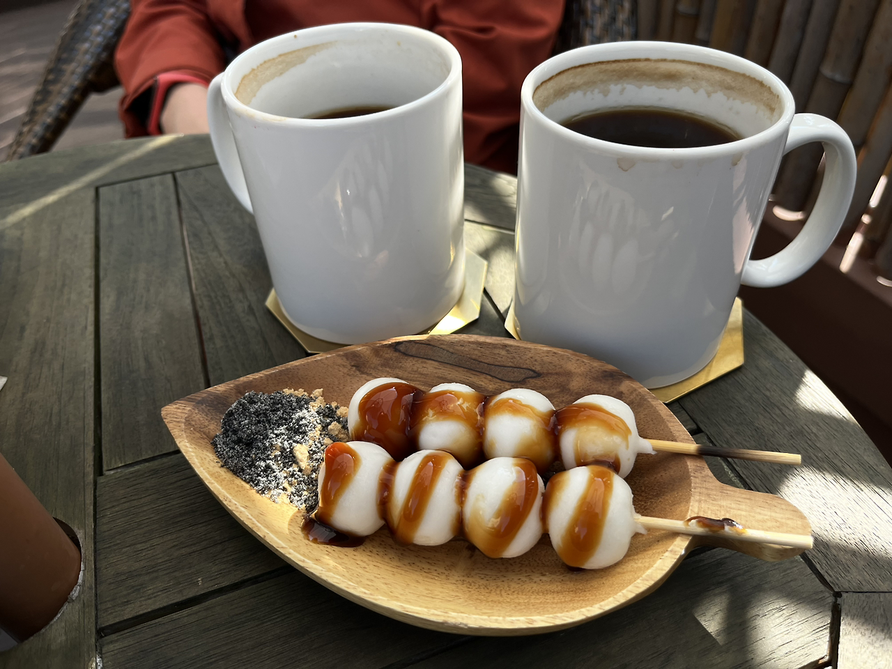 우리가 주문했던 메뉴는 따뜻한 커피 2잔과 크림 도지마롤 케이크 그리고 앙증맞았던 앙버터 팬케이크. 따뜻한 커피는 우리가 특별히 주문했던 것도 아니었는데 마시기 딱 좋은 온도에 마시기 딱 좋은 농도였다. 만족스러웠다.