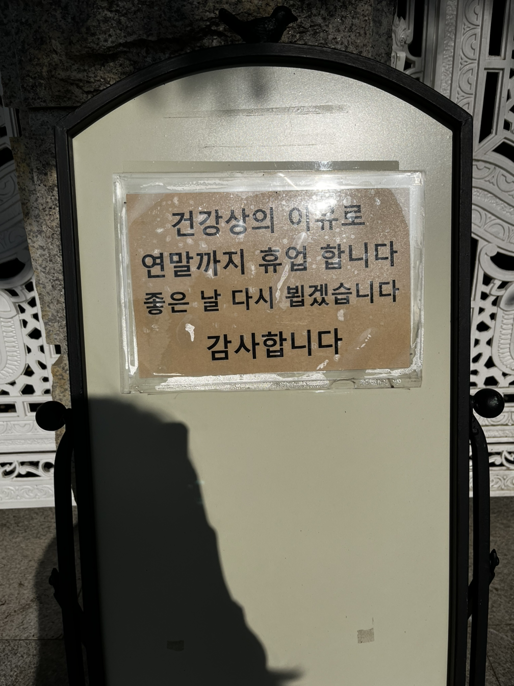 집으로 돌아가기 전, 영업을 중단했다는 카페인 <카페 보눔>을 찾아가 봤다. 카페 뒷길을 먼저 찾아갔는데 규모가 정말 컸던 게 놀라웠었다. 정문을 찾아갔더니 영업을 중단했다는 팻말이 보였다. 건강상의 이유로 중단하셨다는데 건강을 회복하셔서 꼭 다시 돌아오셨으면 한다.