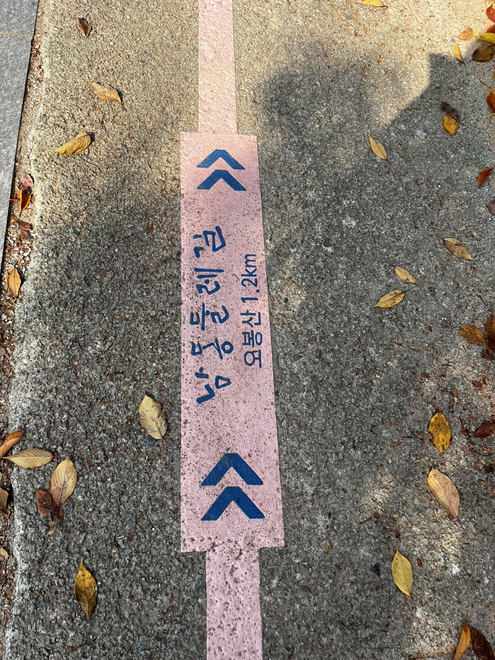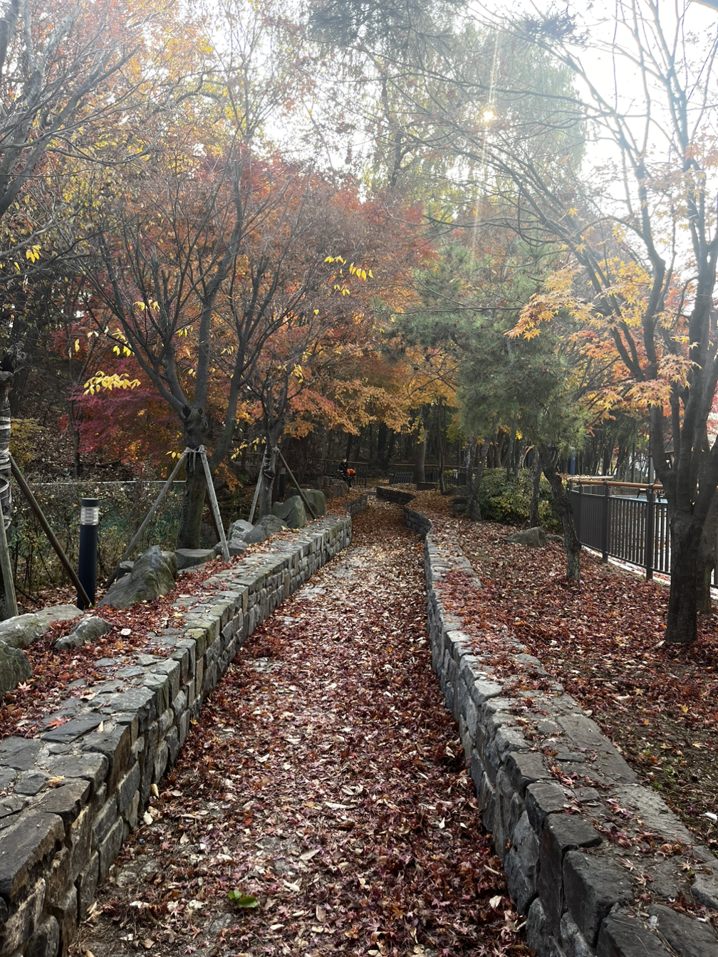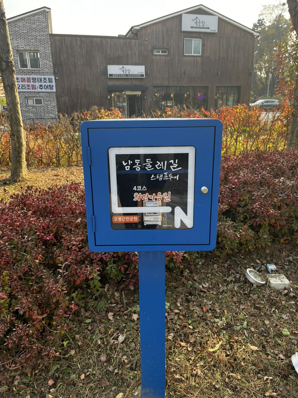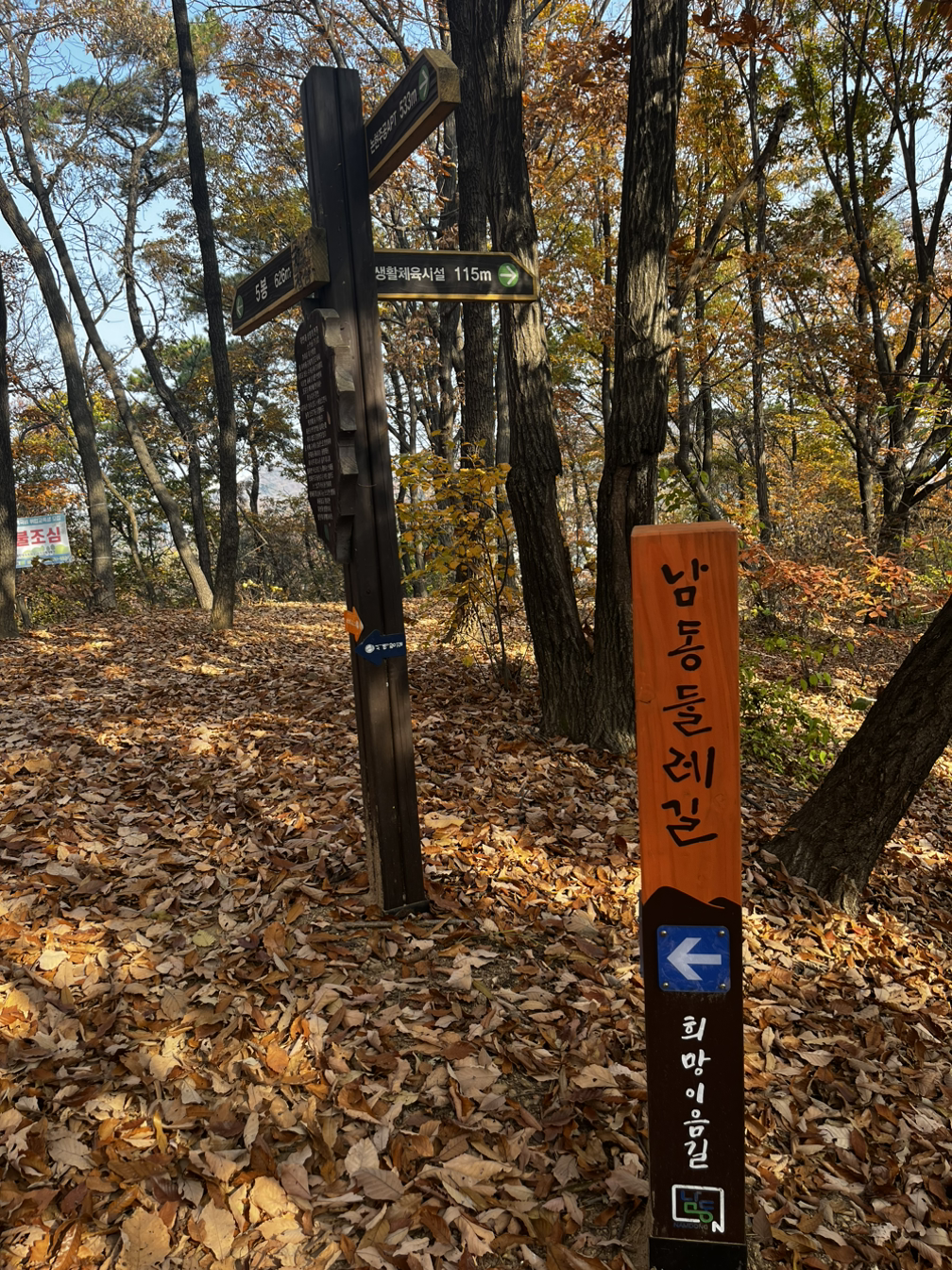 오봉산까지 하산하면 오봉 근린공원이 나오는데 오봉 근린공원 앞에 남동 둘레길 4개의 코스의 마지막 스탬프를 찍는 곳이 보였다. 스탬프를 쾅 찍고 오봉 근린공원을 조금 걸었다. 오봉 근린공원에는 남녀노소 각기 모여 놀고 있었다. 오봉 근린공원에 낙엽이 흐드러져있는 길이 참 예뻤다.