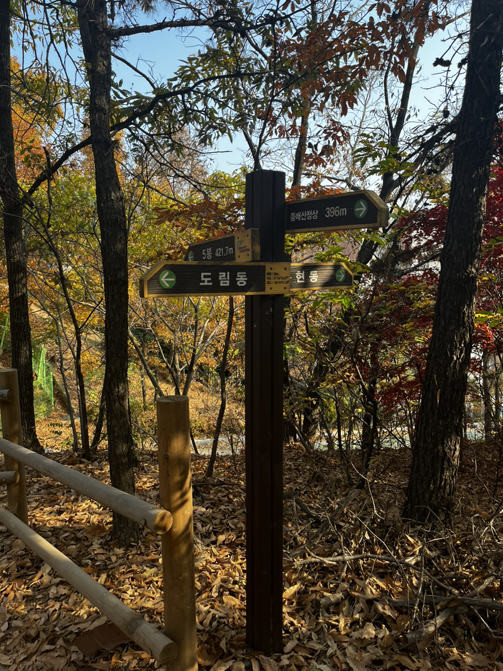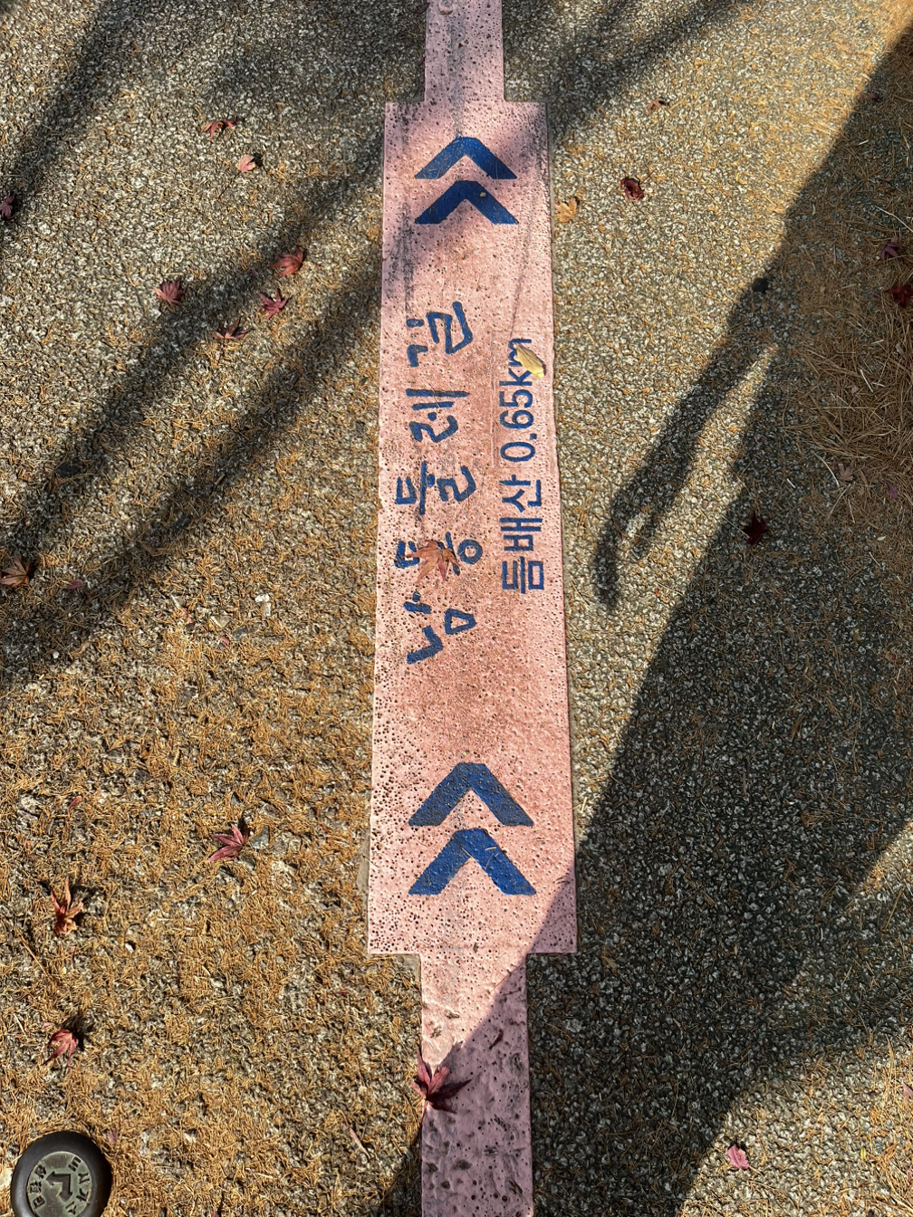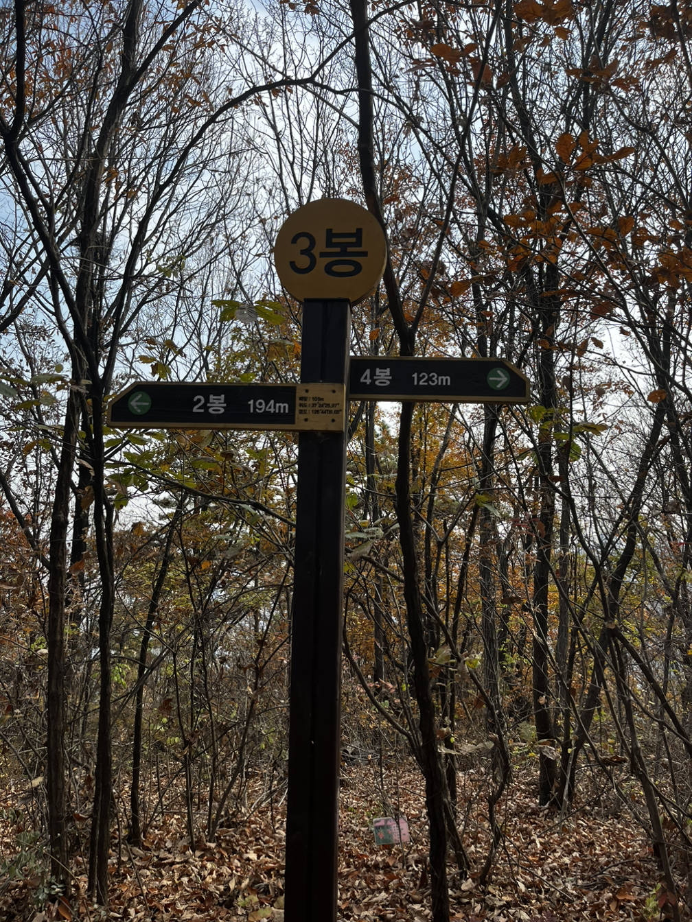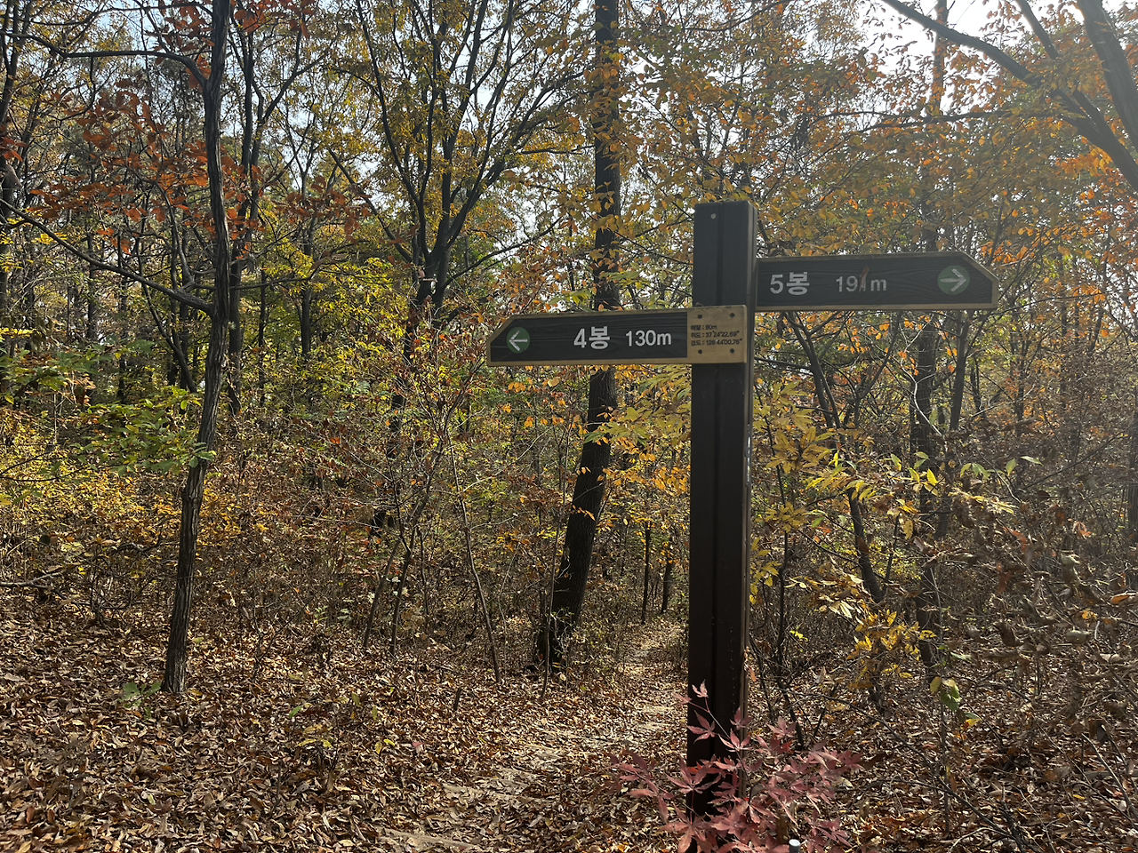 주택단지를 지나 산길로 이어지는 계단을 오르며 자연스레 산을 올랐다. 낙엽이 떨어진 산길은 구경거리도 많고 아름다웠지만, 미끄러워서 자칫 발을 헛디디면 미끄러져 심하게 다칠 수 있는 상황이었다. 조심조심 오르다 보니 듬베산 정상에 도착을 했다. 인증석은 따로 없었는데 누군가가 친절하게 <듬베산 정상>이라고 사인펜으로 써두었다. 누가 써두었을까? 기분 좋게 내려와서 듬베산에서 이어지는 오봉산으로 향했다.