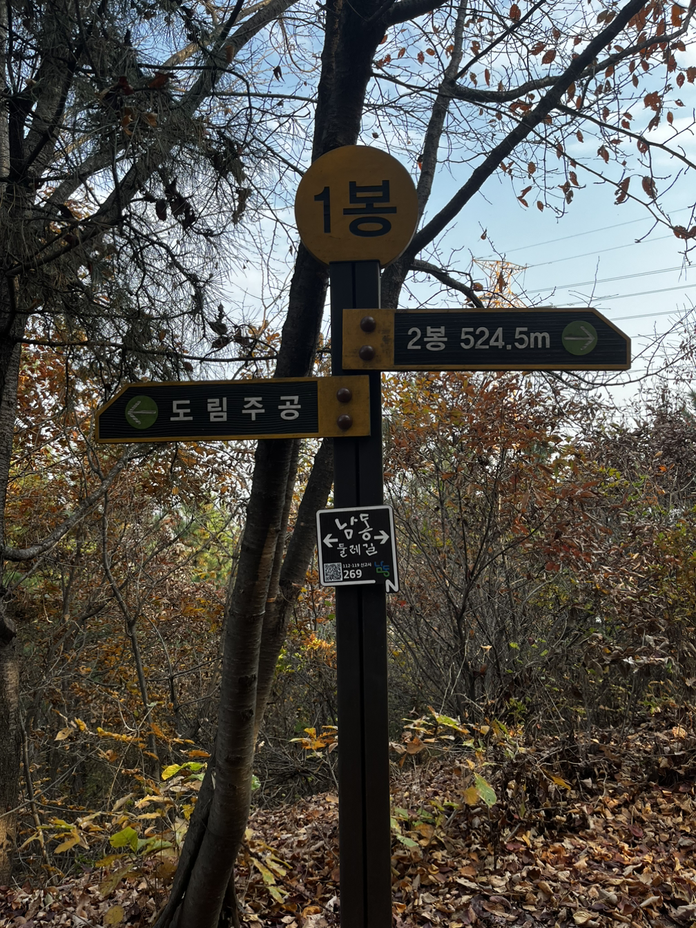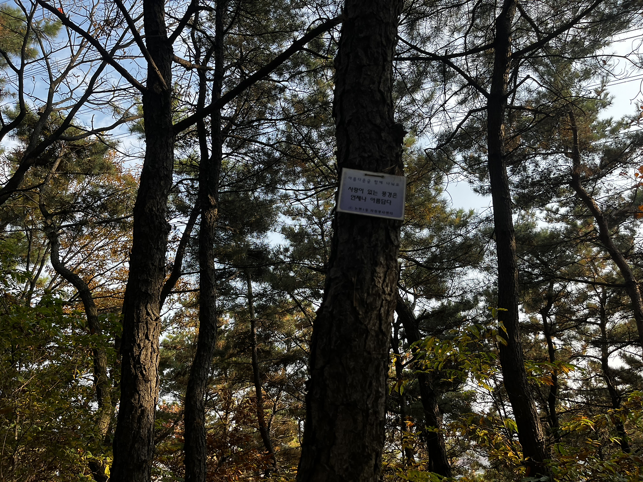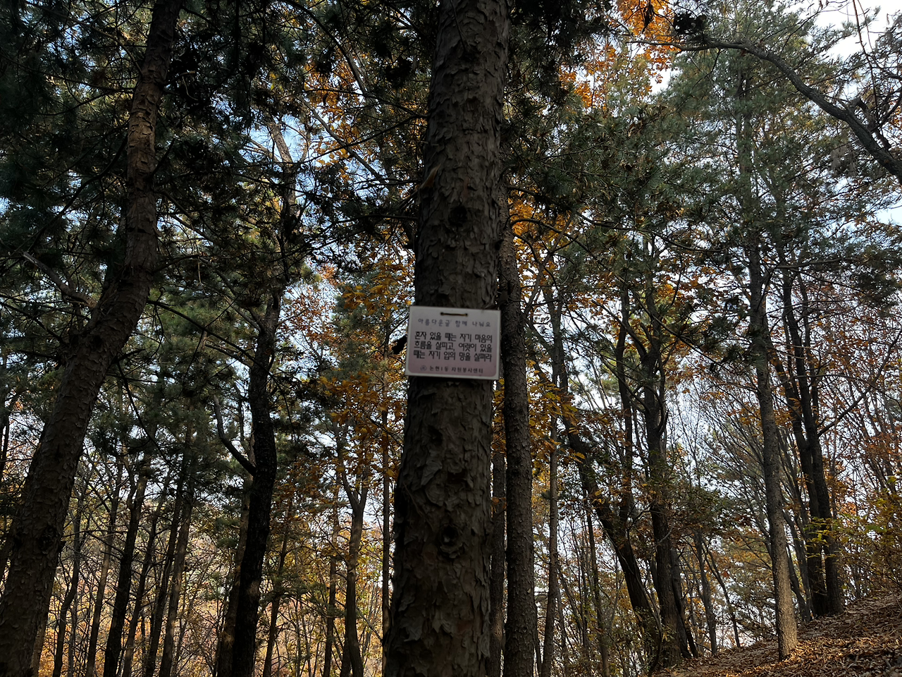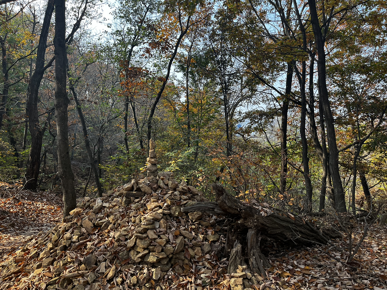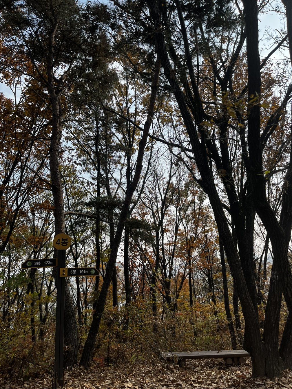 주택단지를 지나 산길로 이어지는 계단을 오르며 자연스레 산을 올랐다. 낙엽이 떨어진 산길은 구경거리도 많고 아름다웠지만, 미끄러워서 자칫 발을 헛디디면 미끄러져 심하게 다칠 수 있는 상황이었다. 조심조심 오르다 보니 듬베산 정상에 도착을 했다. 인증석은 따로 없었는데 누군가가 친절하게 <듬베산 정상>이라고 사인펜으로 써두었다. 누가 써두었을까? 기분 좋게 내려와서 듬베산에서 이어지는 오봉산으로 향했다.